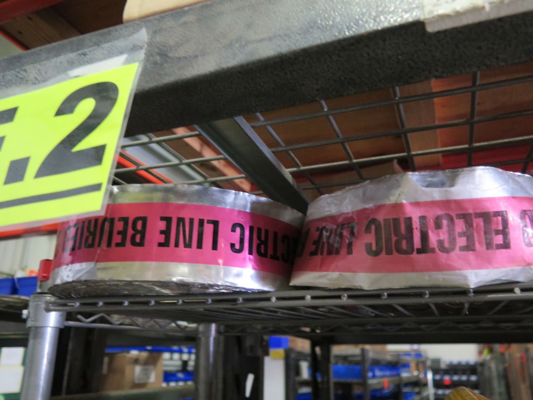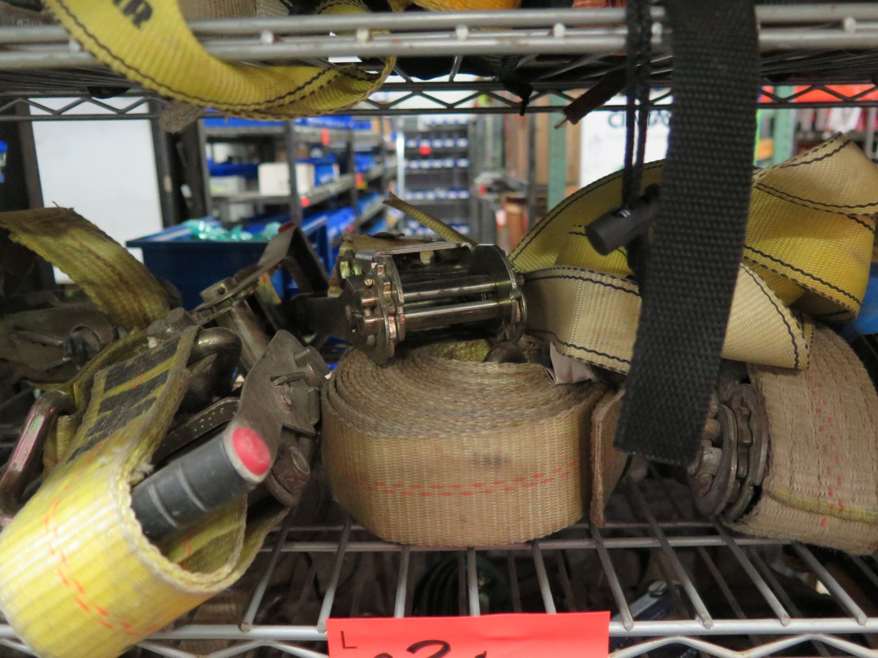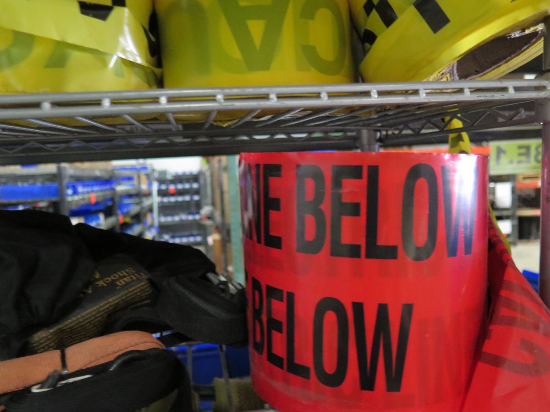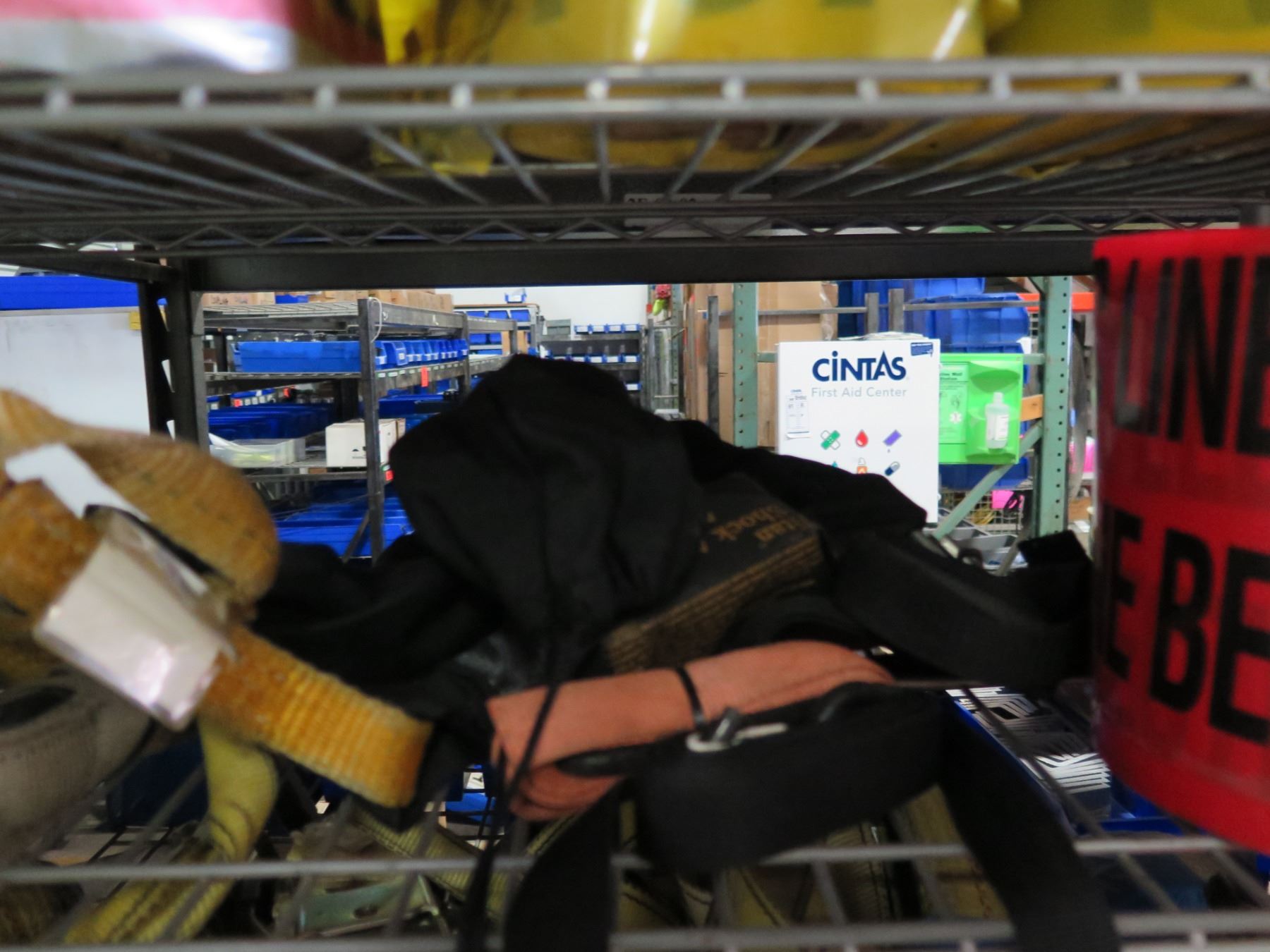 Shelving Unit and Contents: Ratchet Straps, Caution Tape, etc