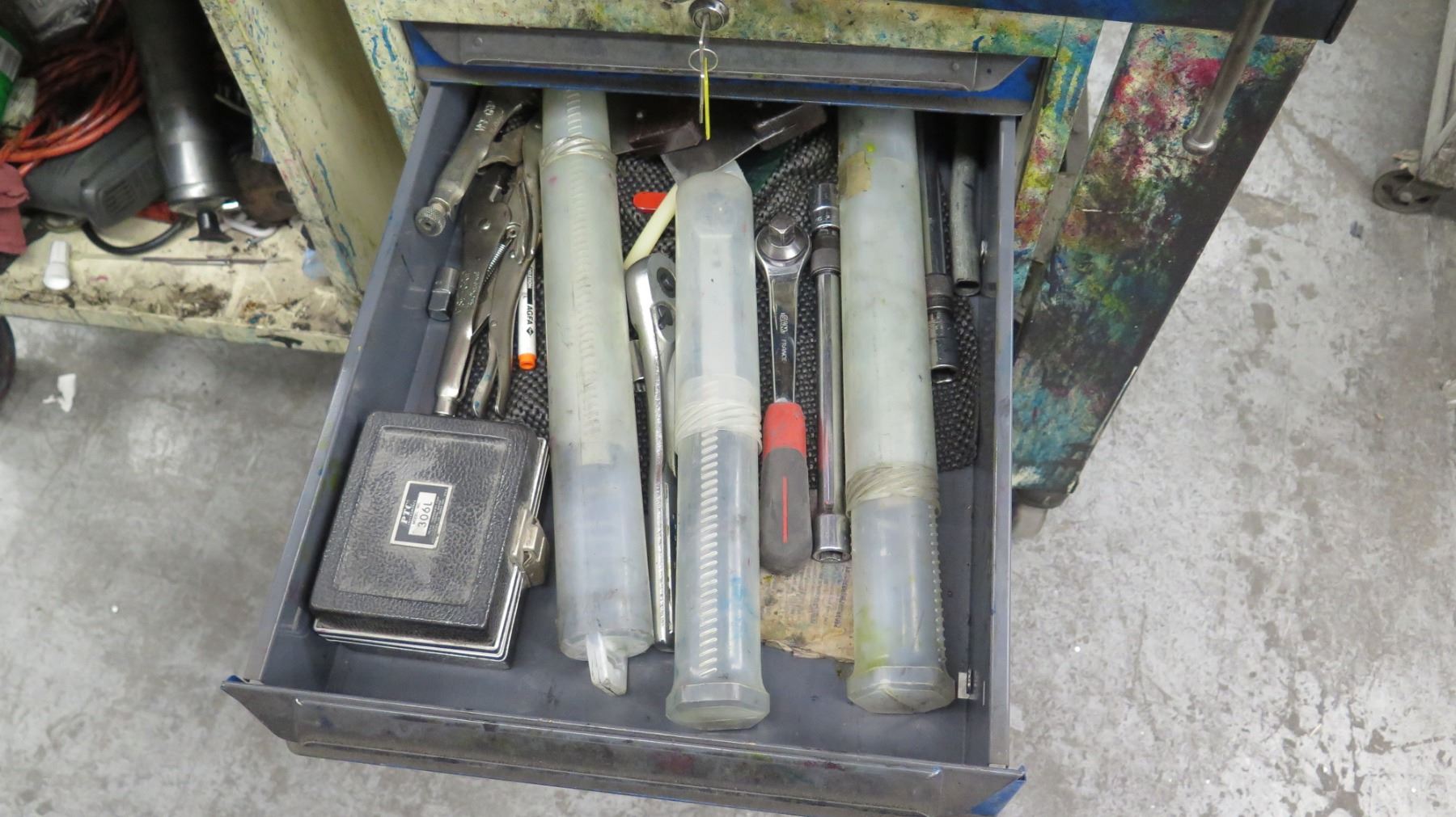 Shop Desk Work Table w/ Socket Set, Clamps, Power Strips, Misc Tools