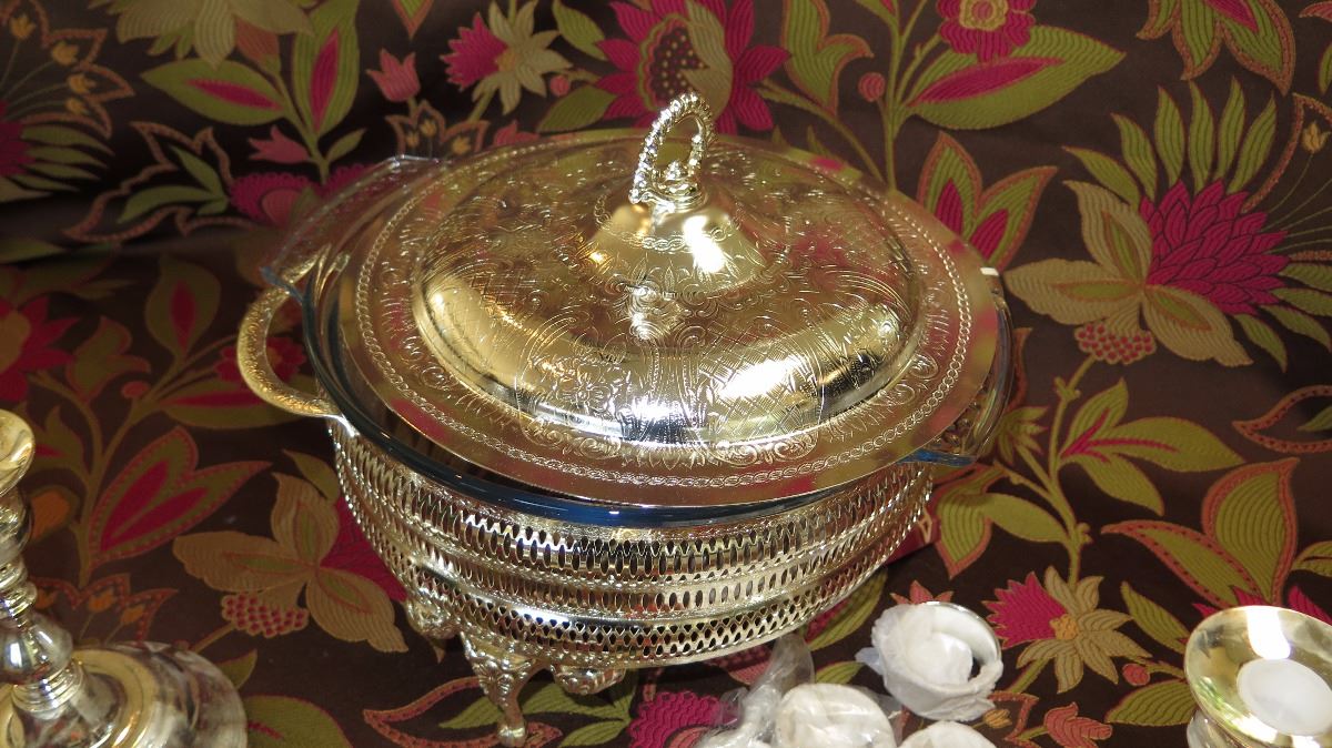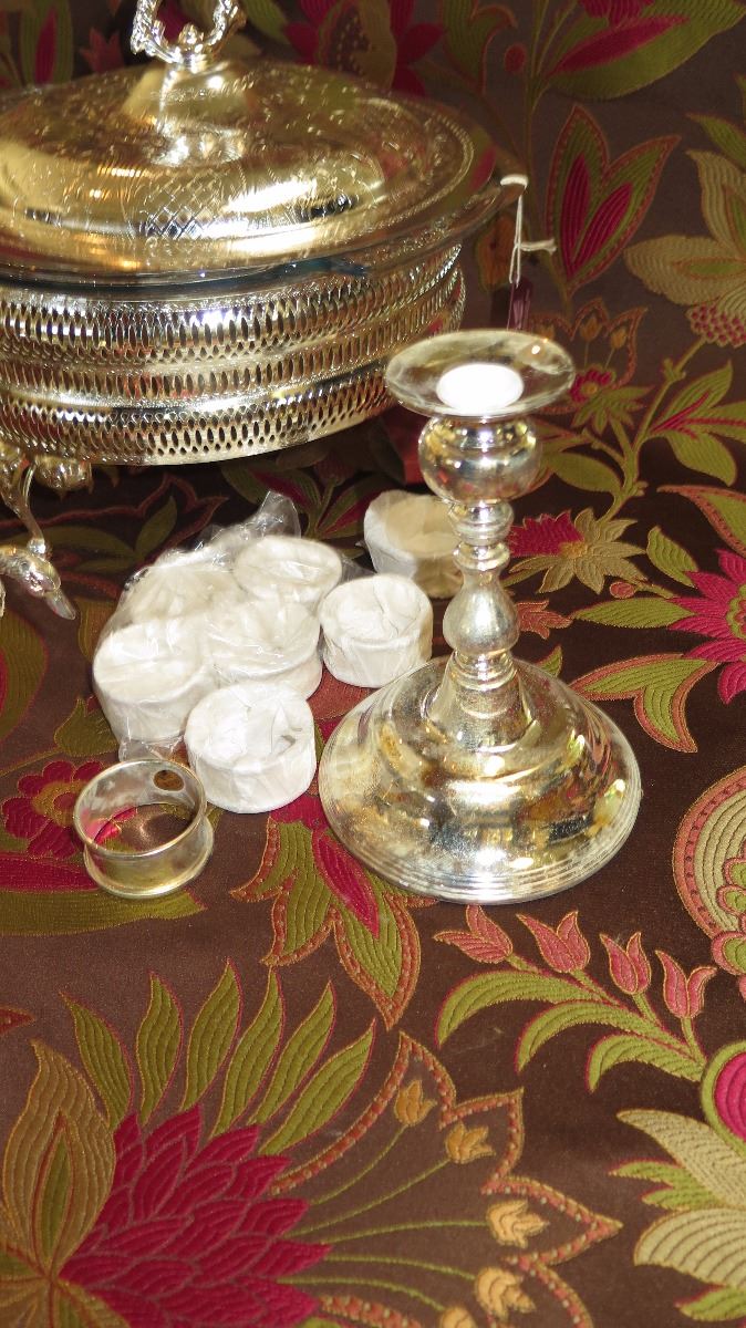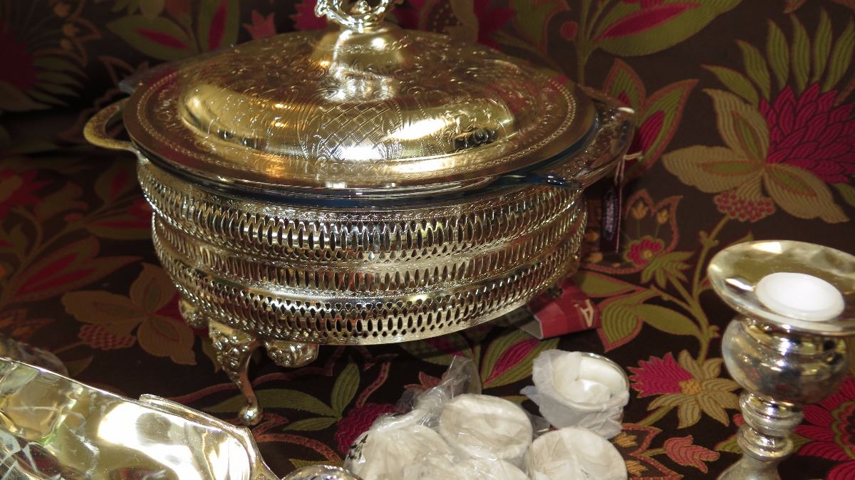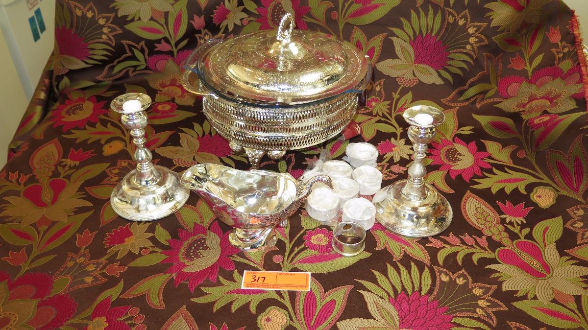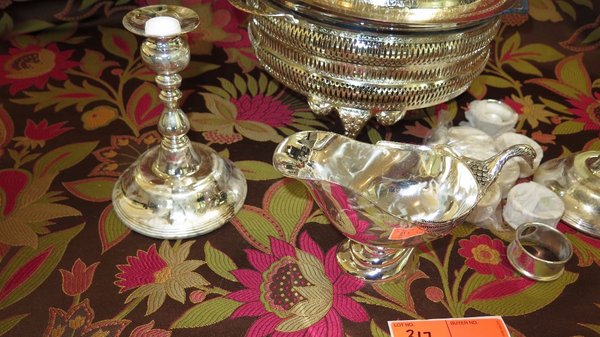 Silver Plated Server, Pair Candlesticks, Gravy Boat, 8 Napkin Rings