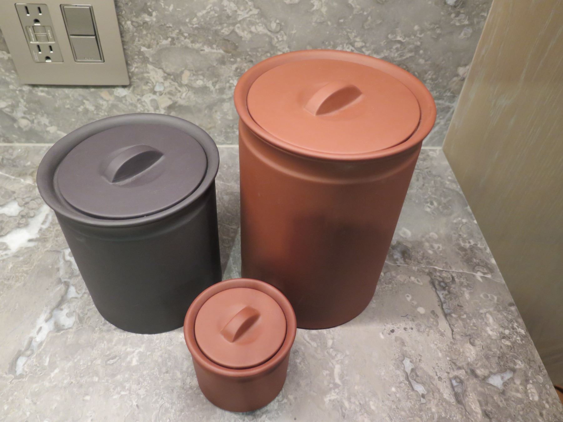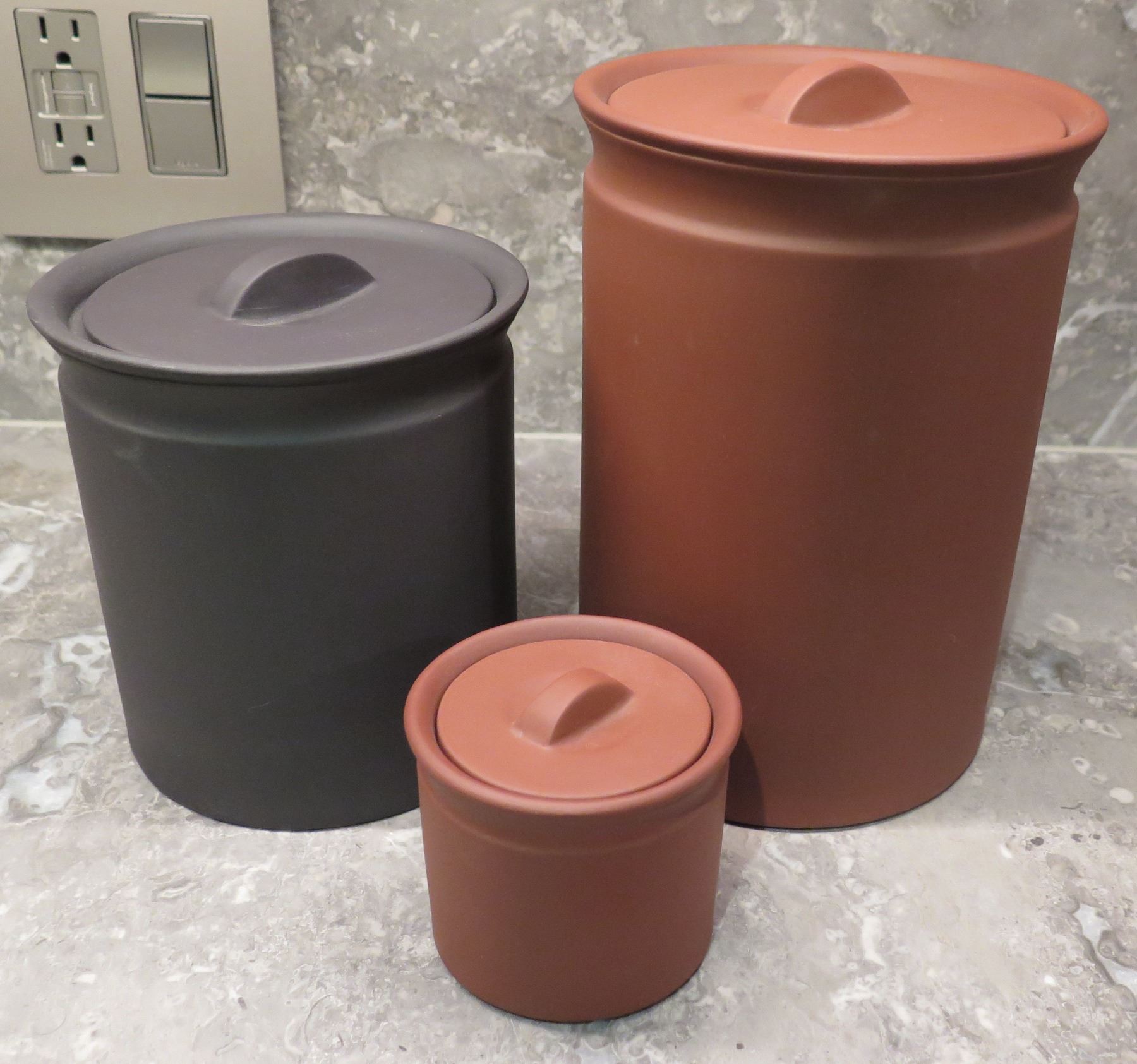 Sir|Madam Ceramica Pots w/ Lids: 1 Black & 2 Terra-Cotta Color, Misc Size