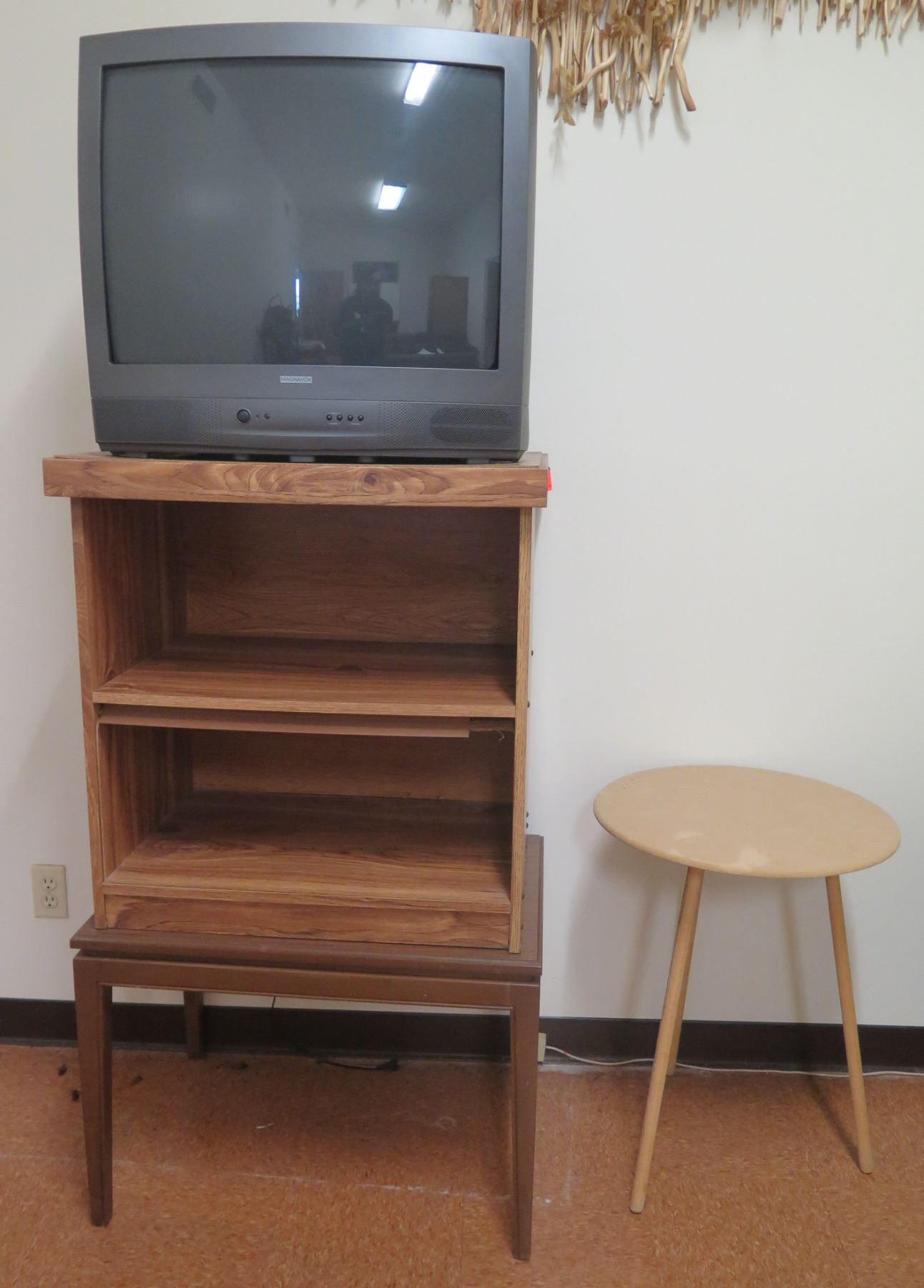 Small Square Table, Round Wood Stool, 2 Tier End Table & Magnavox TV