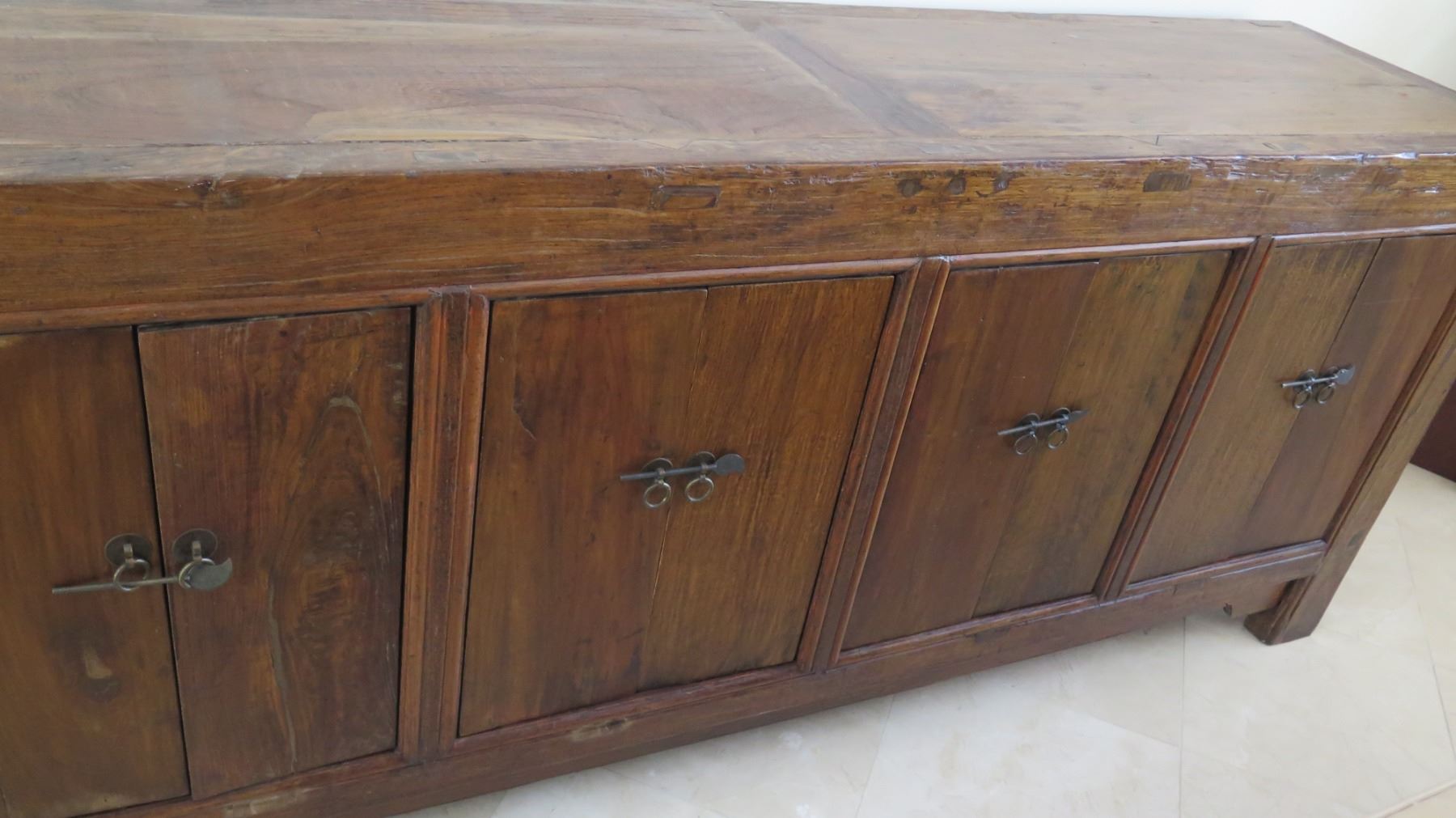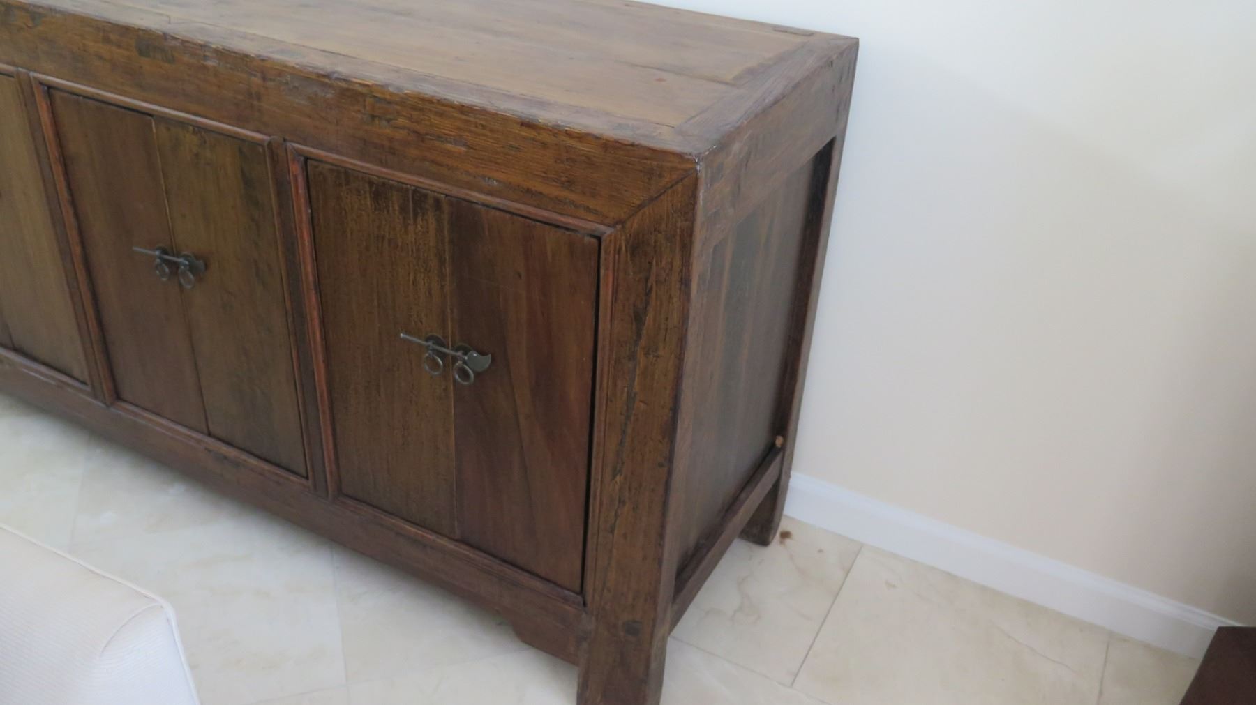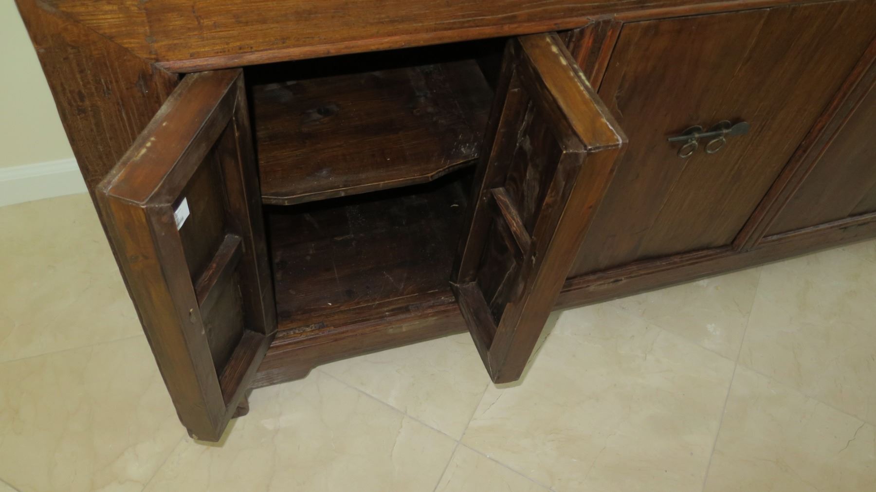 Solid Dark Wood Sideboard Cabinet Approx. 6'6 x 20" x 33" H (some damage-see last pictures), may have bugs or may have had bugs at one time.