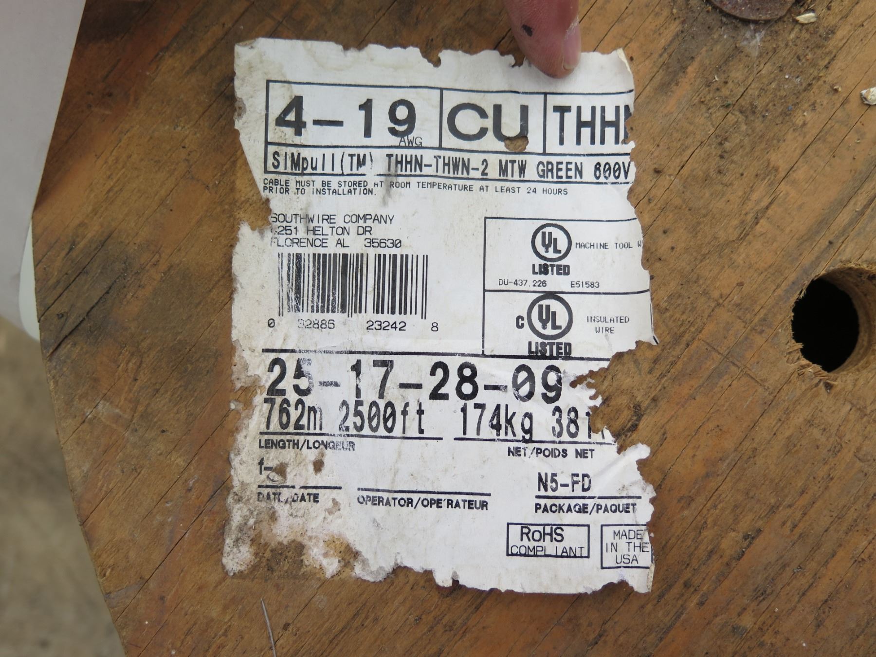 Spool Green 4-19 SIMpull THHN-THWN-2 600V Cable
