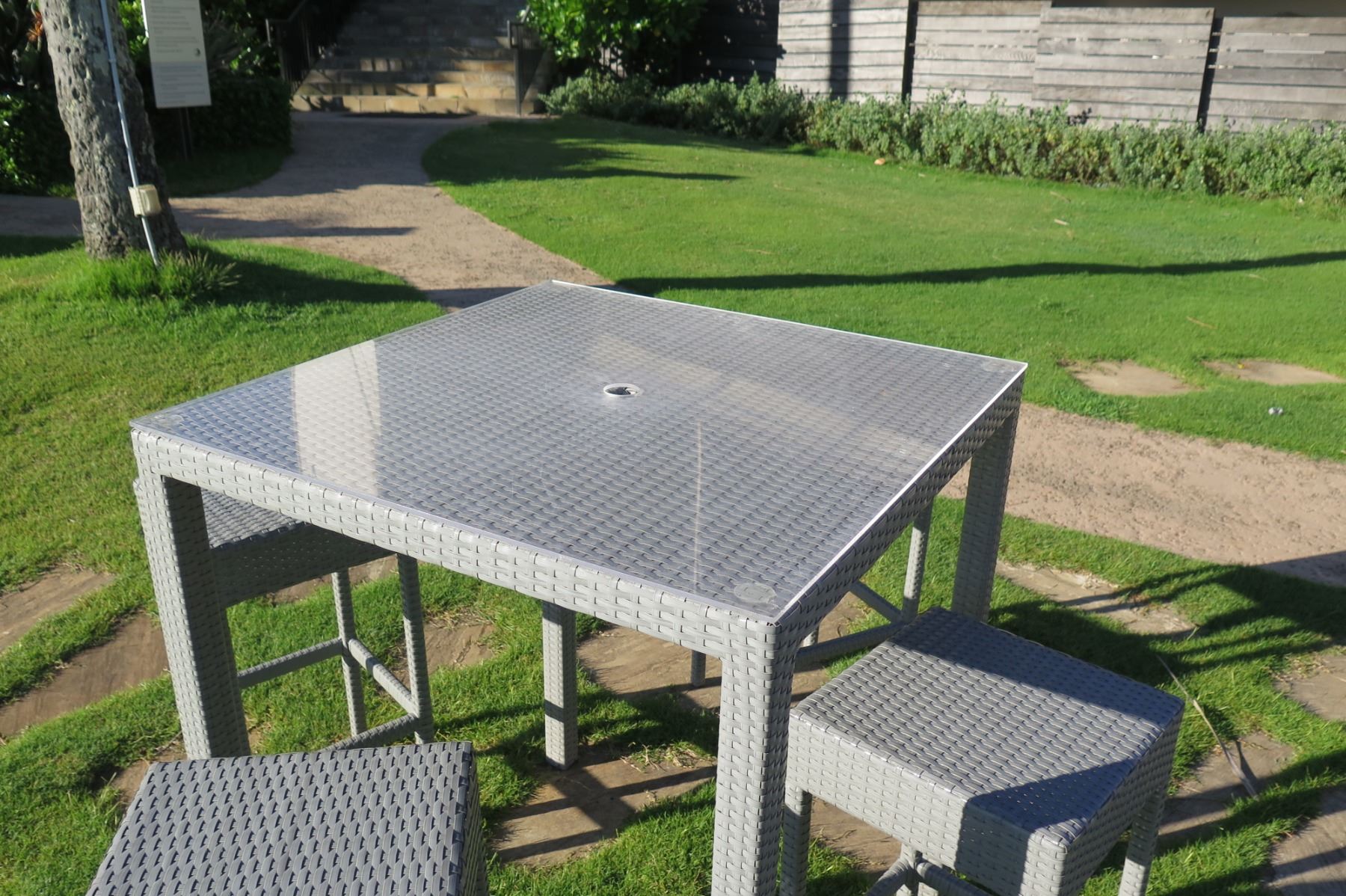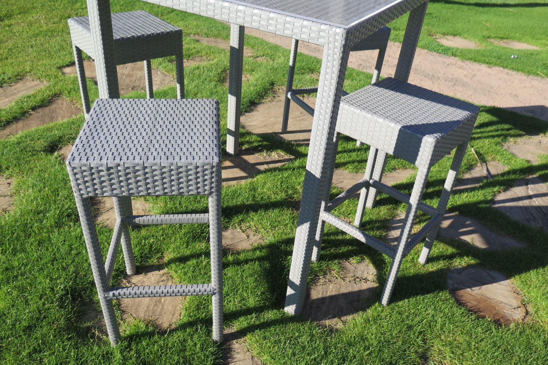 Square Gray Bar-Height Table 36"x36"x43"H & 4 Stools, Woven Synthetic Material (No Plexiglass Top)