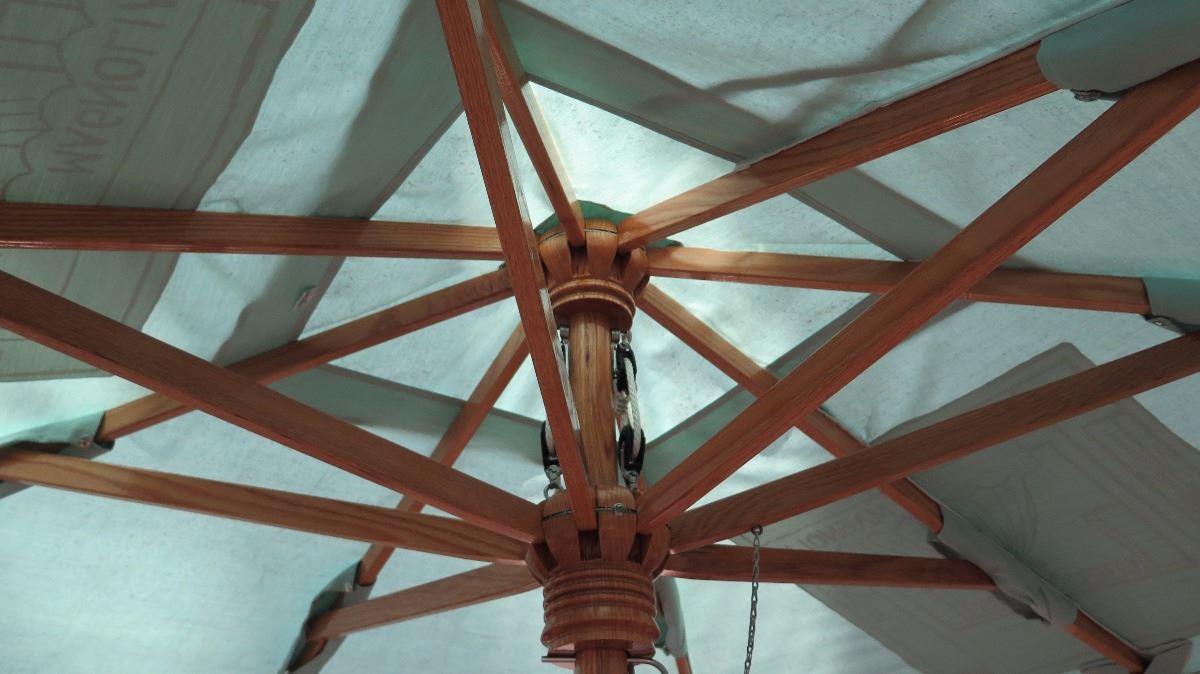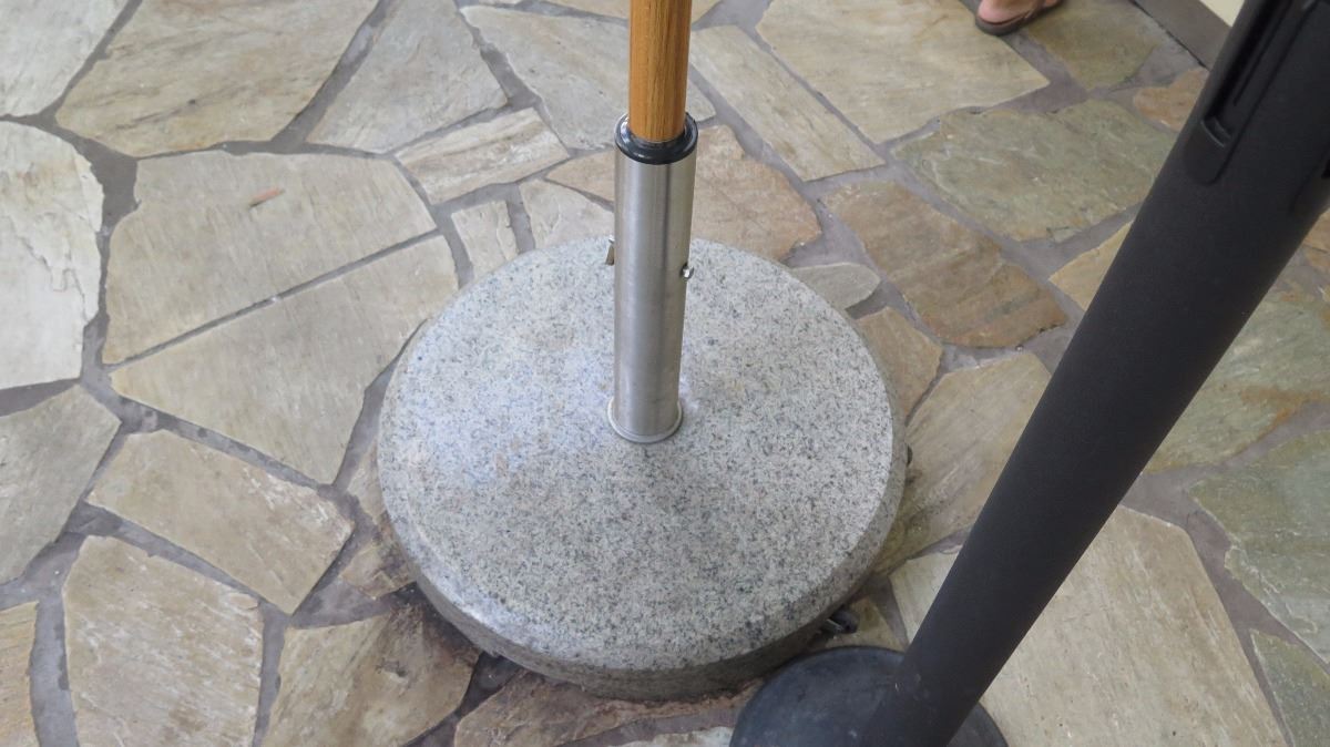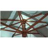 Square Lt Blue Canvas Patio Umbrella w/ Solid Stand, Solid Oak Frame, Pulley System, Granite Base. Heavy duty commercial market umbrella from Tropical J. 7' square. Sunbrella fabric. Harken yacht quality pulley system. Was purchased for $1521 each.