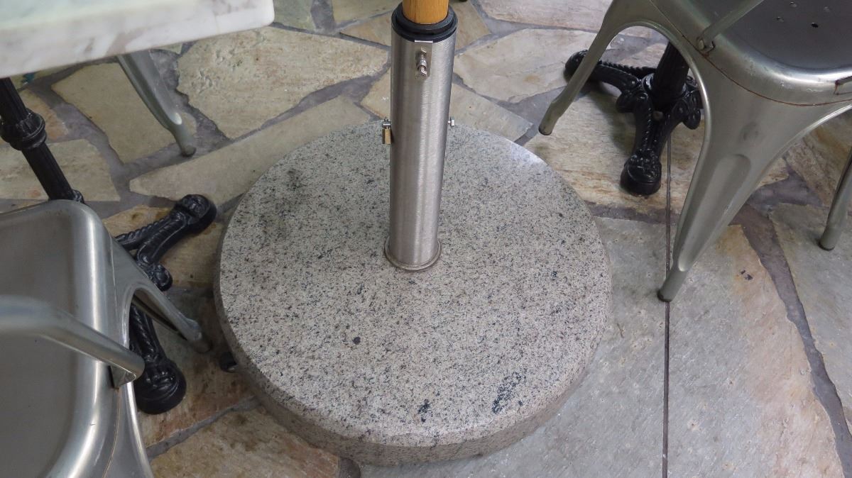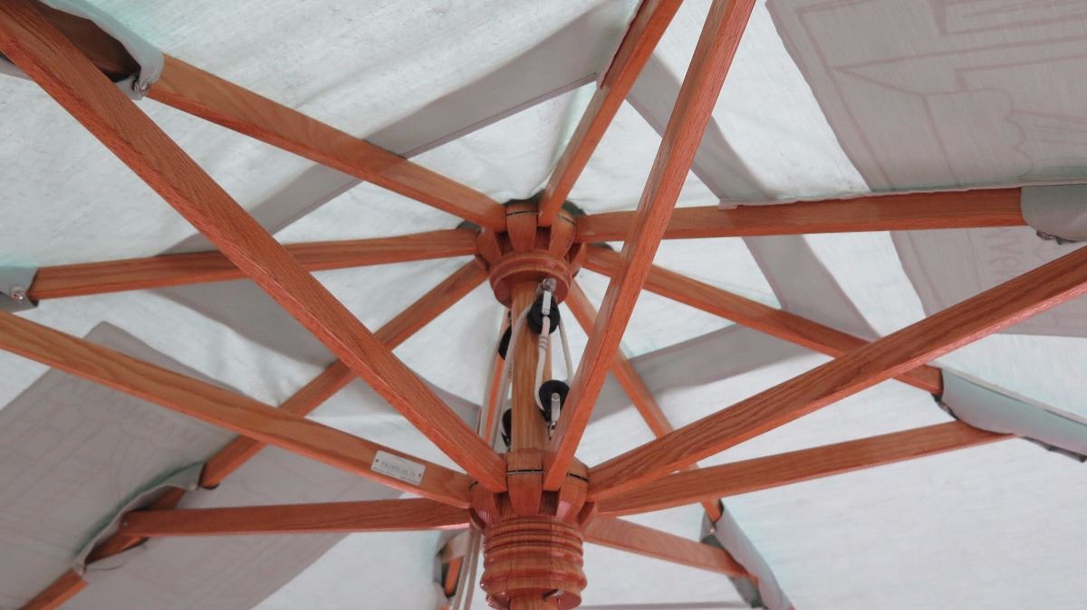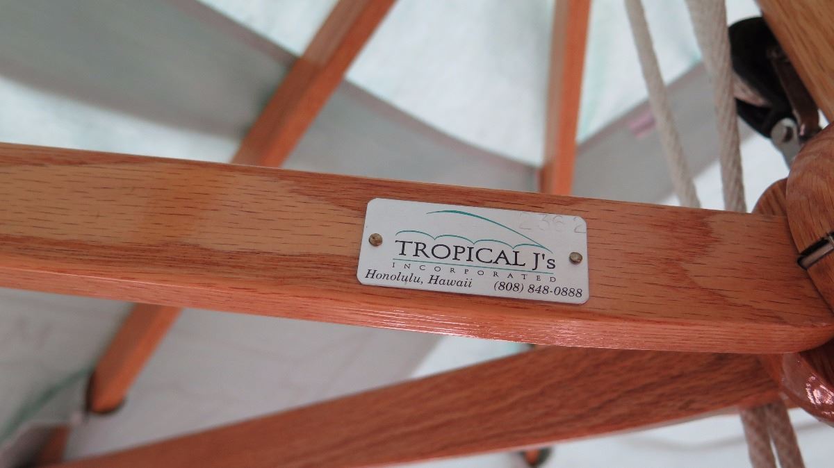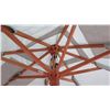 Square Lt Blue Canvas Patio Umbrella w/ Solid Stand, Solid Oak Frame, Pulley System, Granite Base. Heavy duty commercial market umbrella from Tropical J. 7' square. Sunbrella fabric. Harken yacht quality pulley system. Was purchased for $1521 each.