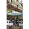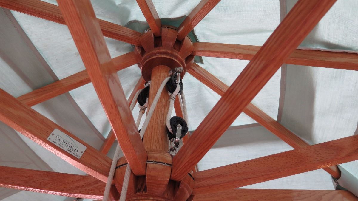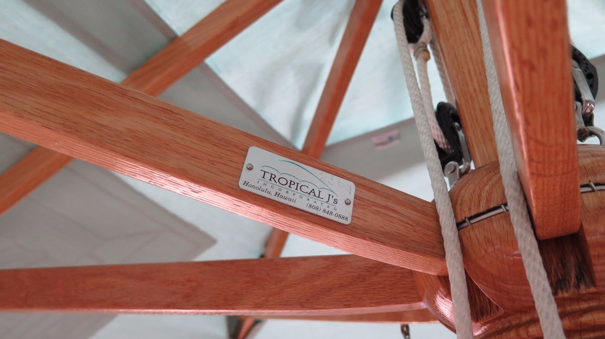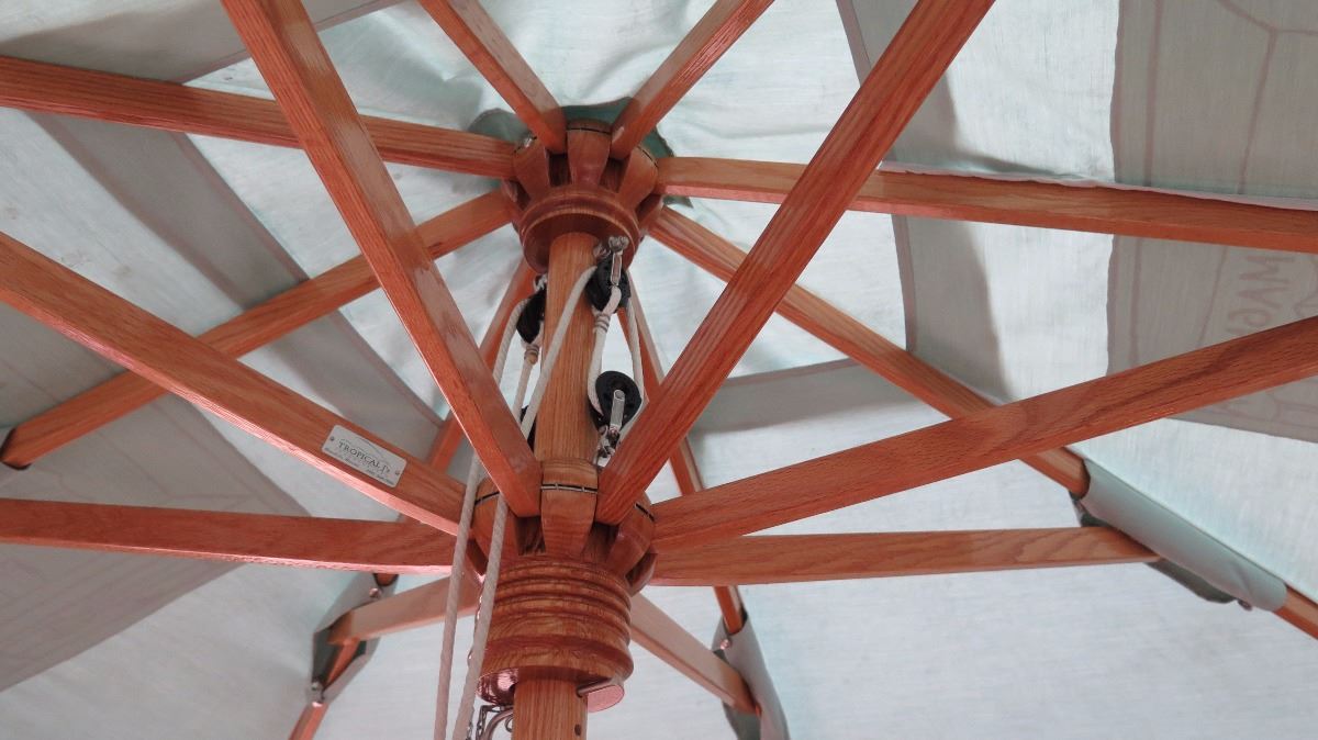 Square Lt Blue Canvas Patio Umbrella w/ Solid Stand, Solid Oak Frame, Pulley System, Granite Base. Heavy duty commercial market umbrella from Tropical J. 7' square. Sunbrella fabric. Harken yacht quality pulley system. Was purchased for $1521 each.