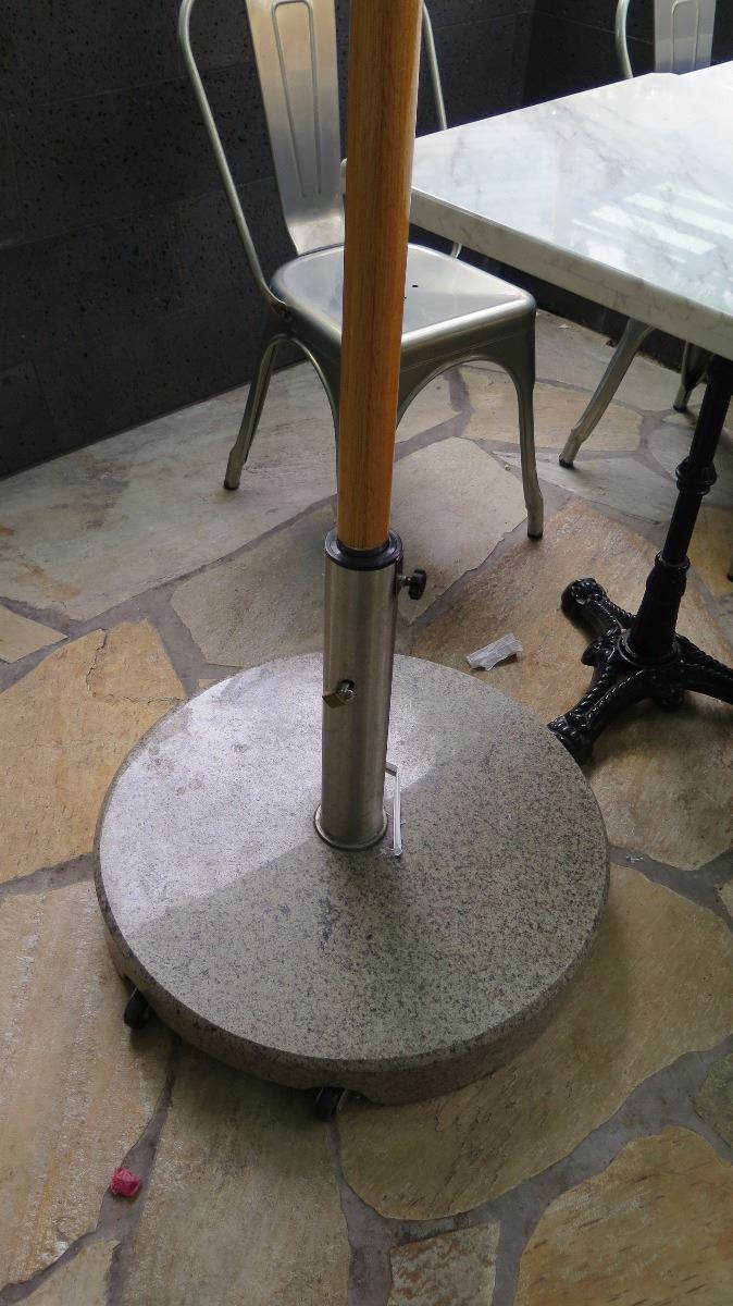 Square Lt Blue Canvas Patio Umbrella w/ Solid Stand, Solid Oak Frame, Pulley System, Granite Base. Heavy duty commercial market umbrella from Tropical J. 7' square. Sunbrella fabric. Harken yacht quality pulley system. Was purchased for $1521 each.