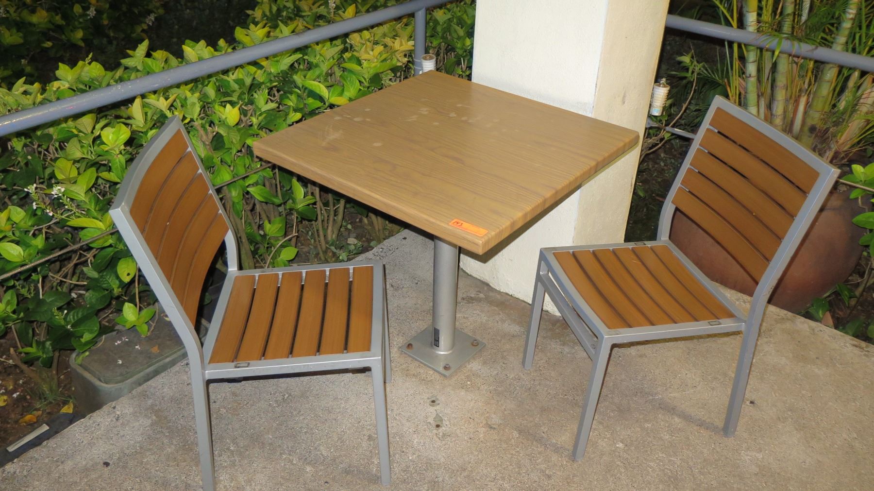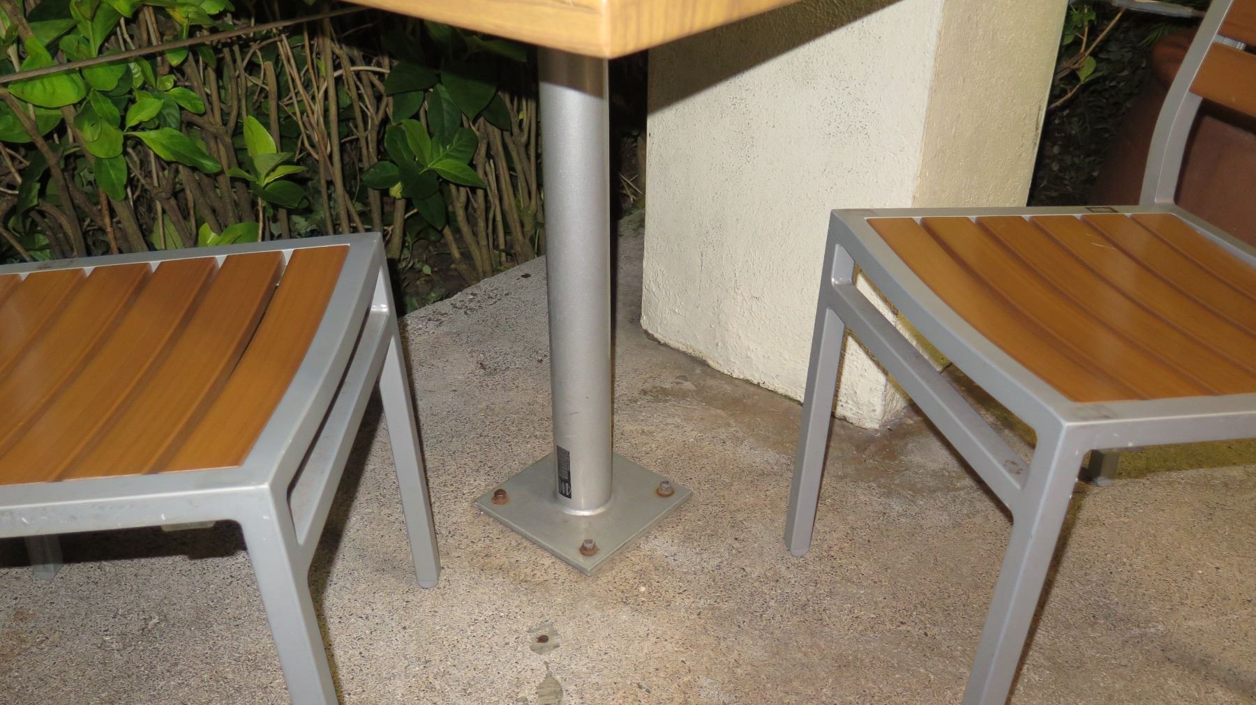 Square Metal Table (Wood-Look Wrap, 30"x30"x29"H) & 2 Chairs. Chairs have aluminum frame and composite wood-look slats