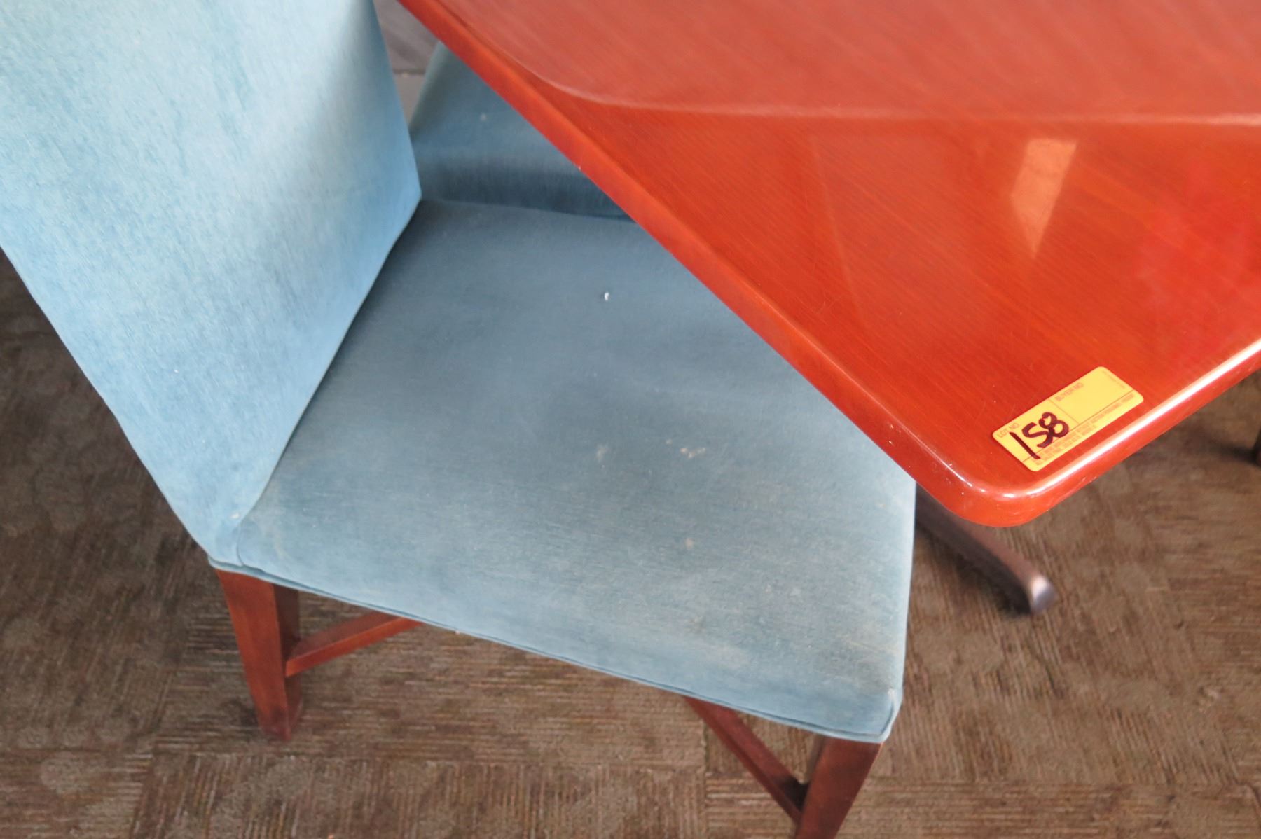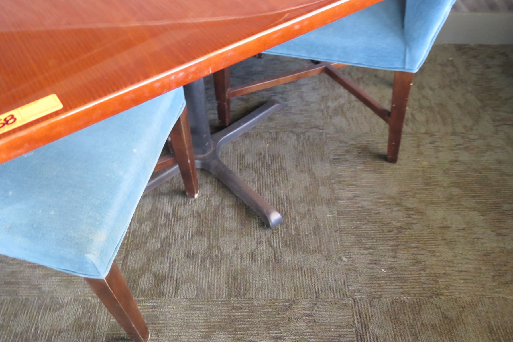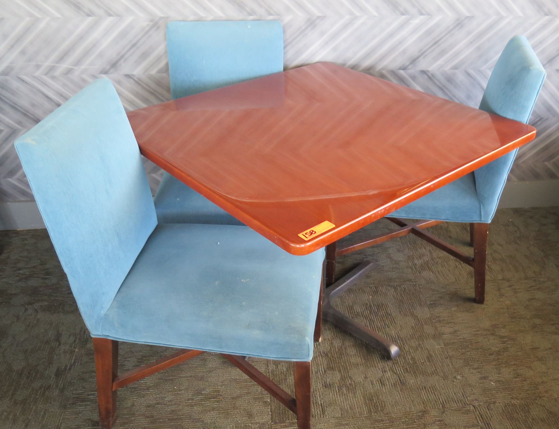 Square Wooden Table w/ Metal Base (38" x 38" x 29") & 3 Upholstered Chairs