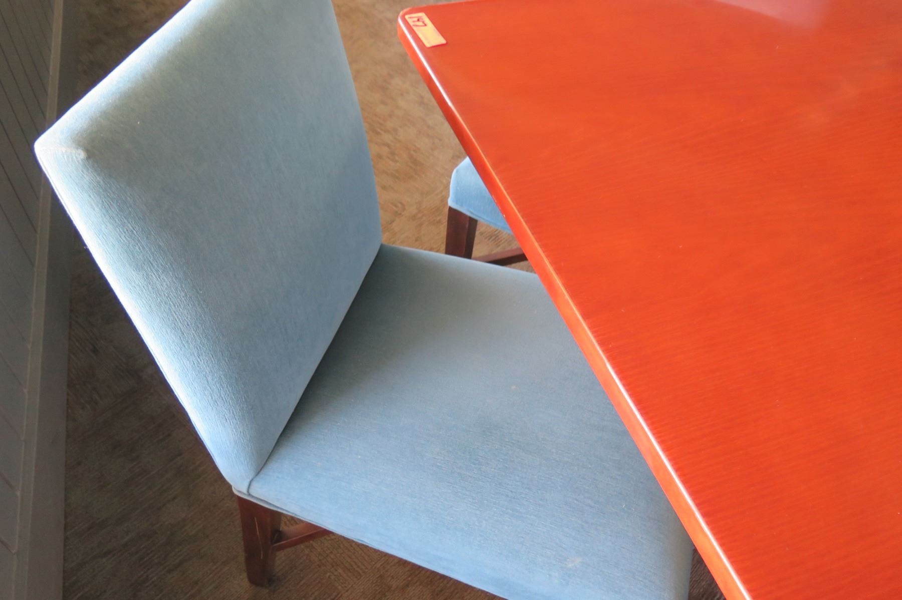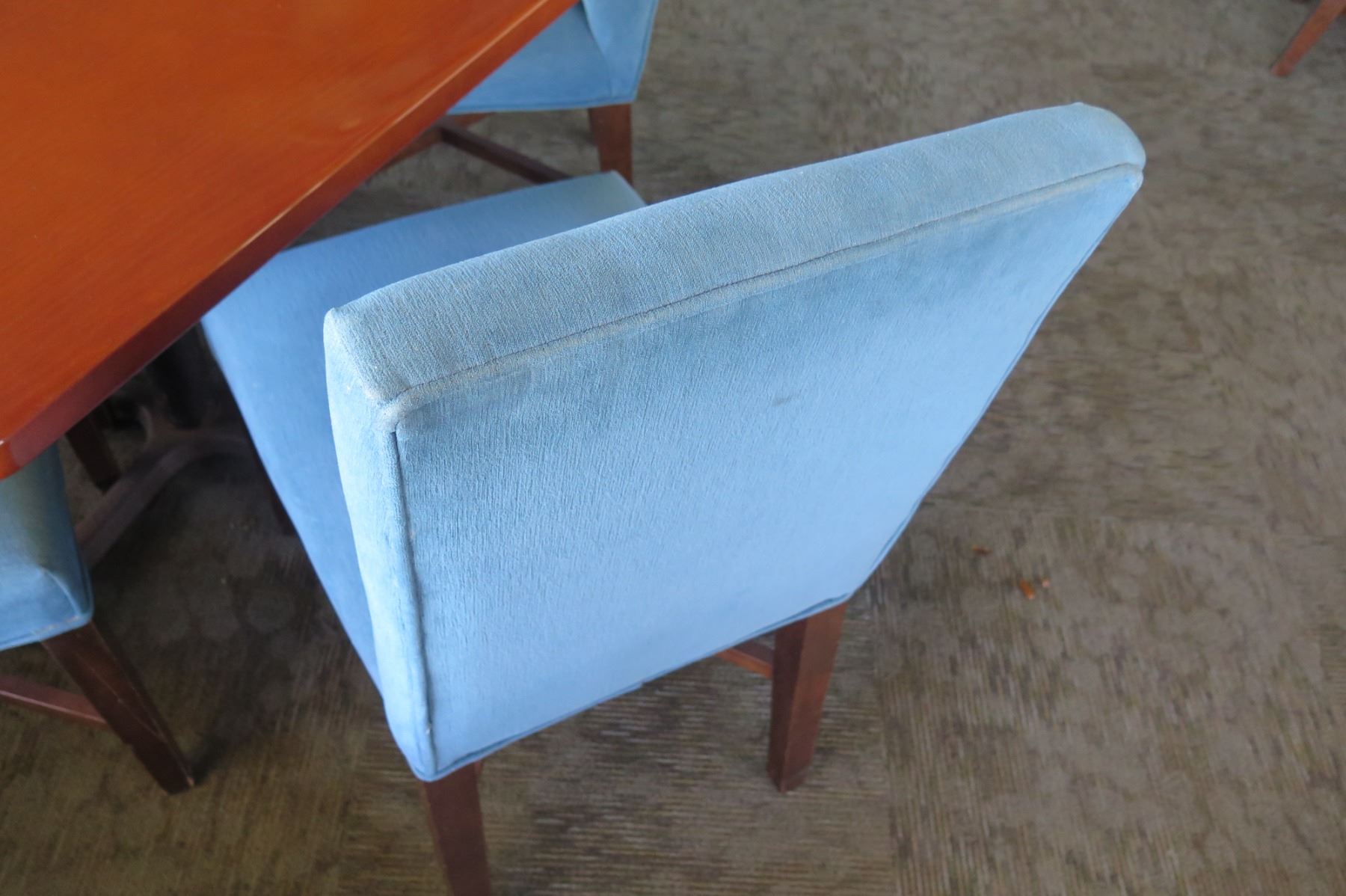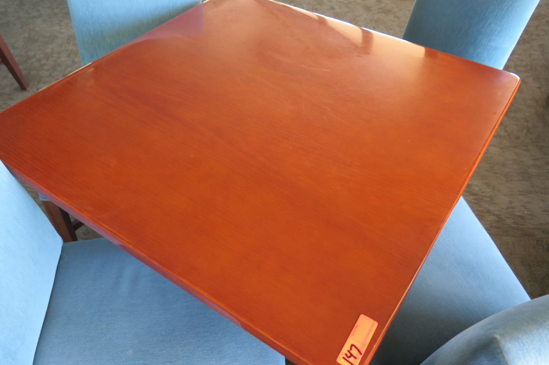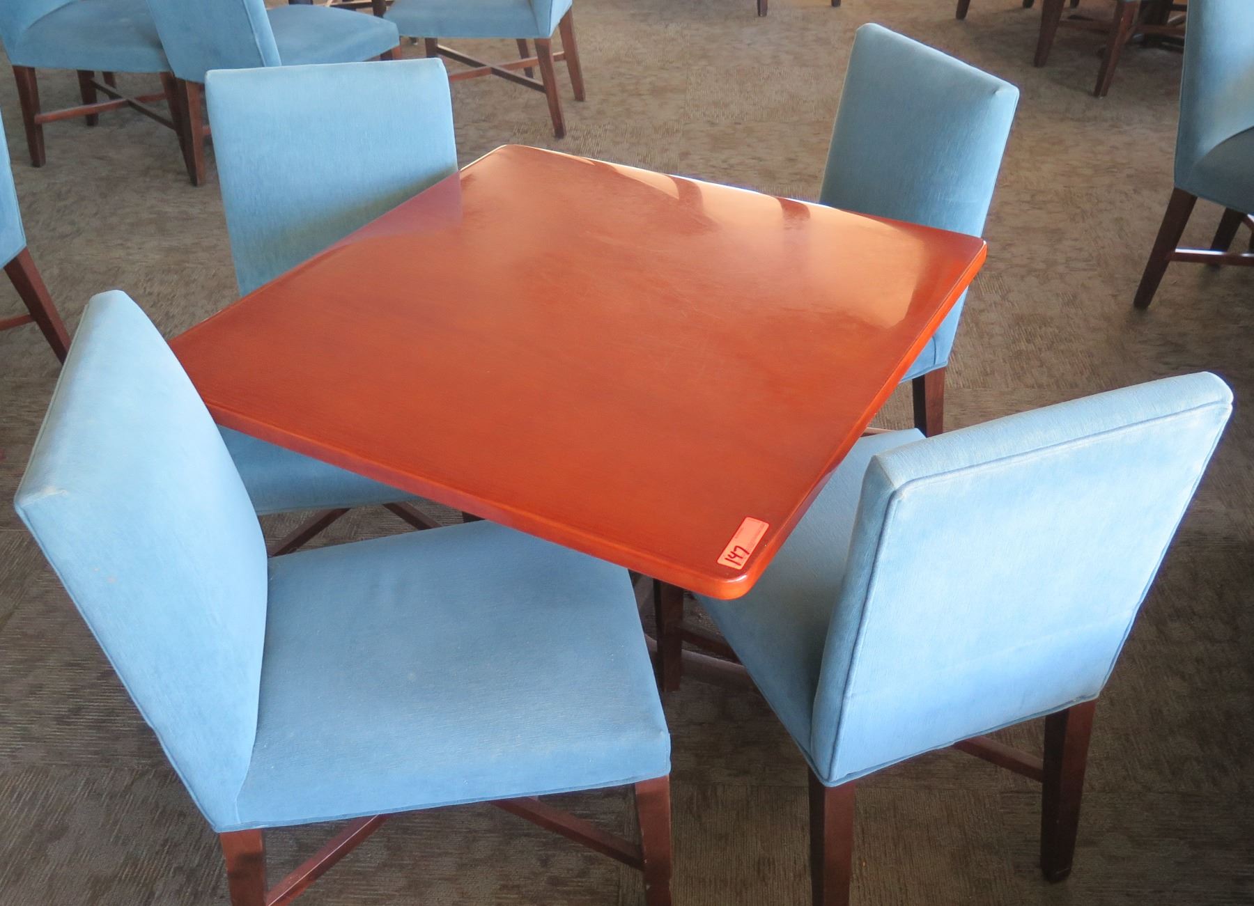 Square Wooden Table w/ Metal Base (38" x 38" x 29") & 4 Upholstered Chairs