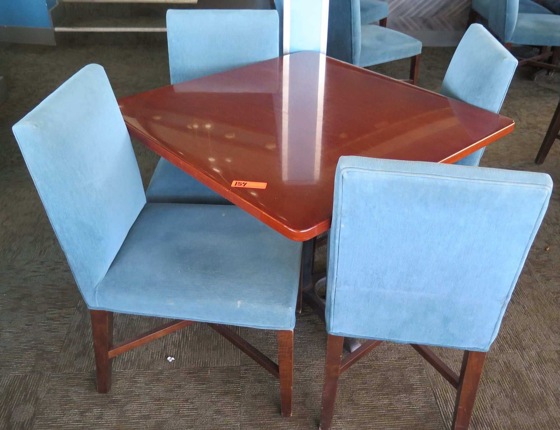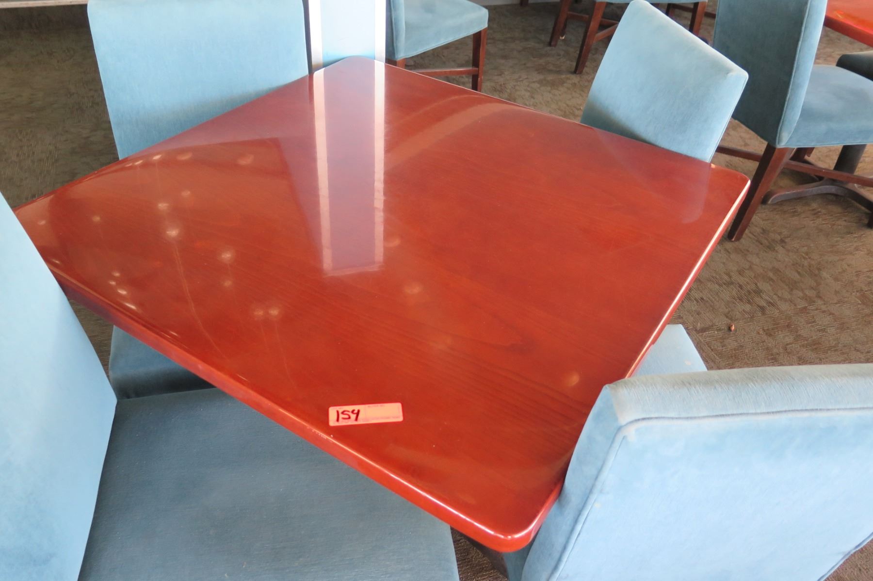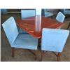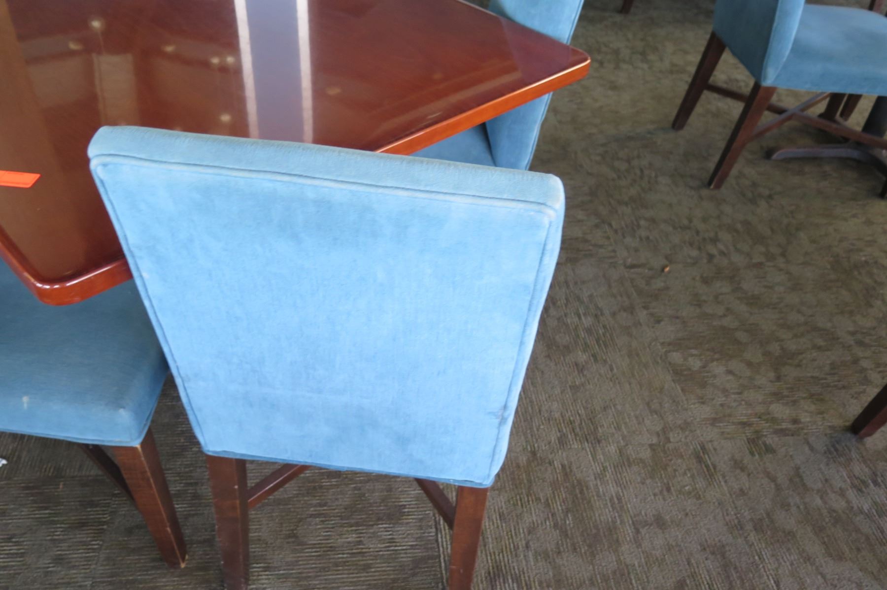 Square Wooden Table w/ Metal Base (38" x 38" x 29") & 4 Upholstered Chairs. Dots in photos are reflection of lighting fixtures above.