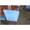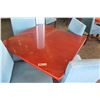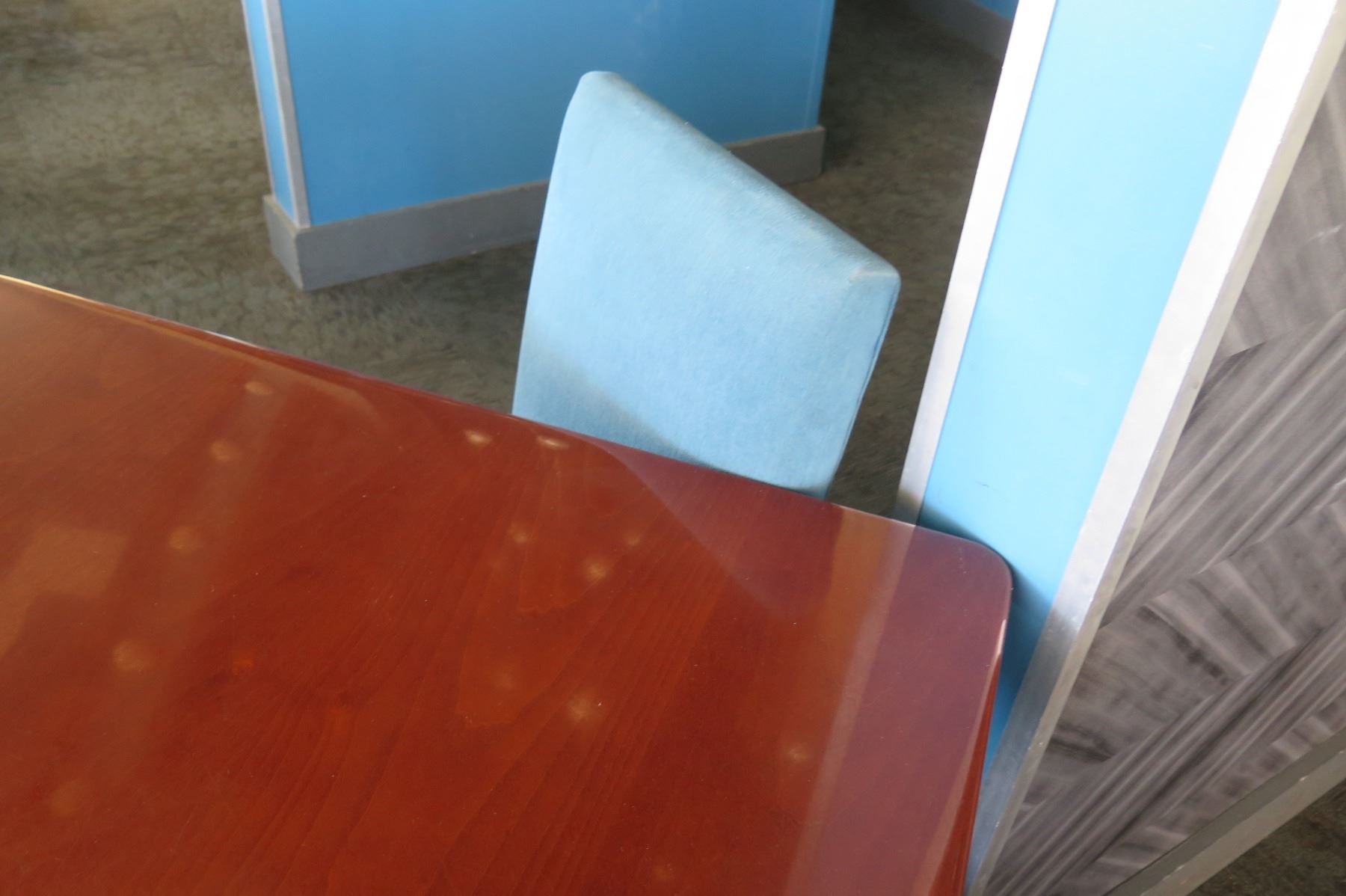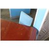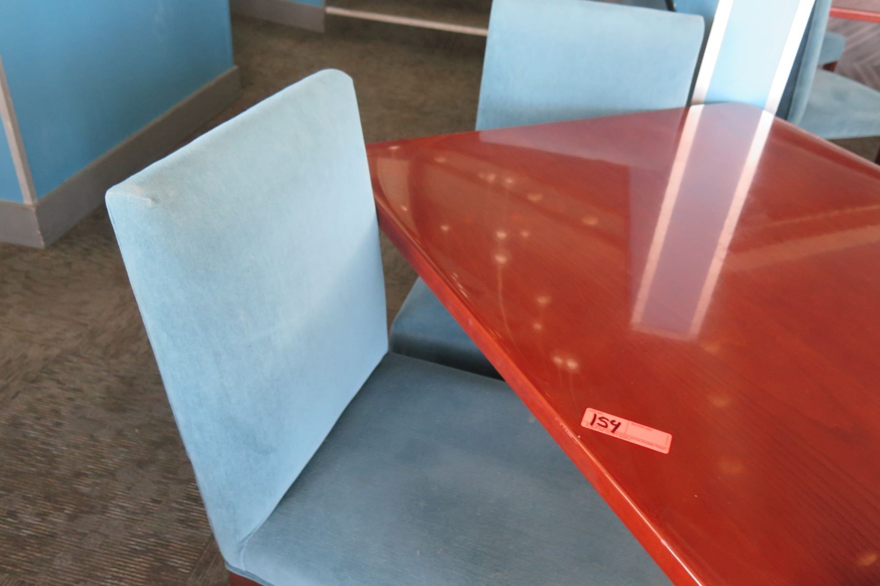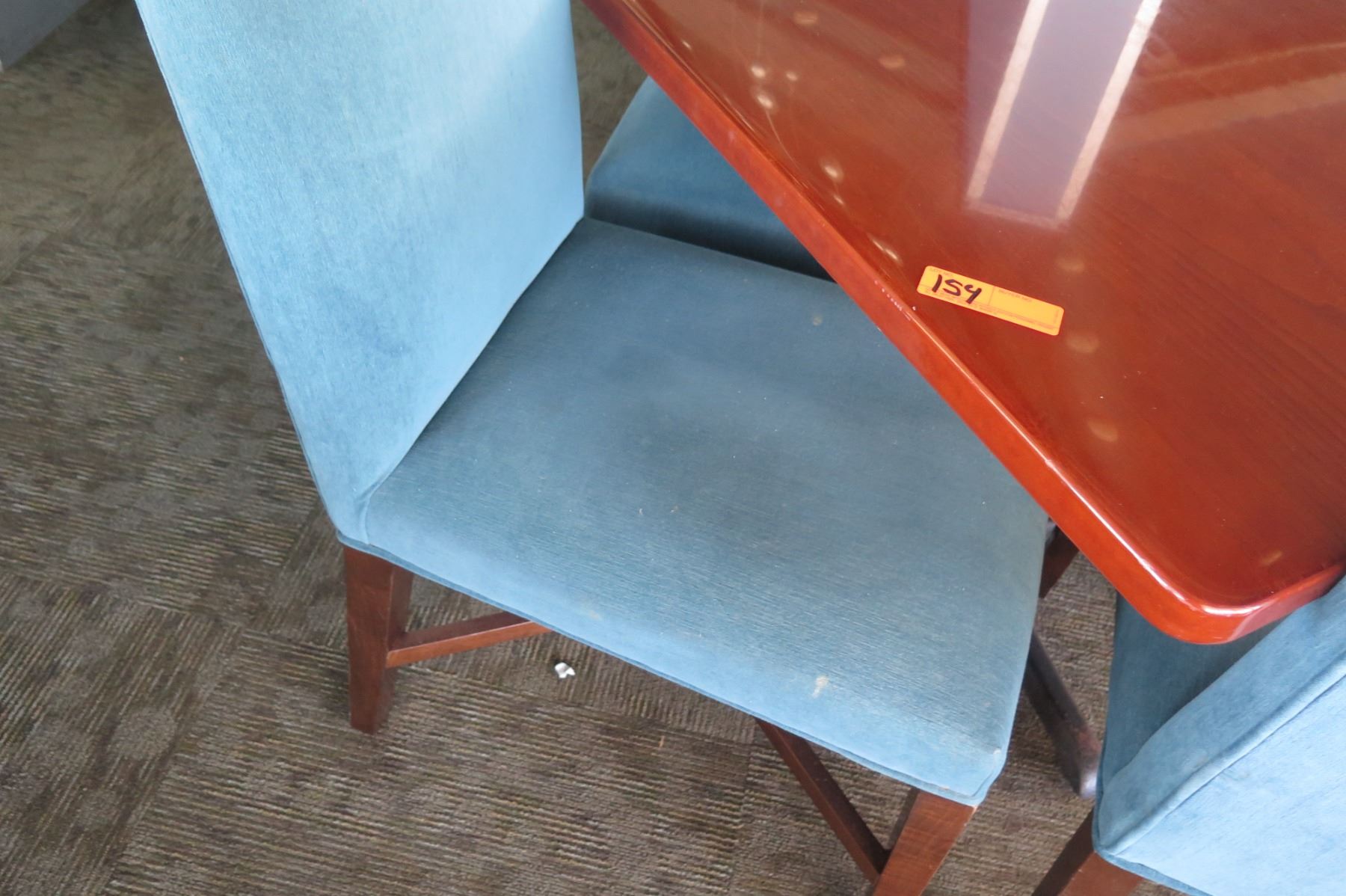 Square Wooden Table w/ Metal Base (38" x 38" x 29") & 4 Upholstered Chairs. Dots in photos are reflection of lighting fixtures above.