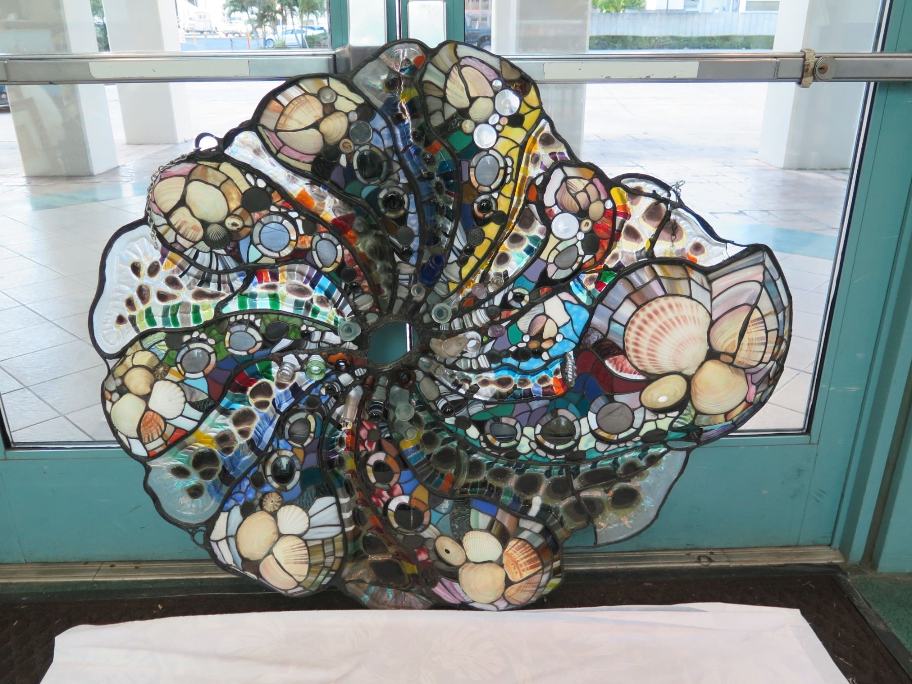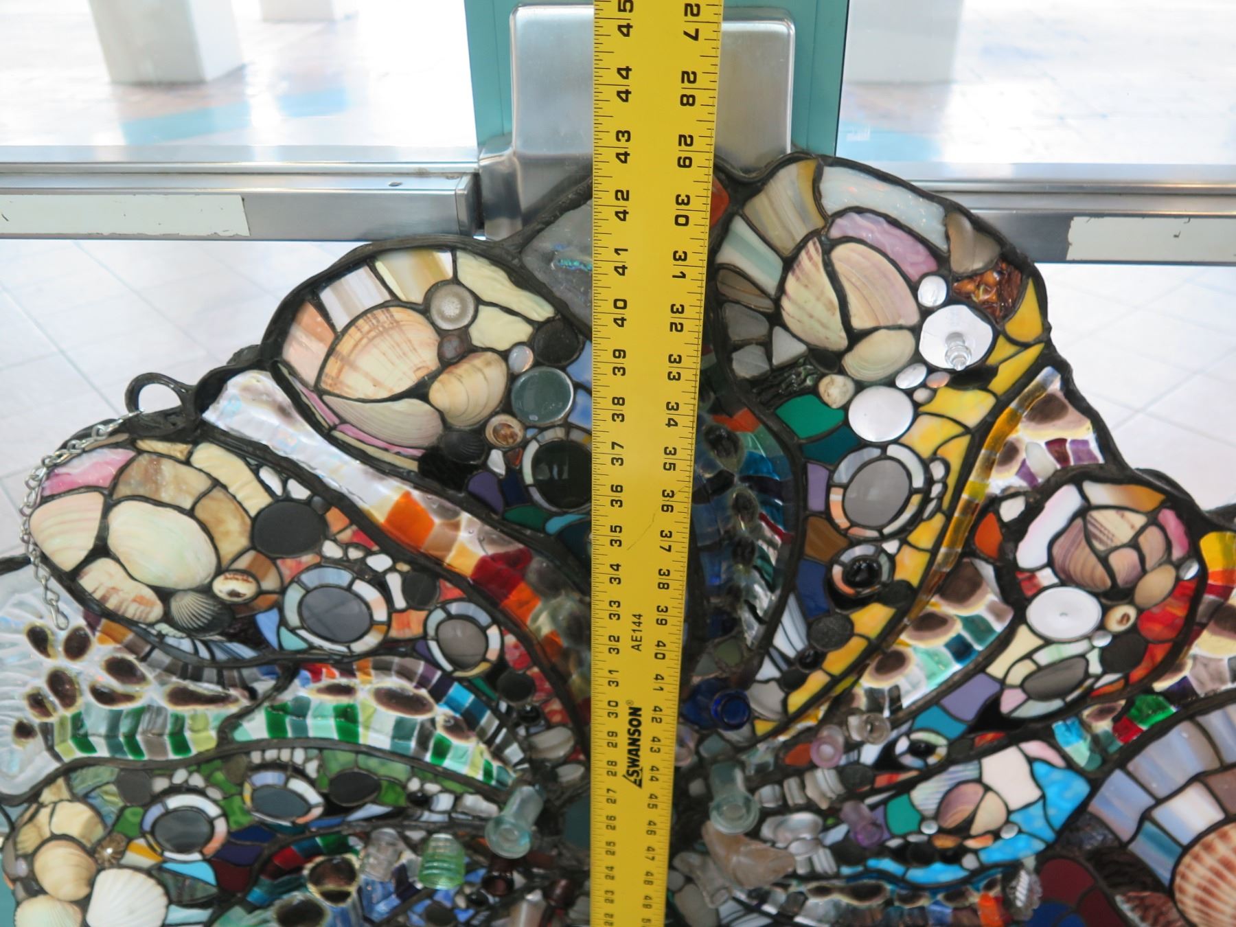 Stained Glass "Cornucopia" Wall Sculpture w/ Shells, Bottle Tops, Artist Daniel Tarr, 42"x50"
