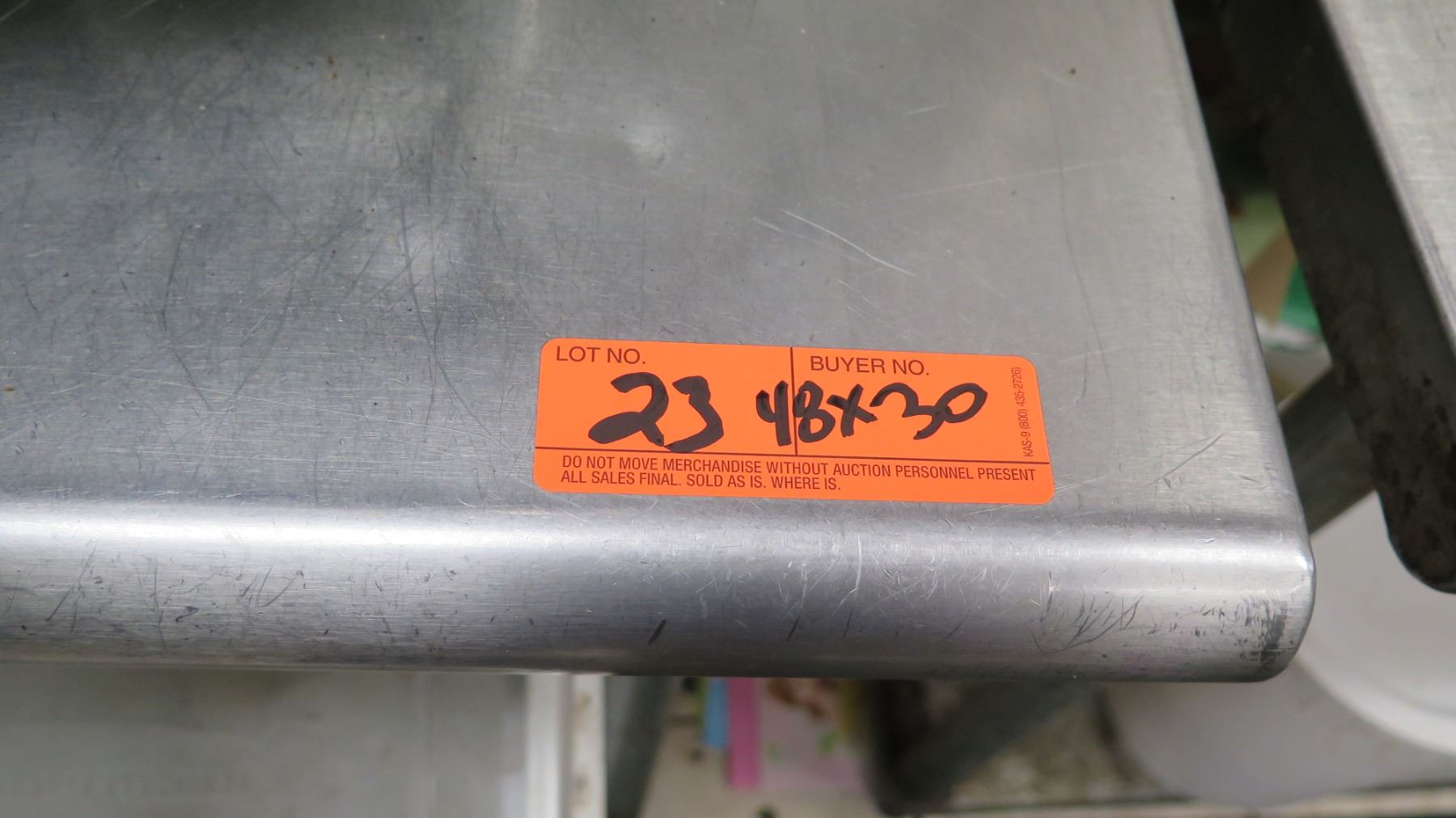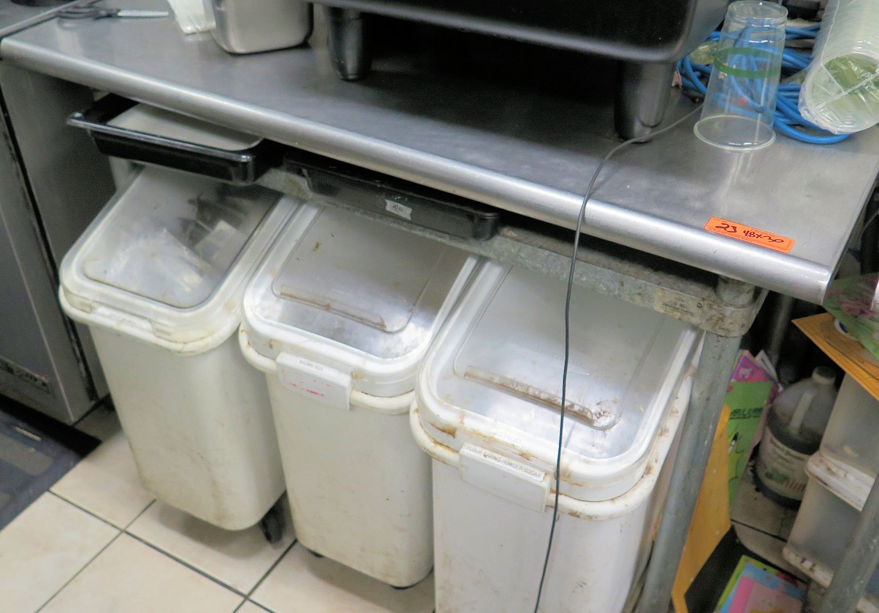 Stainless Steel Prep Table 48" x 30" w/ 3 Plastic Bins Underneath. FOOD PRODUCTS AND MERCHANDISE IN THE PICTURES ARE NOT INCLUDED.