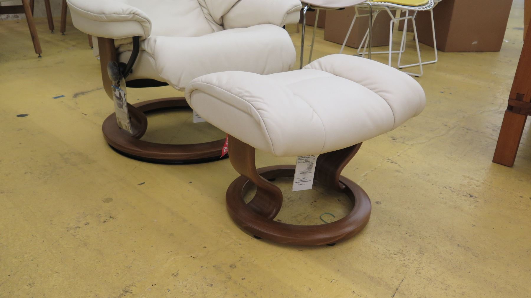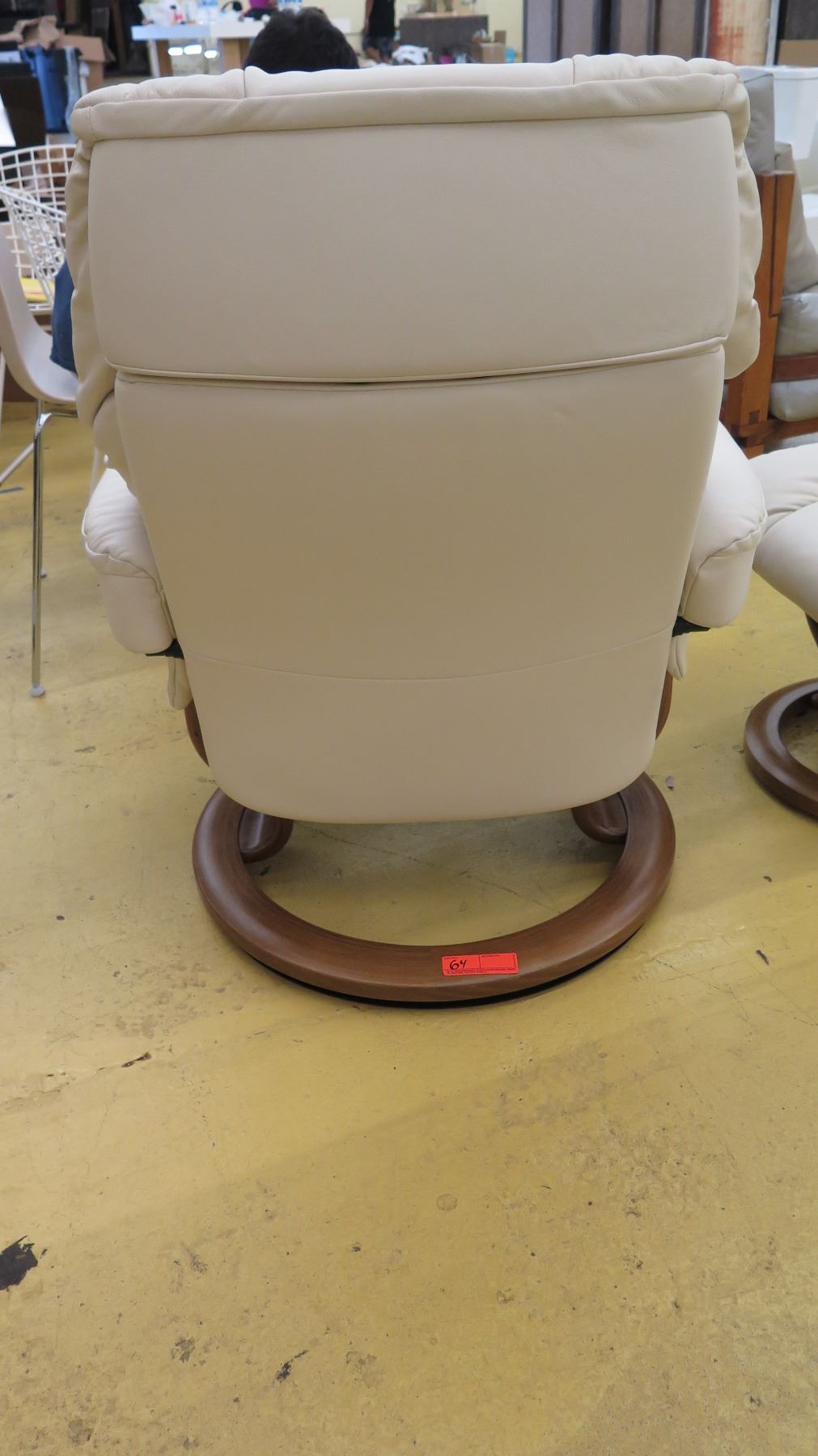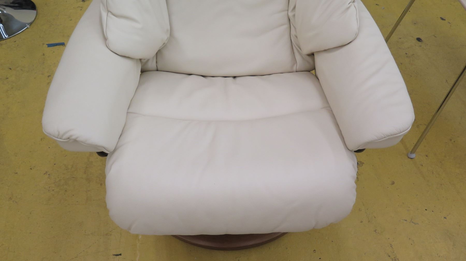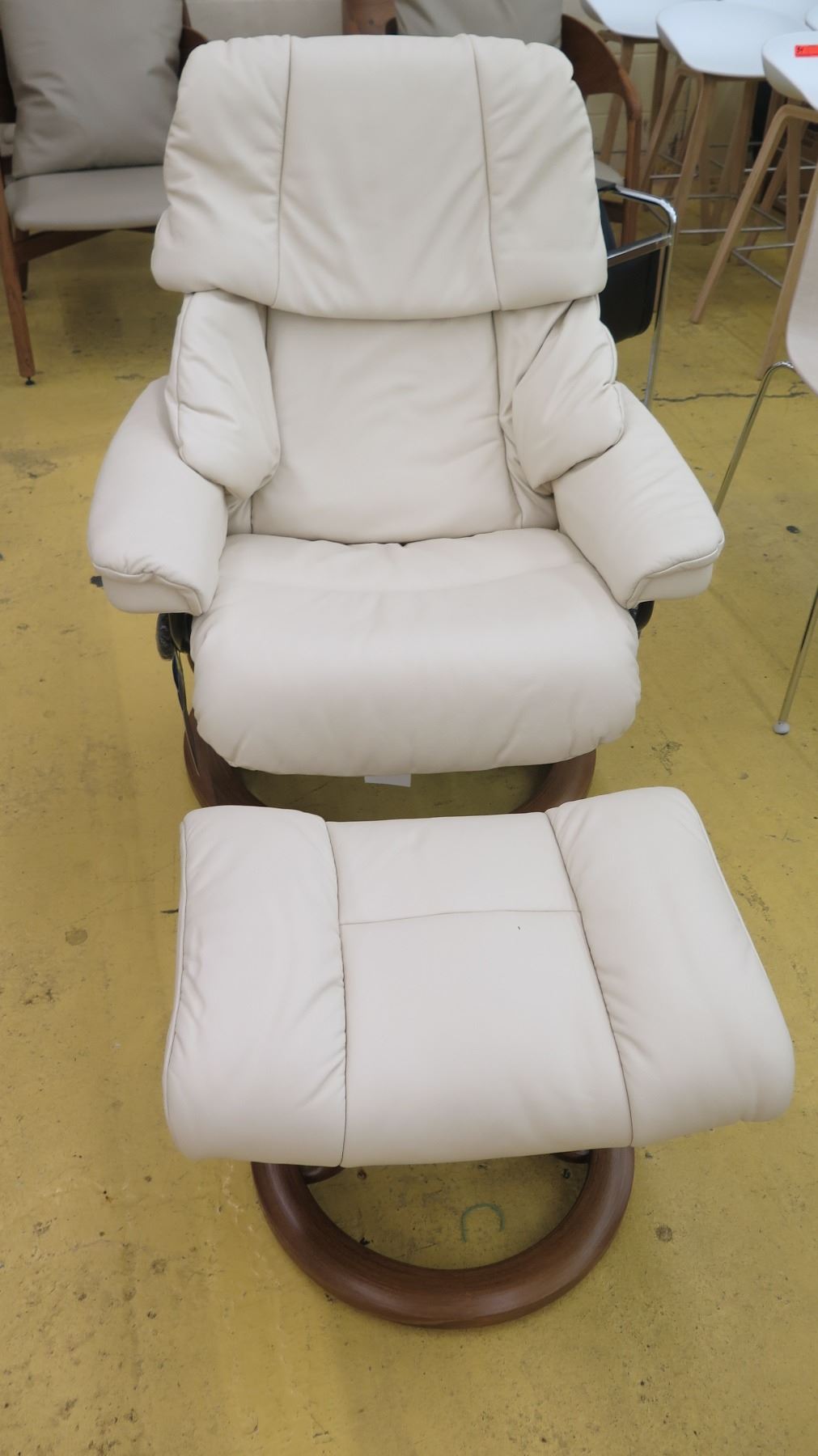 Stressless Leather Lounge Chair w/Ottoman - Ekornes (Norway), Ivory w/Circular Wooden Base