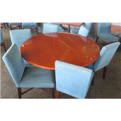 Large Round Table w/ Metal Base (30"Dia, 30"H) & 6 Upholstered Chairs. Dots in photos are reflection of lighting fixtures above.