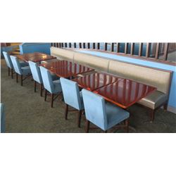 6 Rectangular Wooden Tables, 6 Upholstered Chairs & Row of Booth Seating