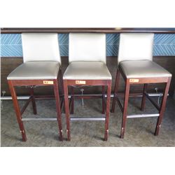 Qty 3 Silver Wooden Bar-Height Stools w/ Upholstered Back & Seat (40"H Backrest)