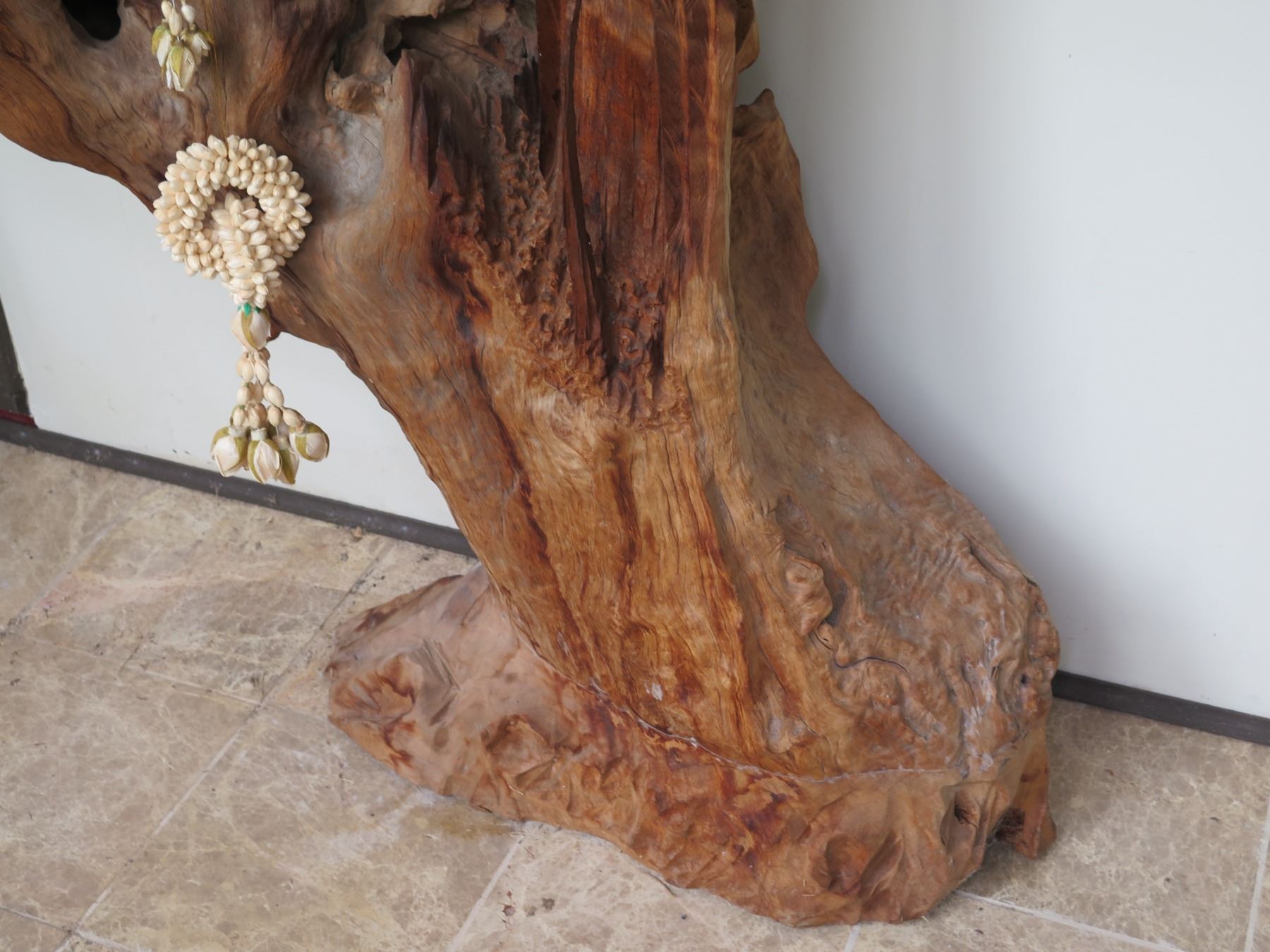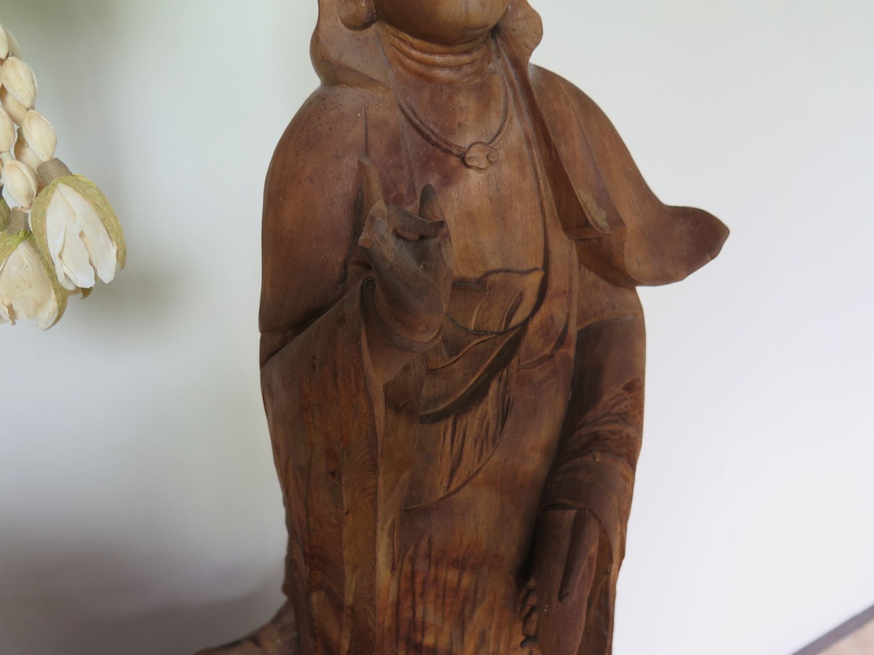 Tall Carved Wooden Buddha Statue w/ Shell Ornaments 39"W, 62"H