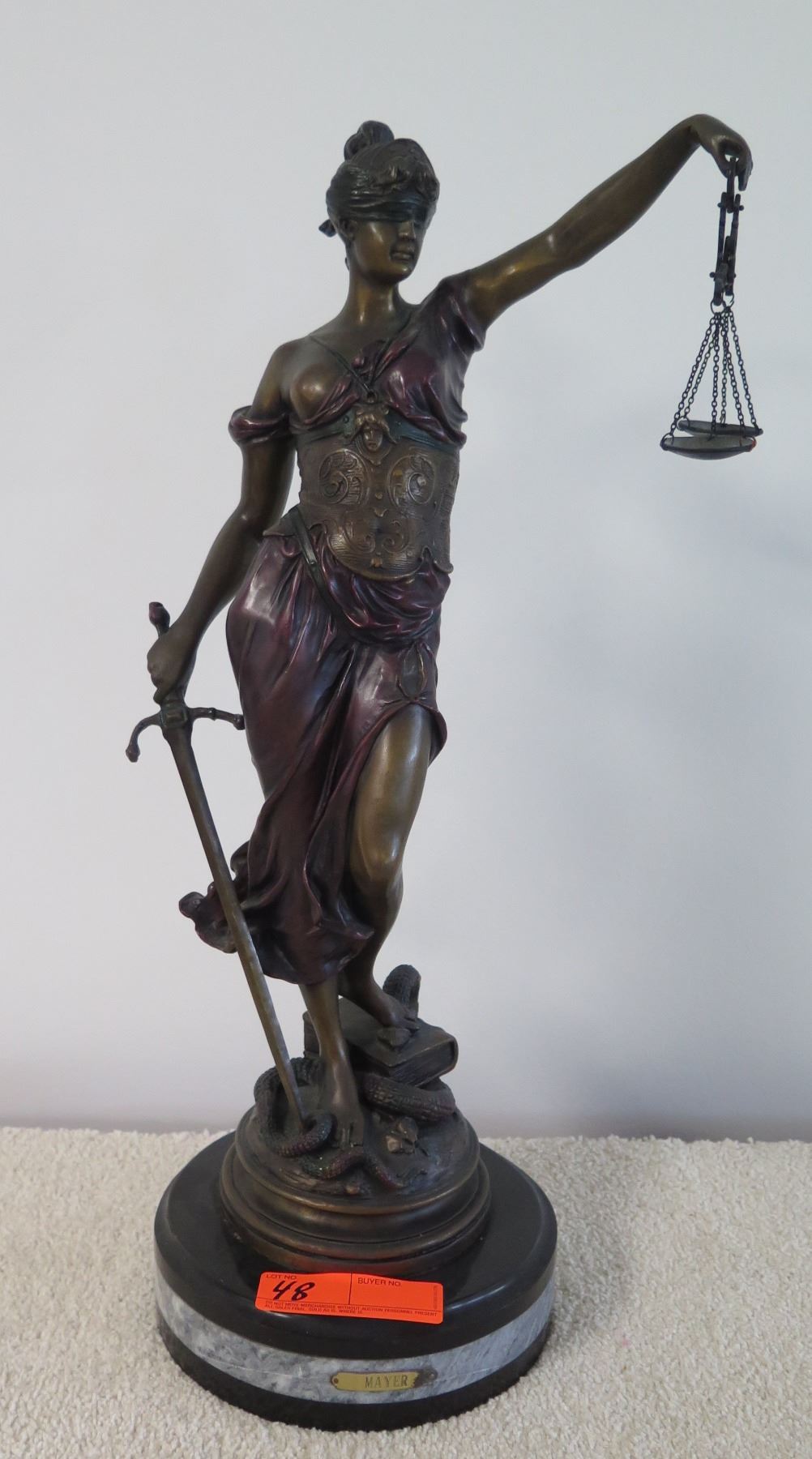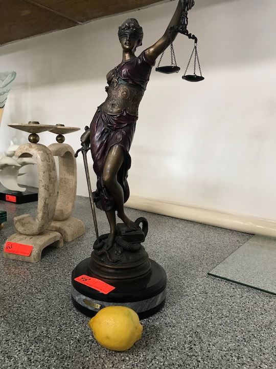 Tall Lady Justice Mixed Metal (Bronze?) Statue, Approx. 23" H. A lemon is used in the last picture to show scale.