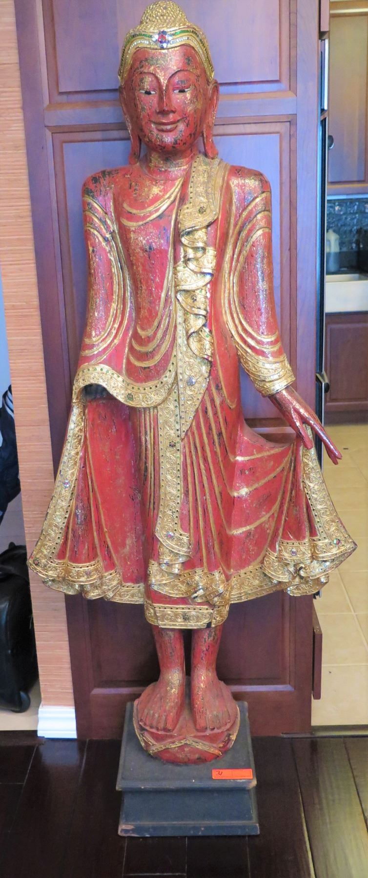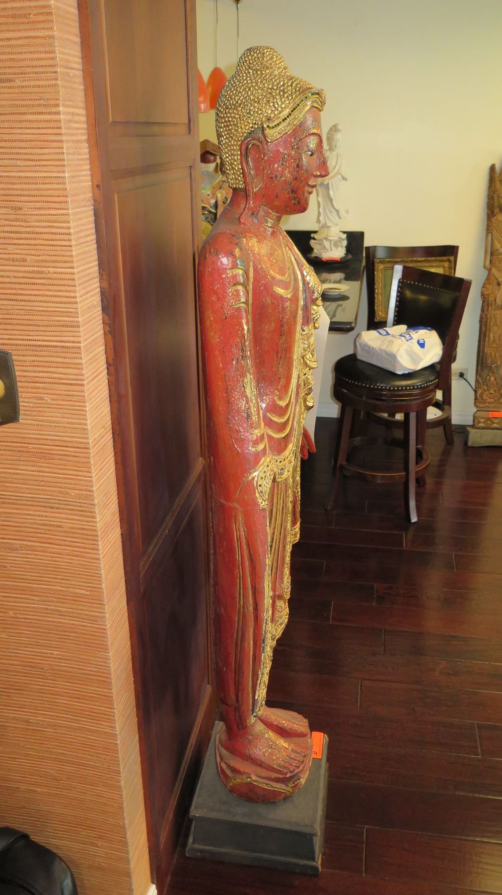 Tall Red Lacquered Carved Wood Standing Buddha w/Mirror Glass Applique, 66" H