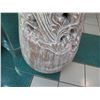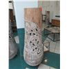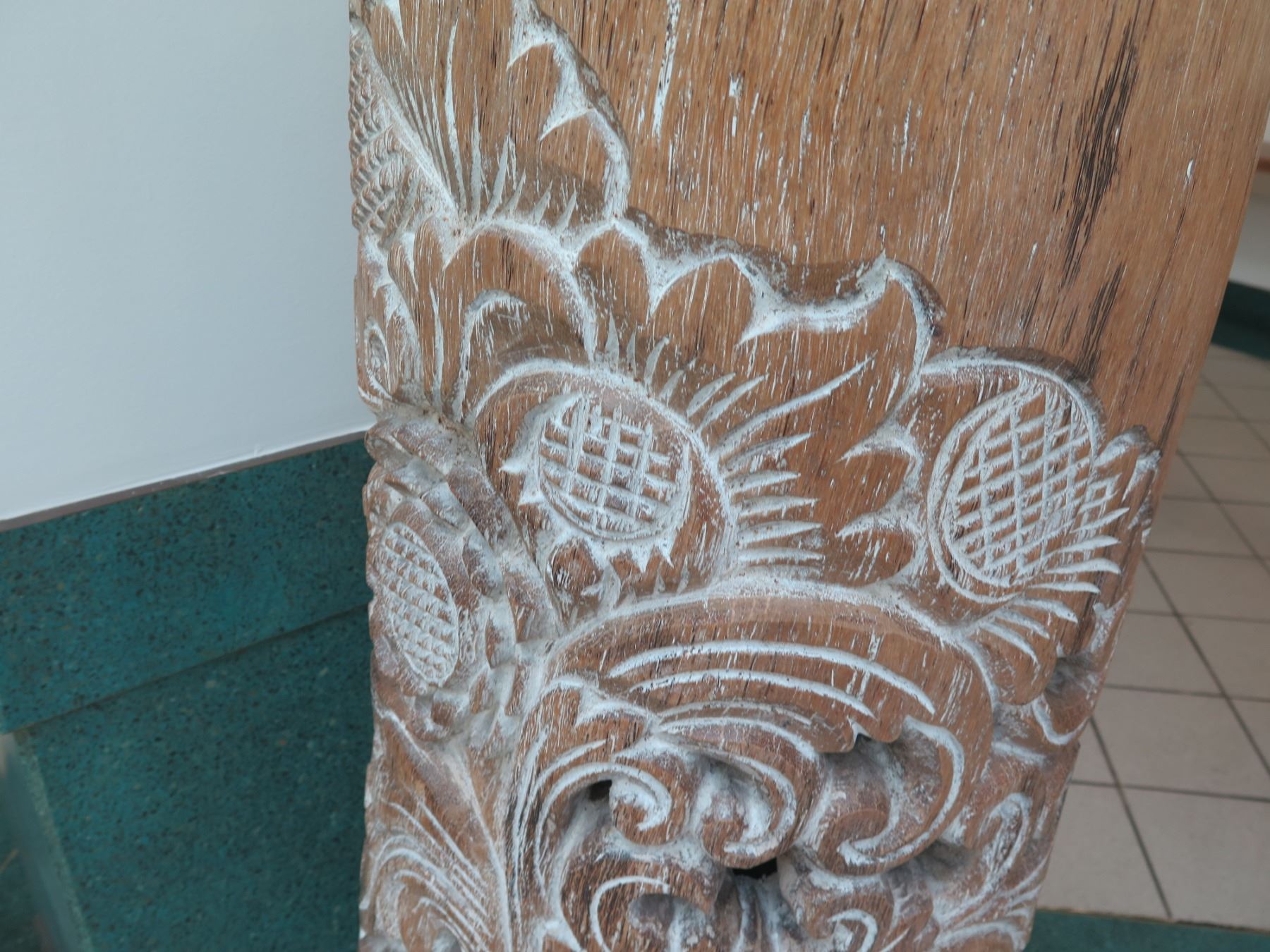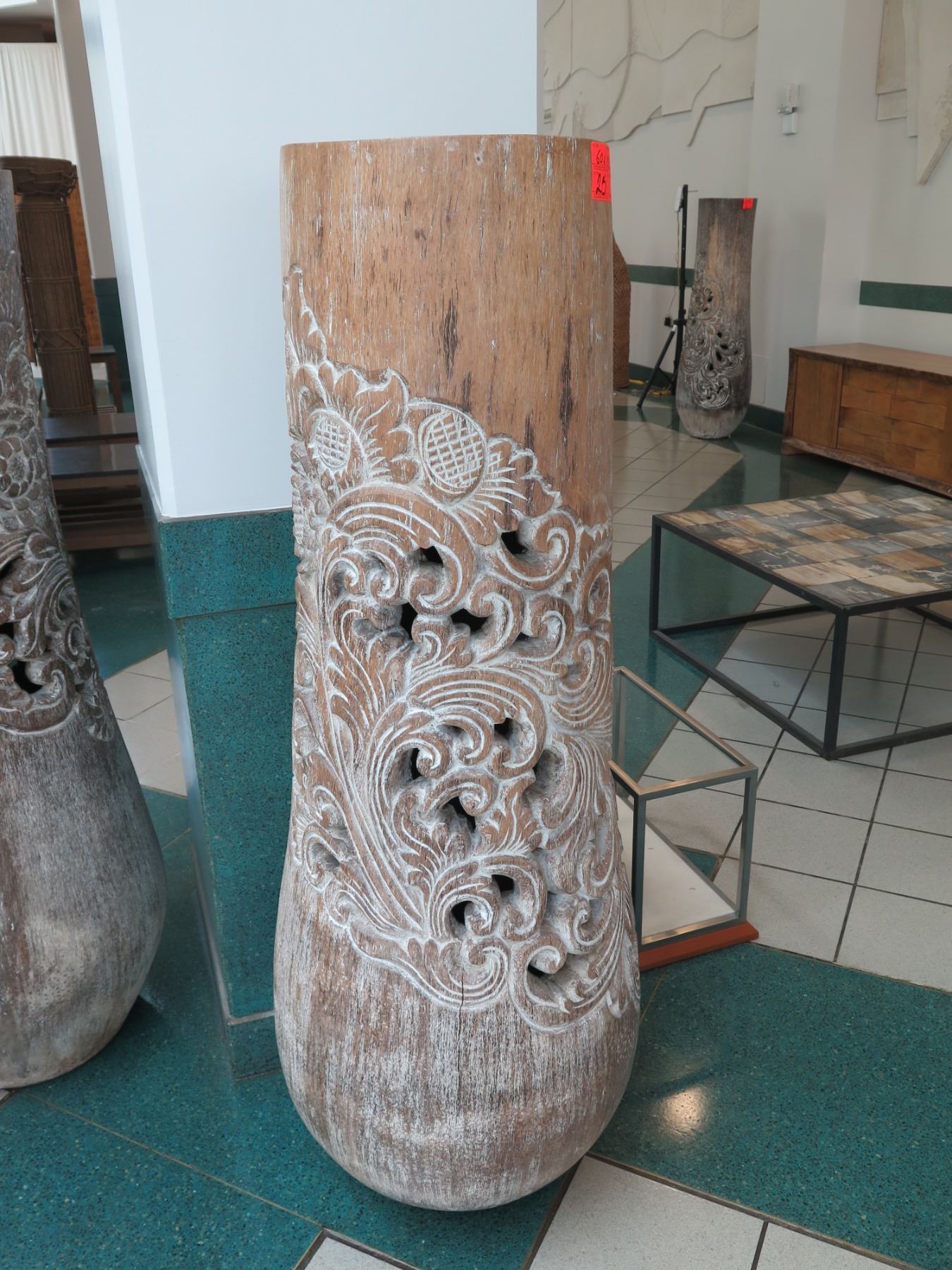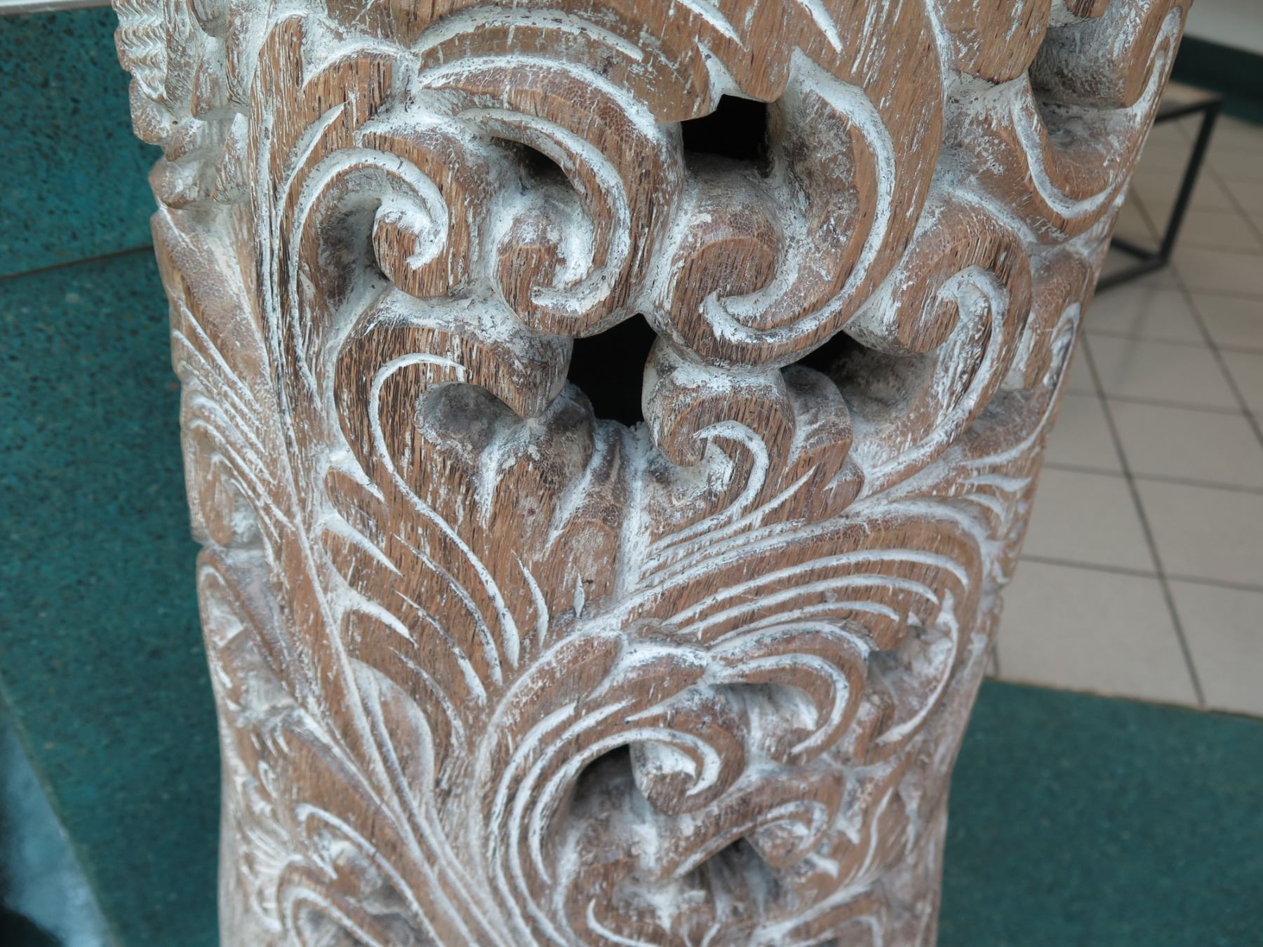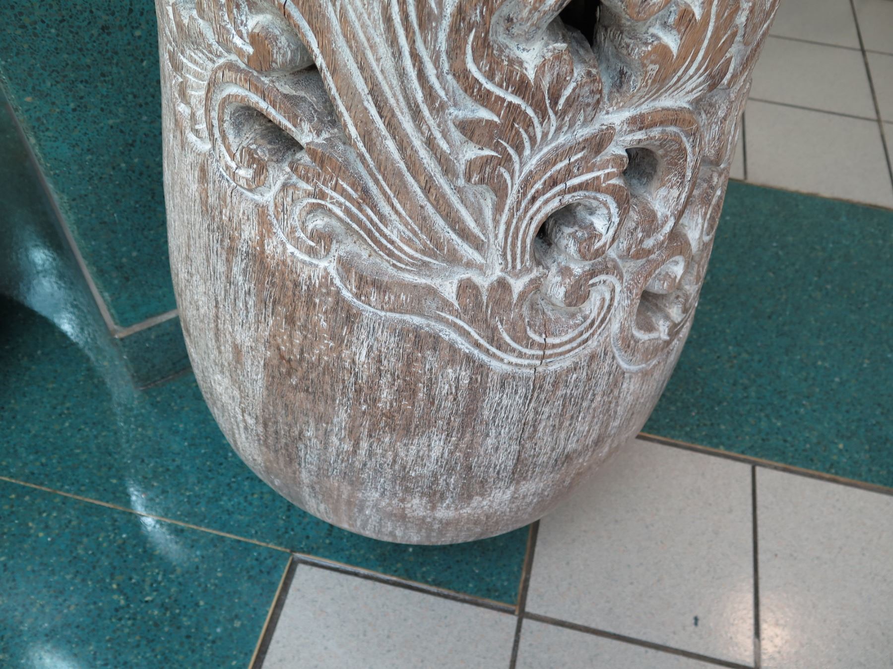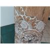 Tall Whitewashed Wooden Vessel w/ Carved Scroll Details 14" Dia, 60" Tall