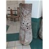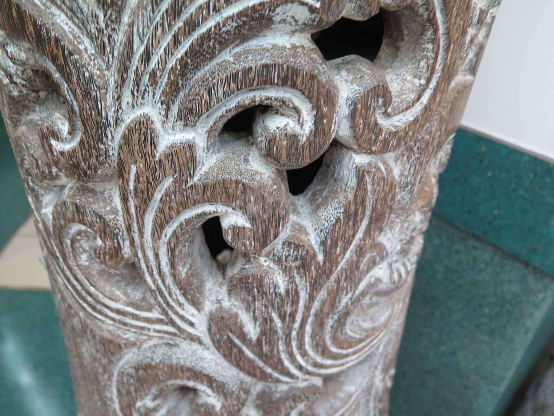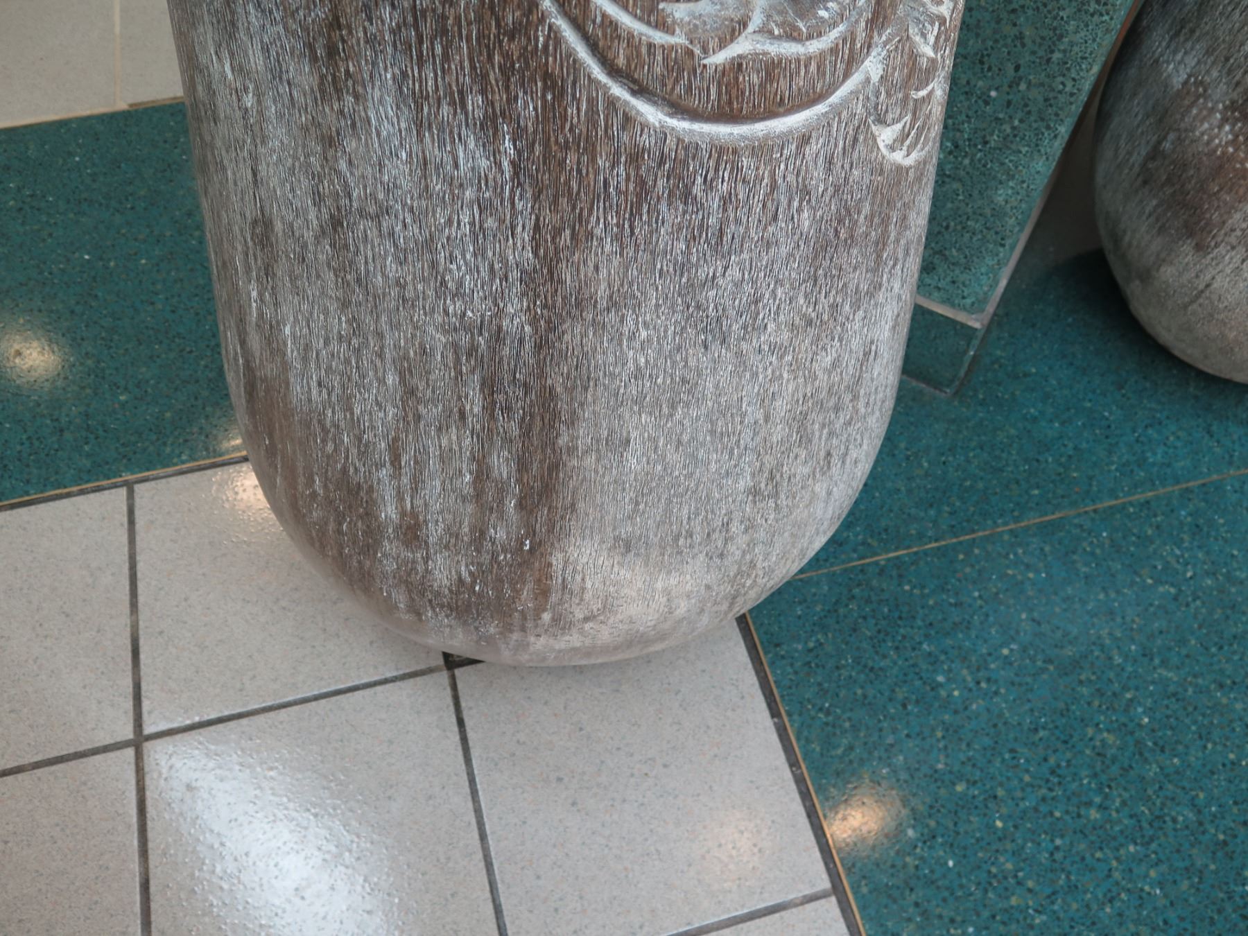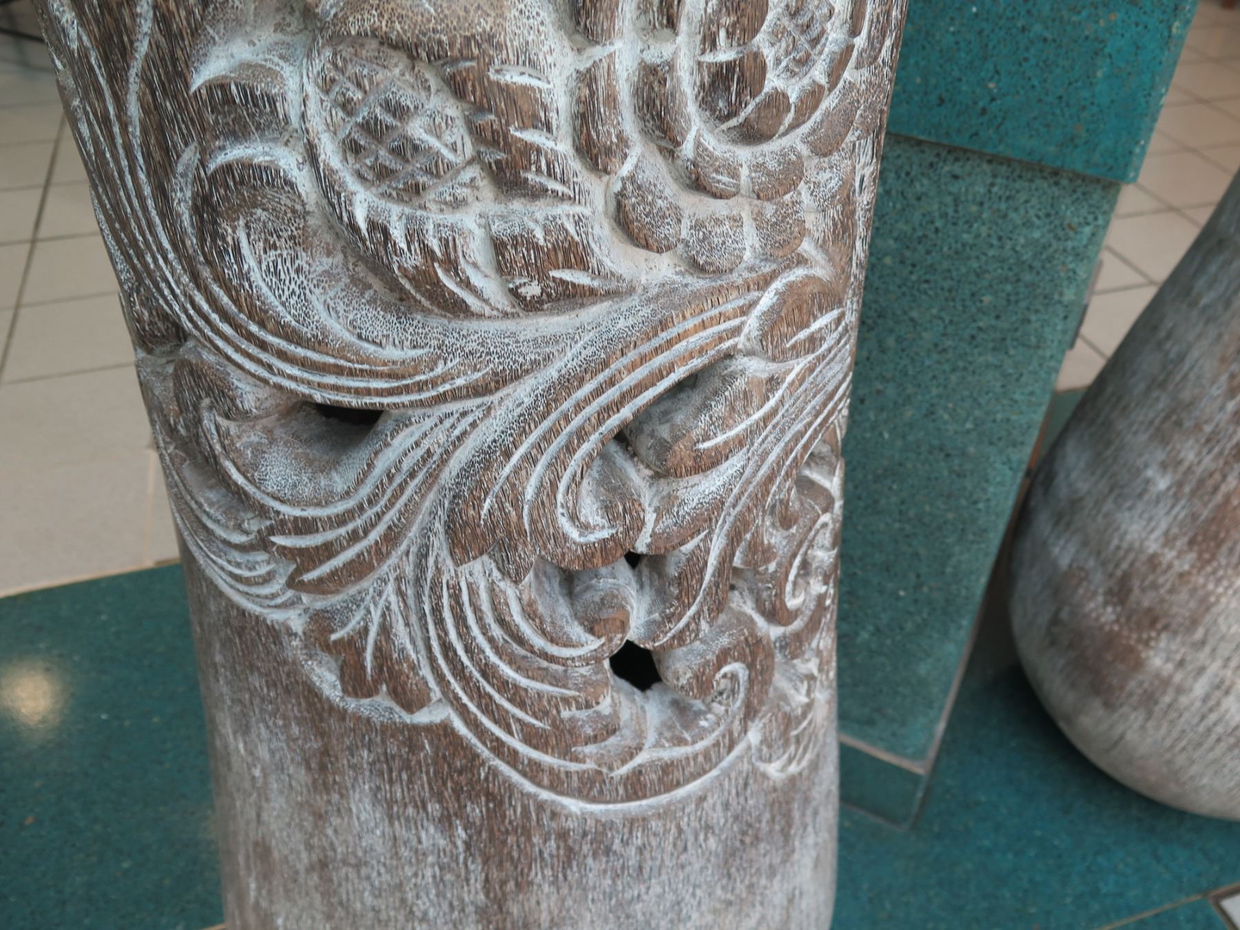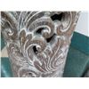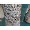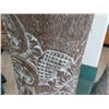 Tall Whitewashed Wooden Vessel w/ Carved Scroll Details 16" Dia, 61" Tall