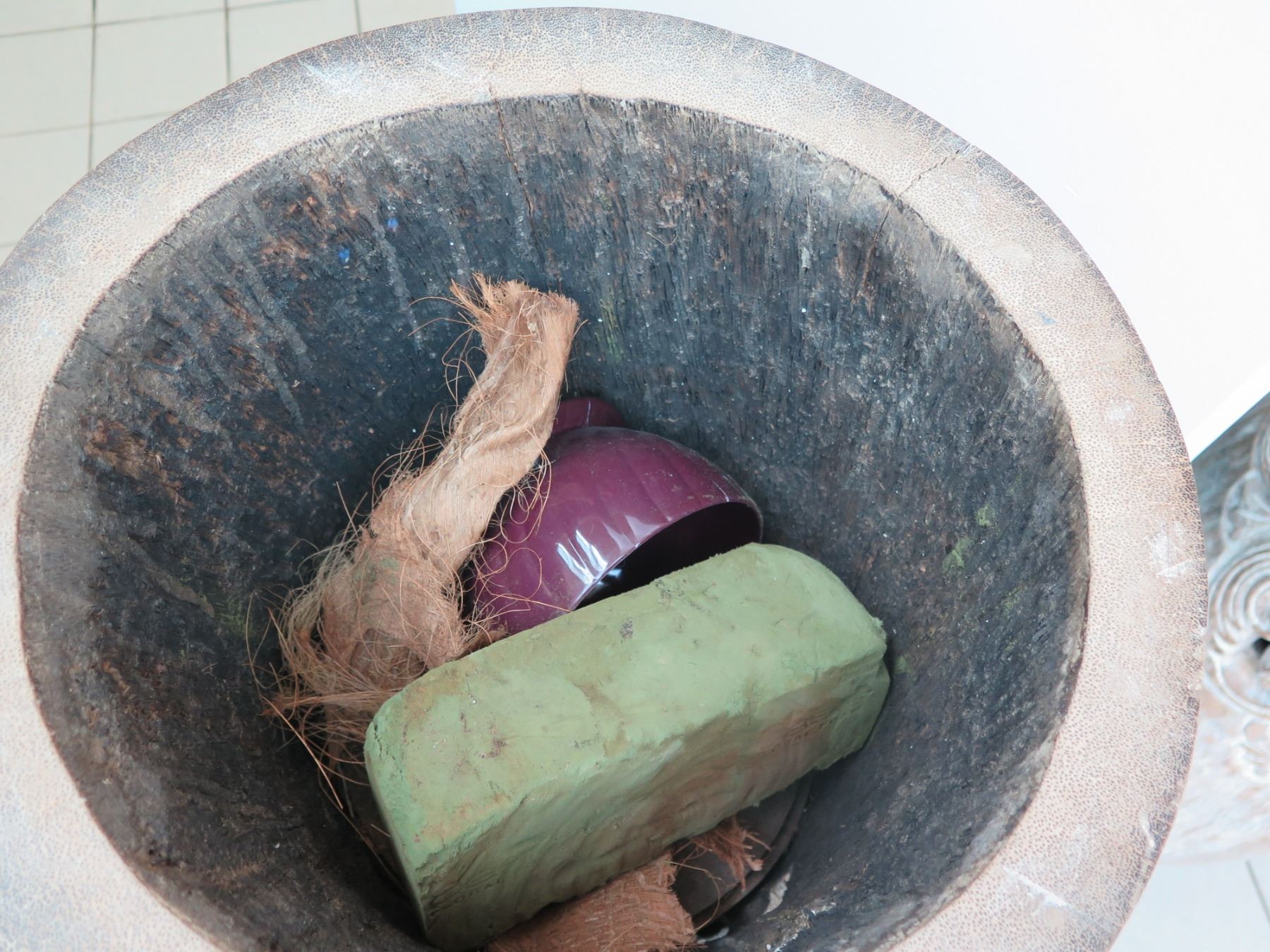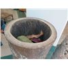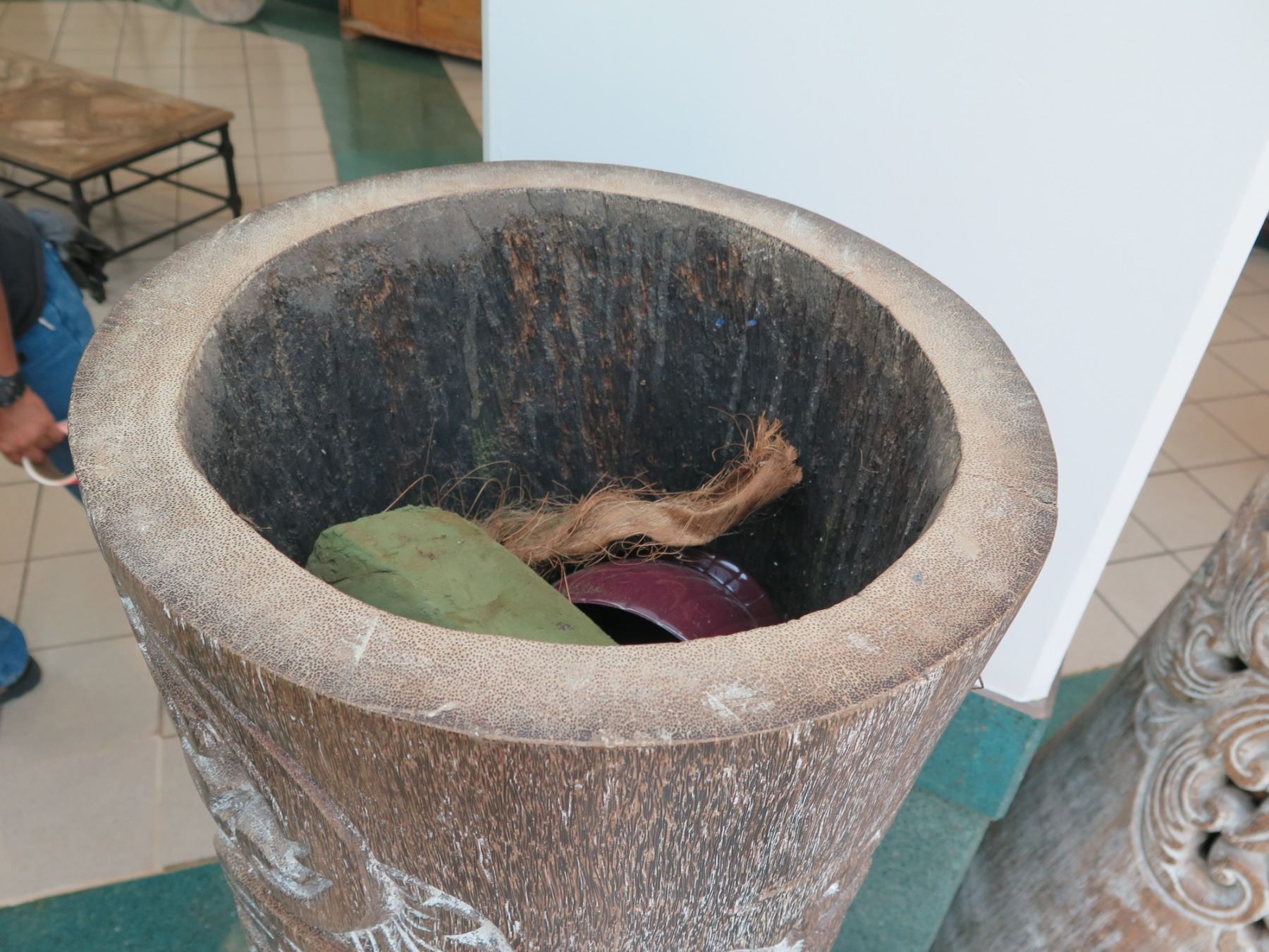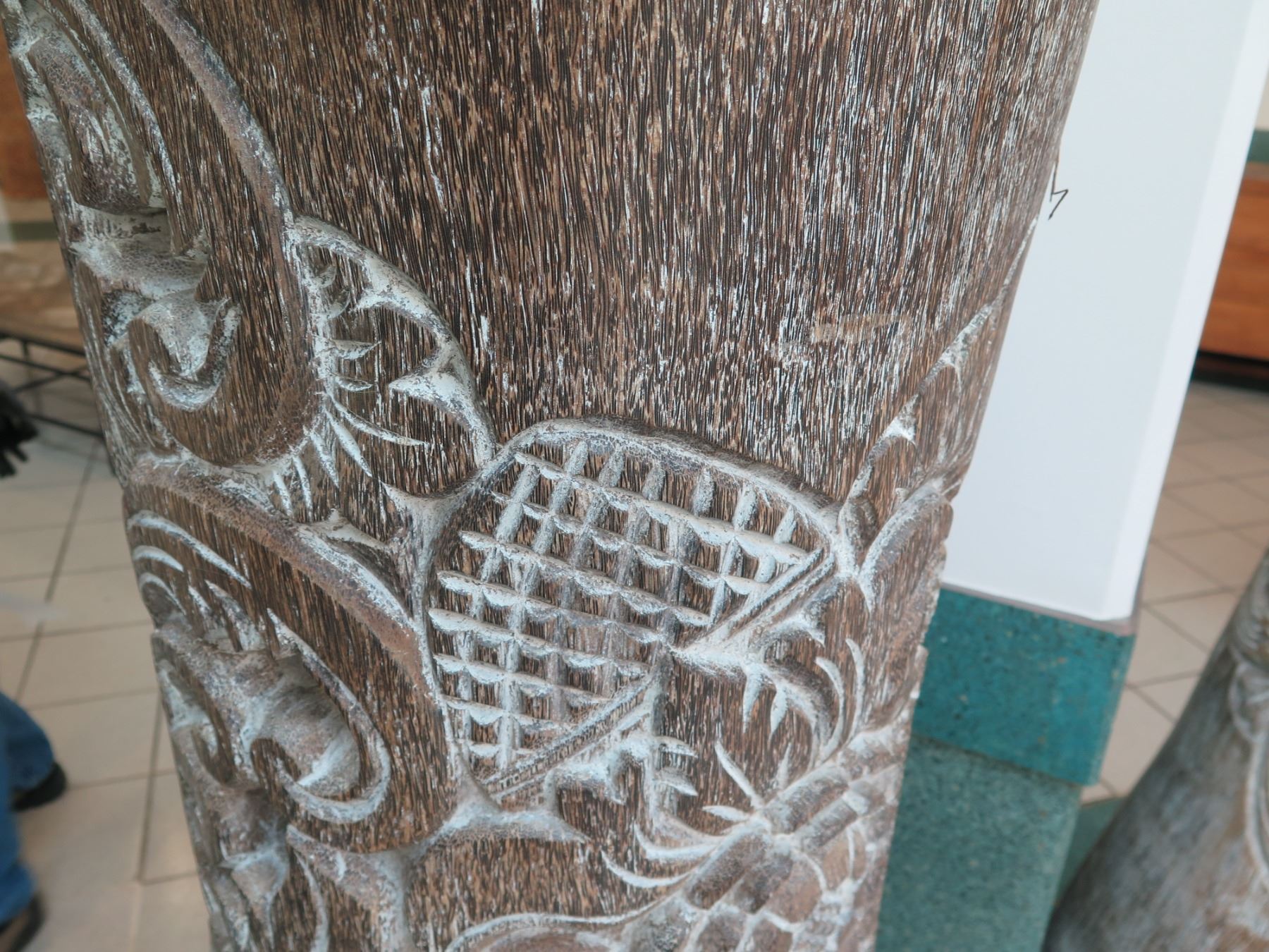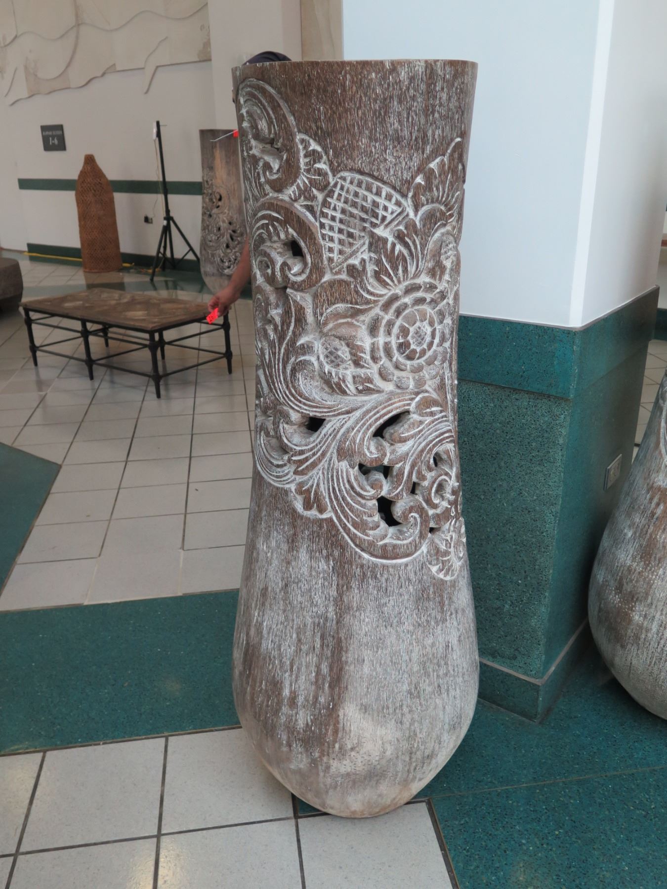 Tall Whitewashed Wooden Vessel w/ Carved Scroll Details 16" Dia, 61" Tall