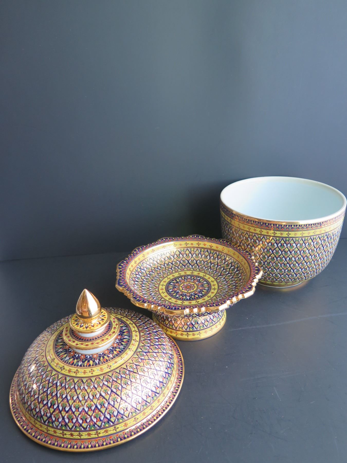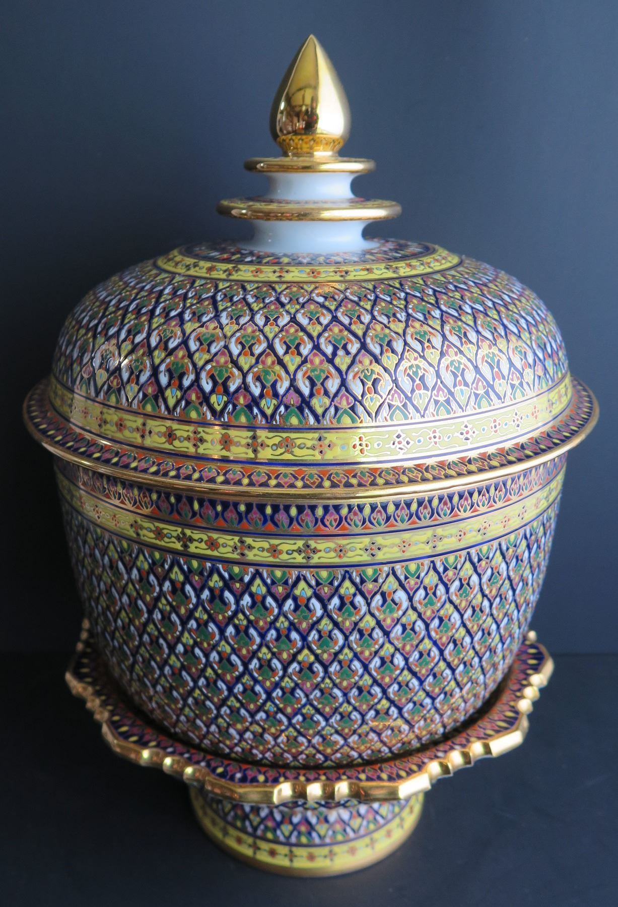 Thai Benjarong Porcelain Lidded Bowl w/ Stand 12" Tall
