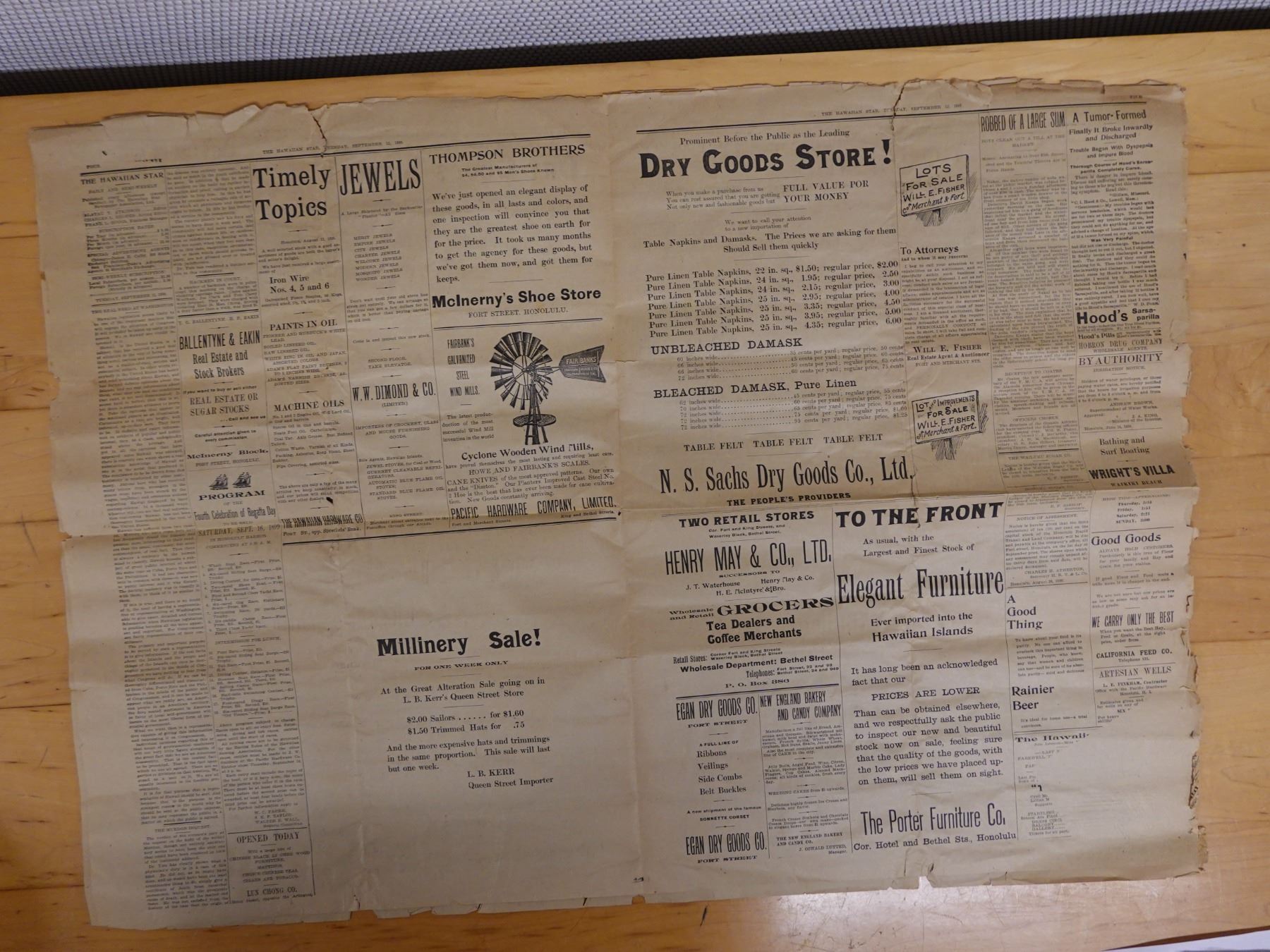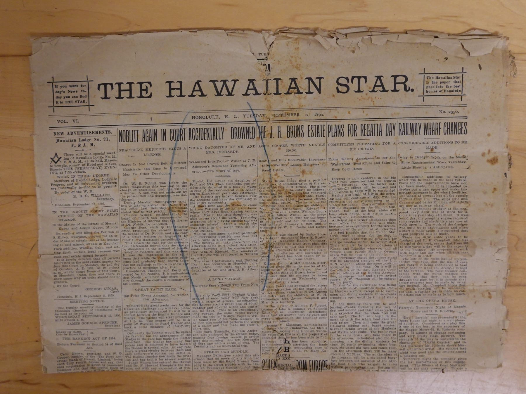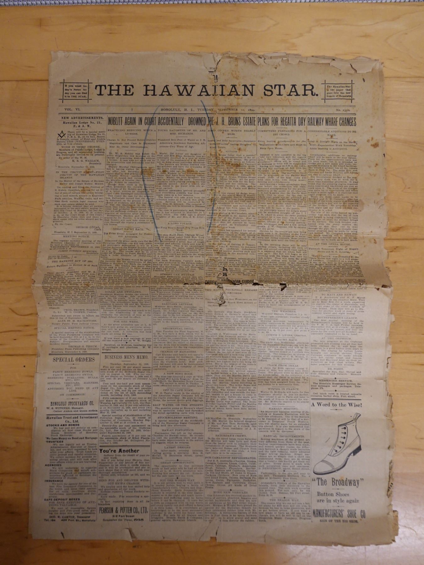 The Hawaiian Star Newspaper Dated 9/12/1899, 15" x 21"