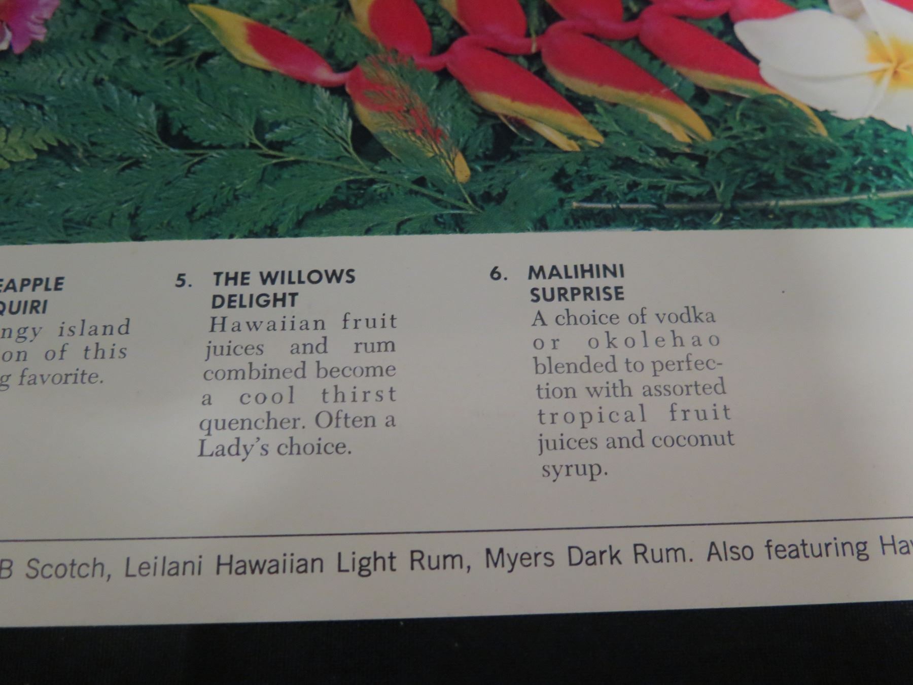 The Willows Hawaii's Famous Garden Restaurant Cocktail Menu 16"x14"
