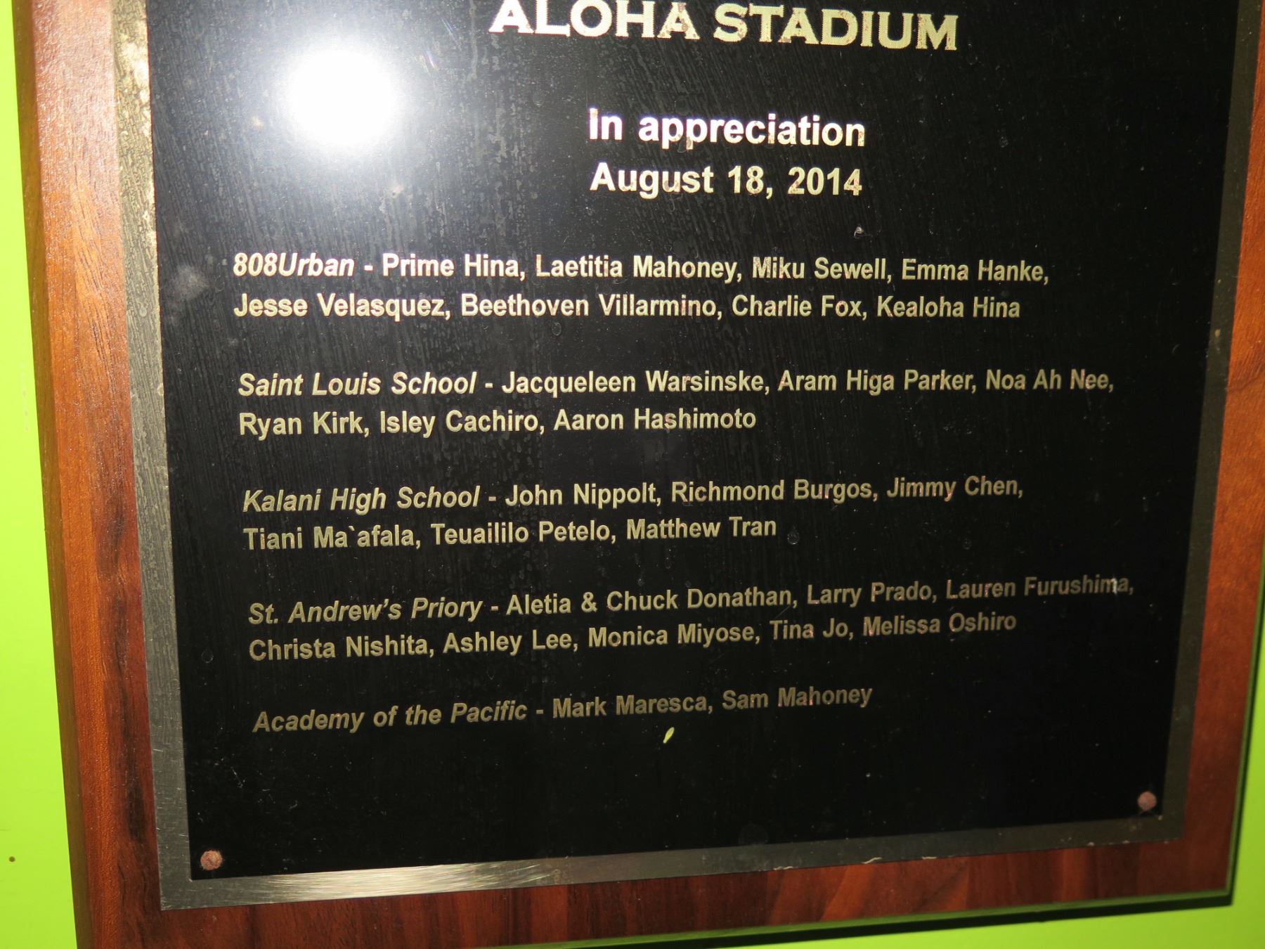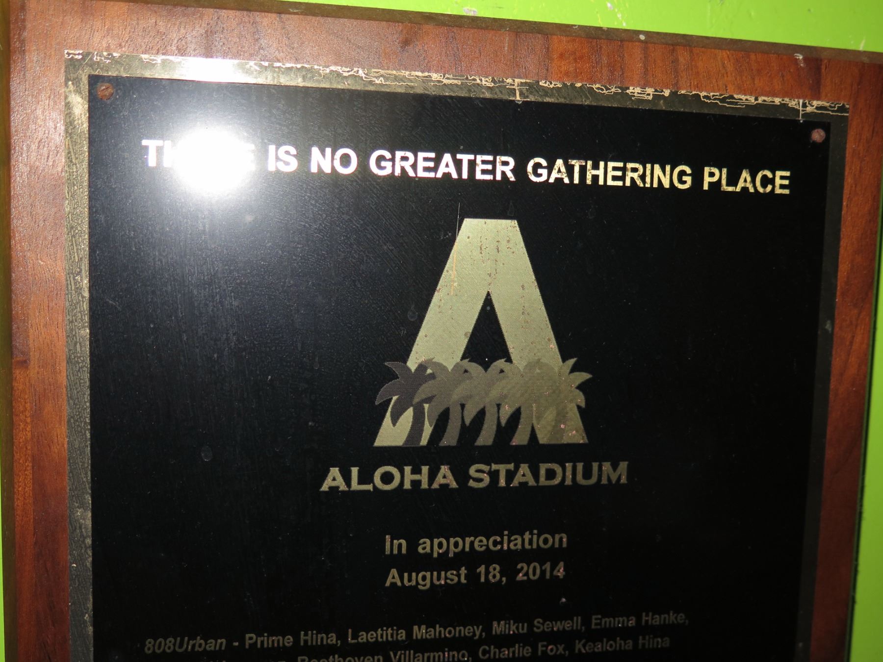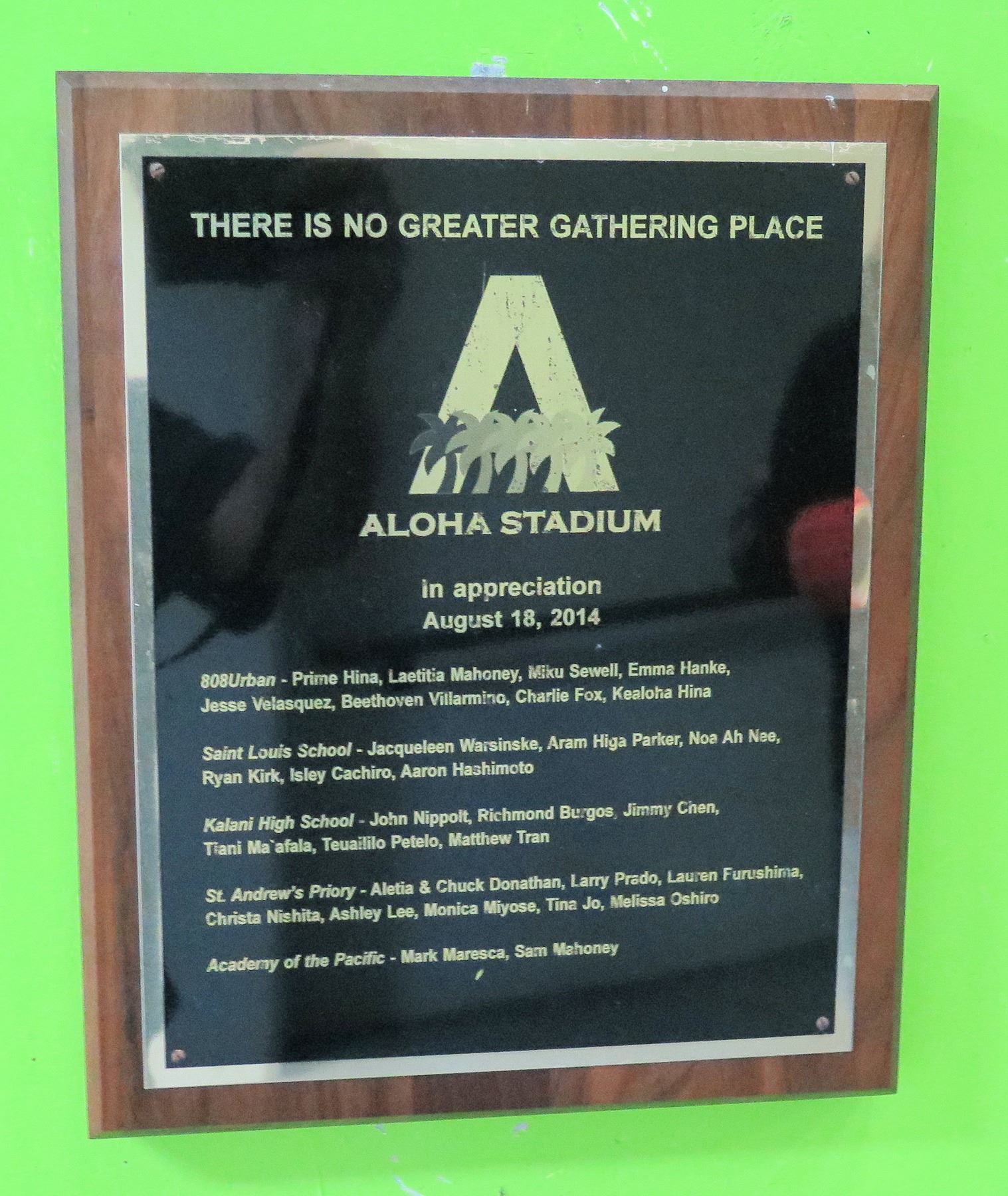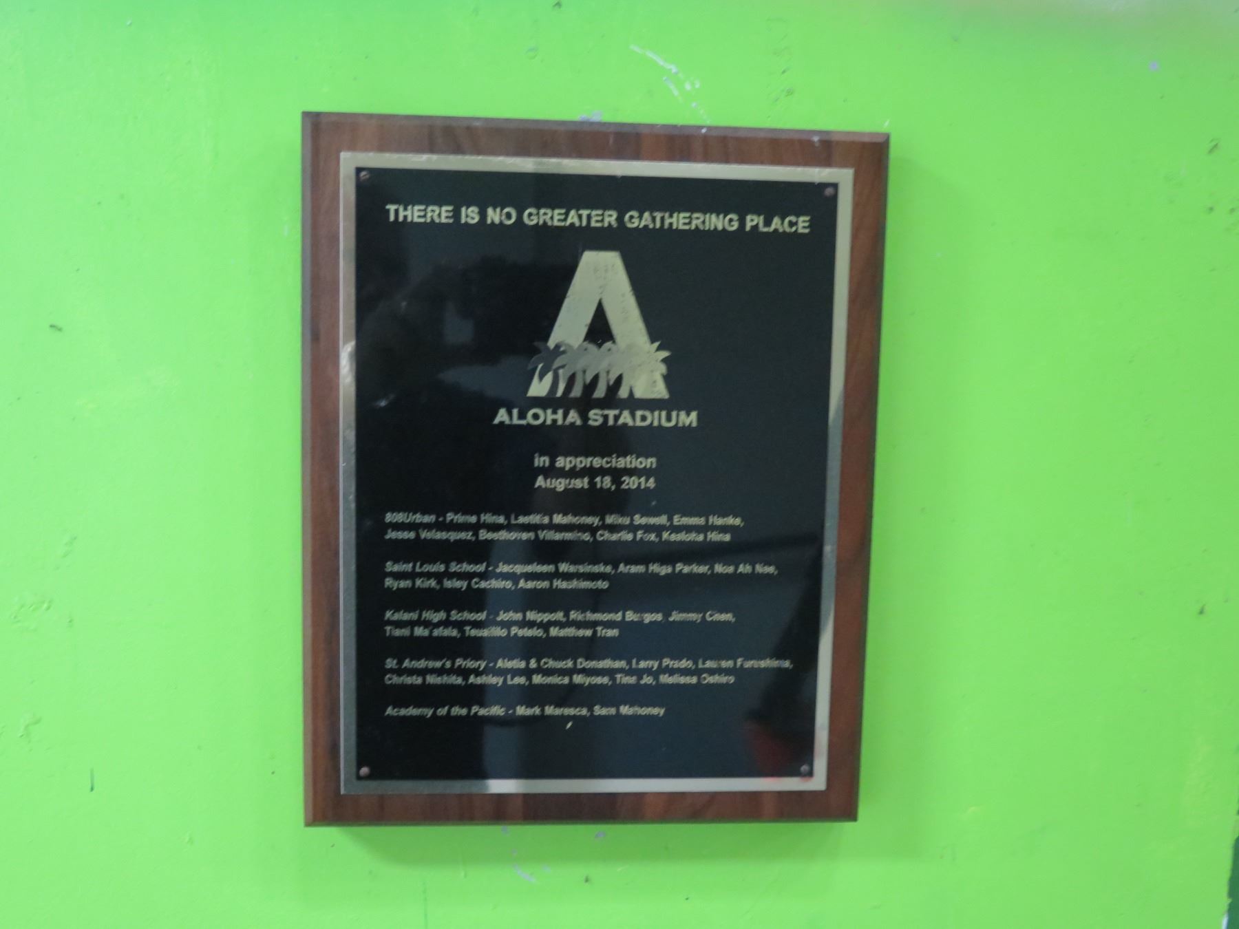 There is no Greater Gathering Place Aloha Stadium Appreciation 2014 Plaque 10"x13". Note: Signs will be removed if hanging prior to pick up