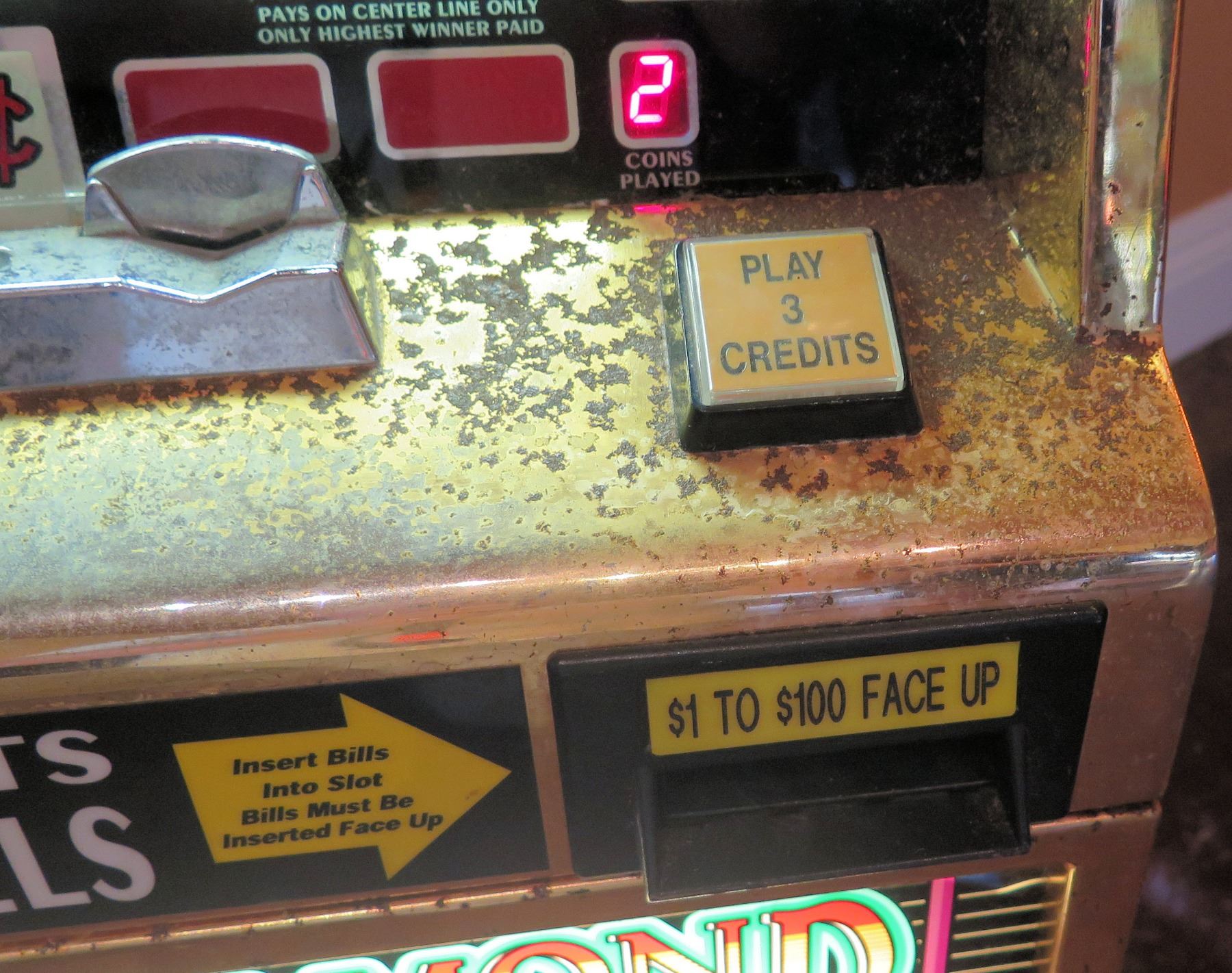 Triple Diamond 25-Cent Slot Machine. Has corrosion. Works intermittently.