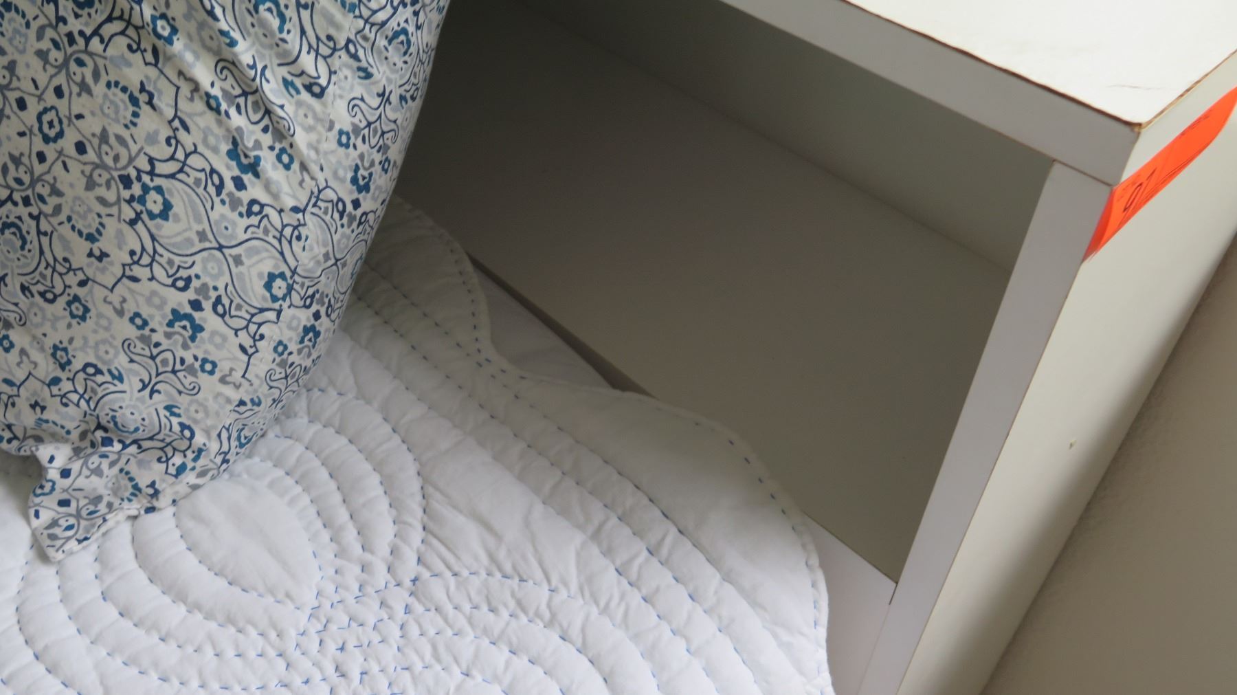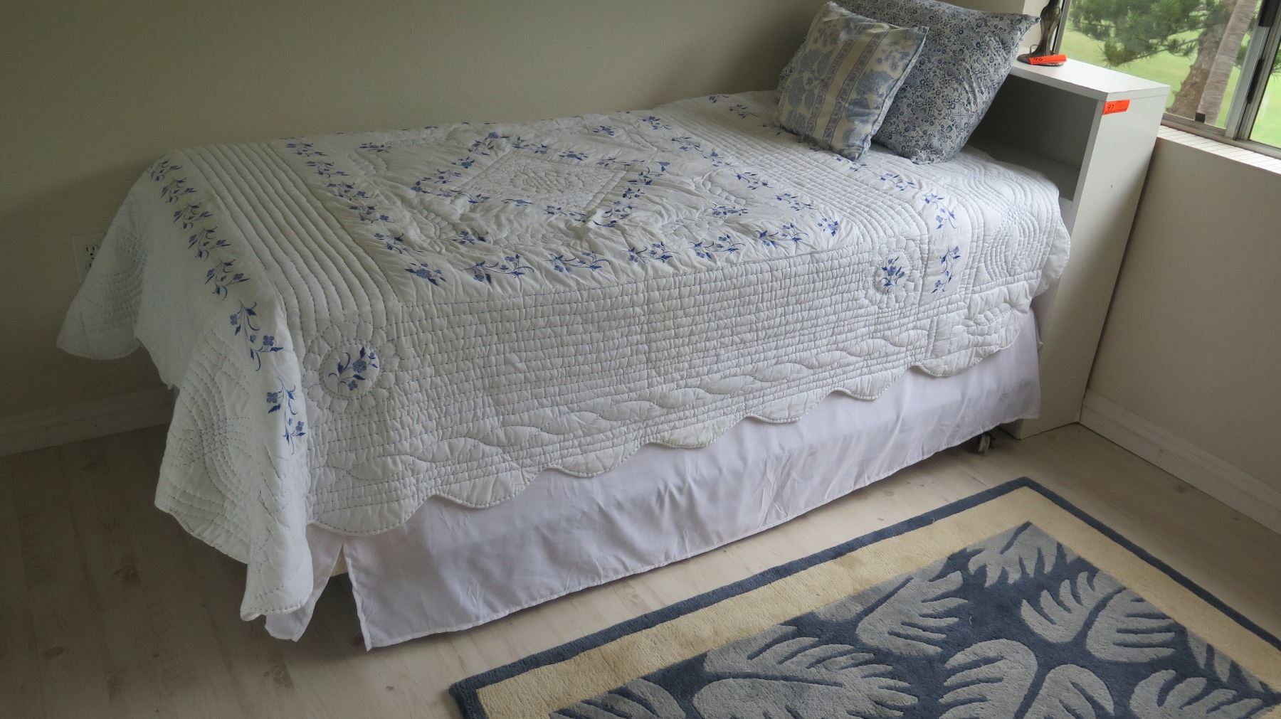 Twin Bed w/White Shelf Headboard, Mattress & Box Spring (6' X 3'1), Quilted Coverlet, Matress Protector