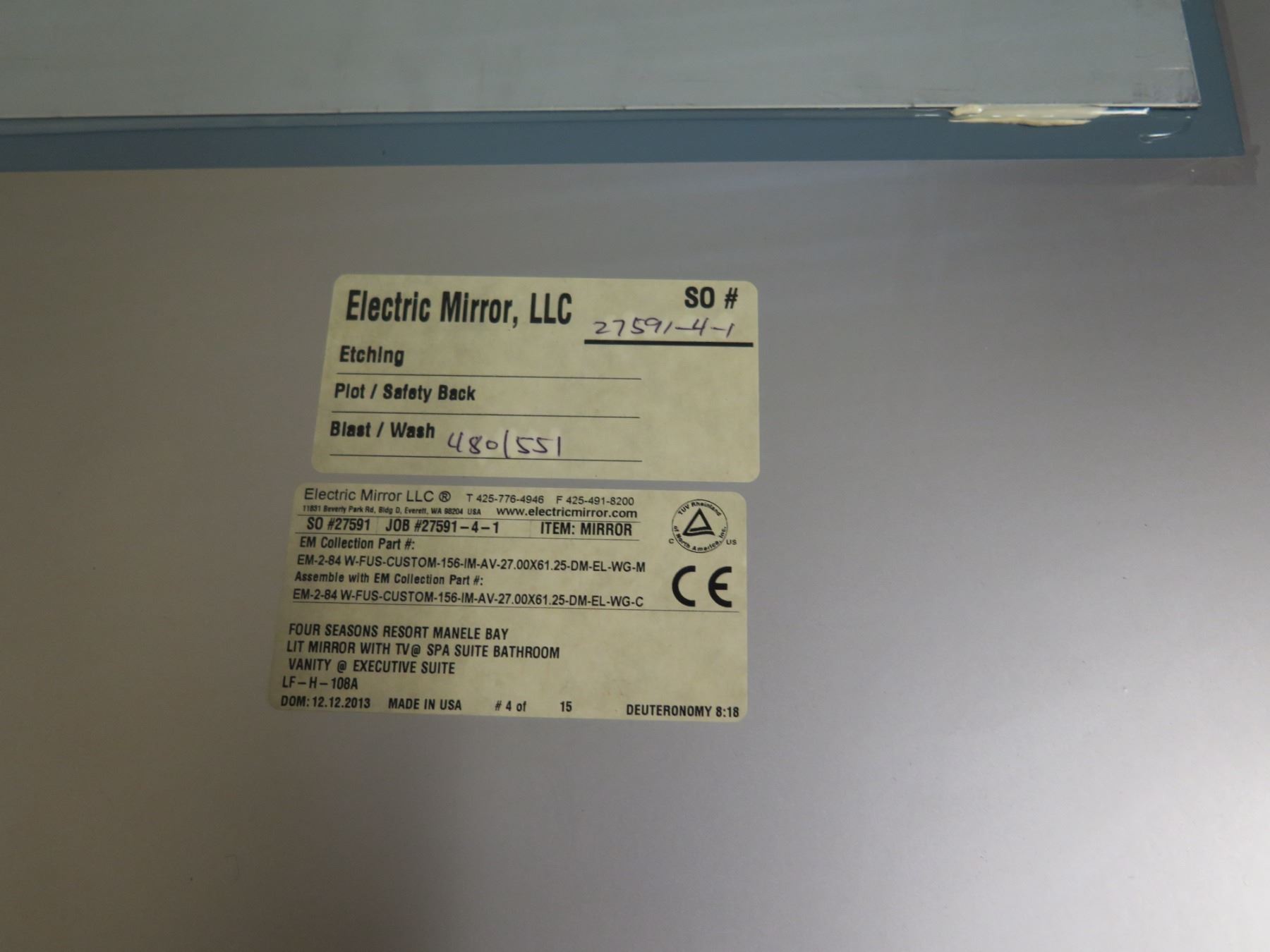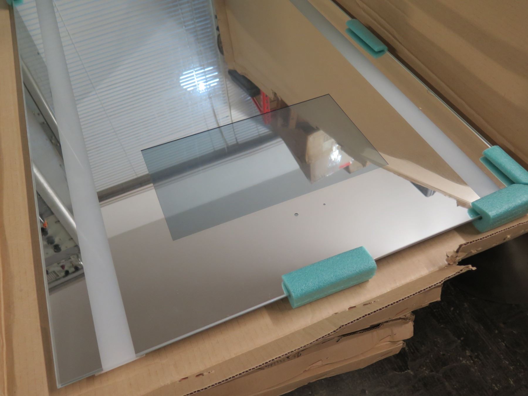 Unused Electric Mirror, LLC. Lighted Hospitality TV Mirror w/ Built in 15.6" LCD TV, 26"x62" Overall. There's indication on the box that these were too large for the designated space (i.e. spa suite bathroom). This has not been previously installed and appears to be unused.