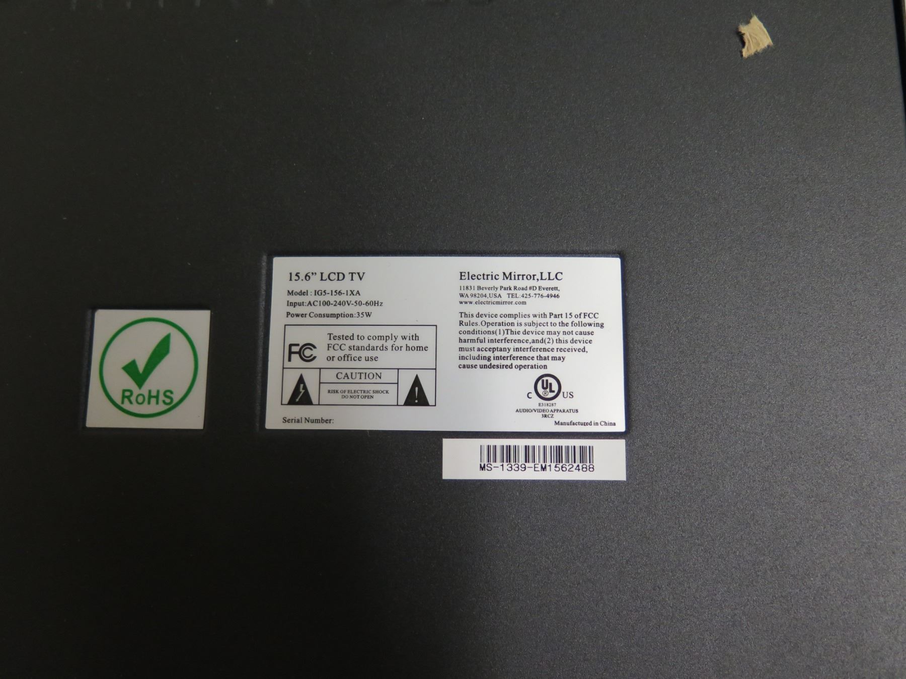 Unused Electric Mirror, LLC. Lighted Hospitality TV Mirror w/ Built in 15.6" LCD TV, 26"x62" Overall. There's indication on the box that these were too large for the designated space (i.e. spa suite bathroom). This has not been previously installed and appears to be unused.