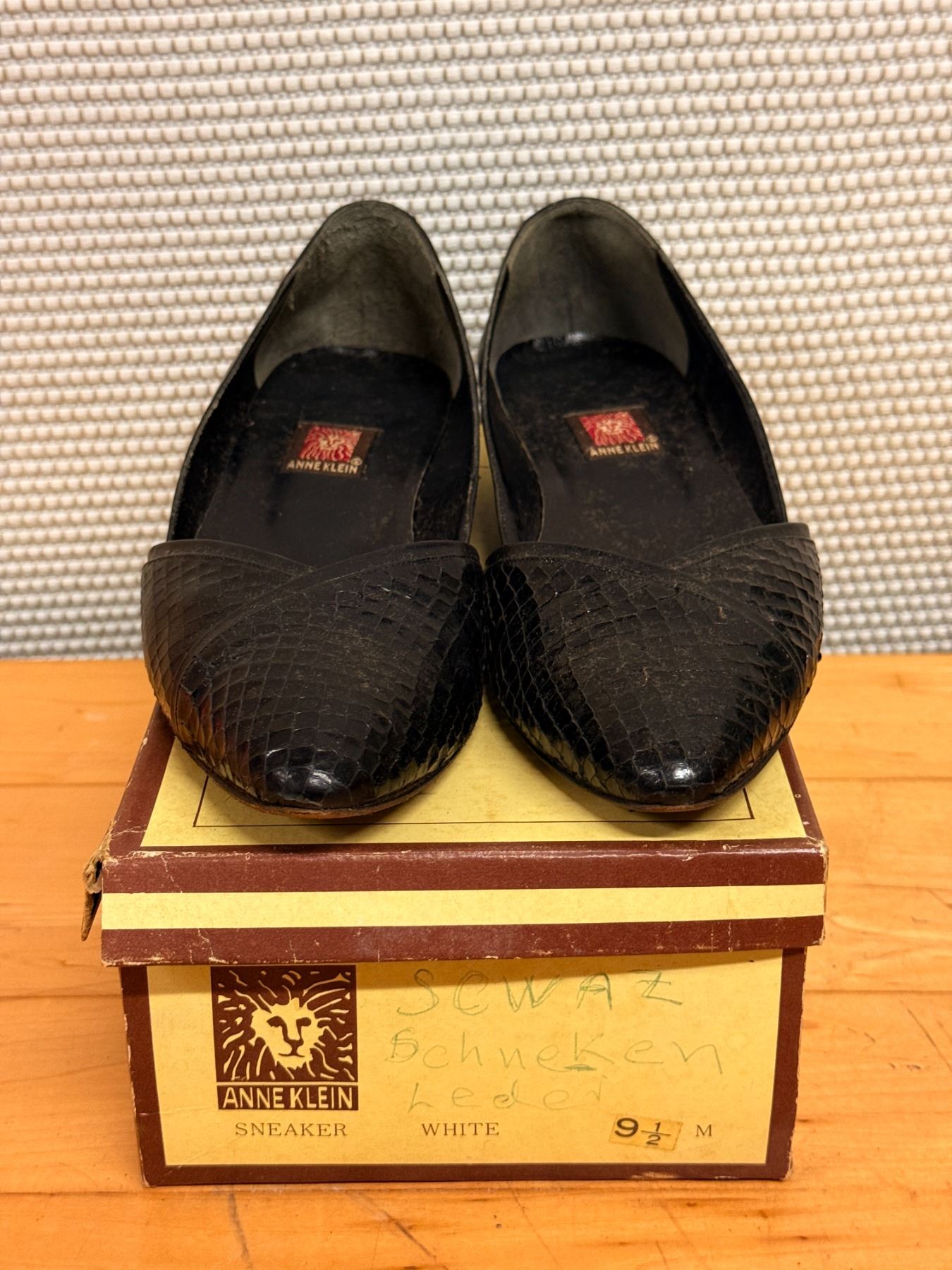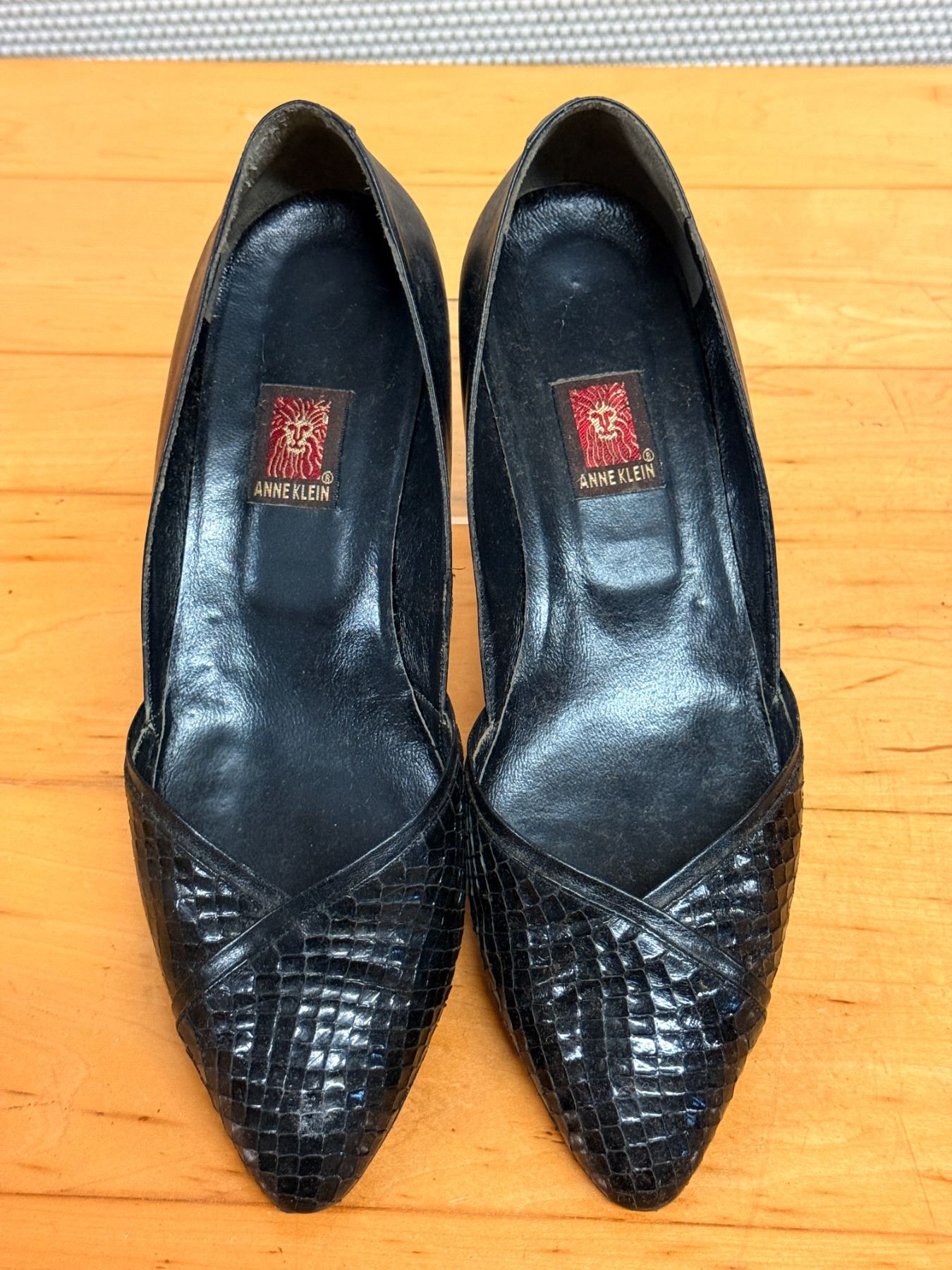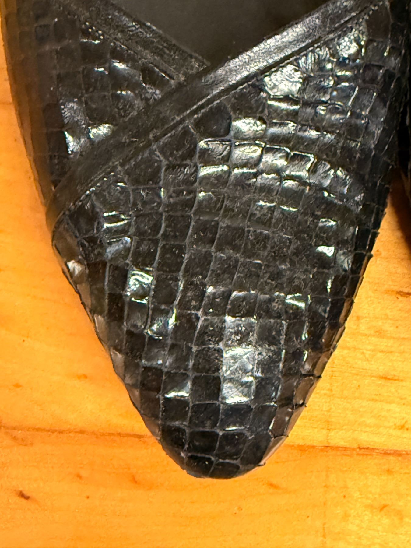Chic Anne Klein flats featuring black snakeskin-embossed leather with a pointed toe for a sleek, modern look. Lightly cushioned insoles and a classic slip-on design make them easy to wear. Stylish and versatile for work or everyday outfits.