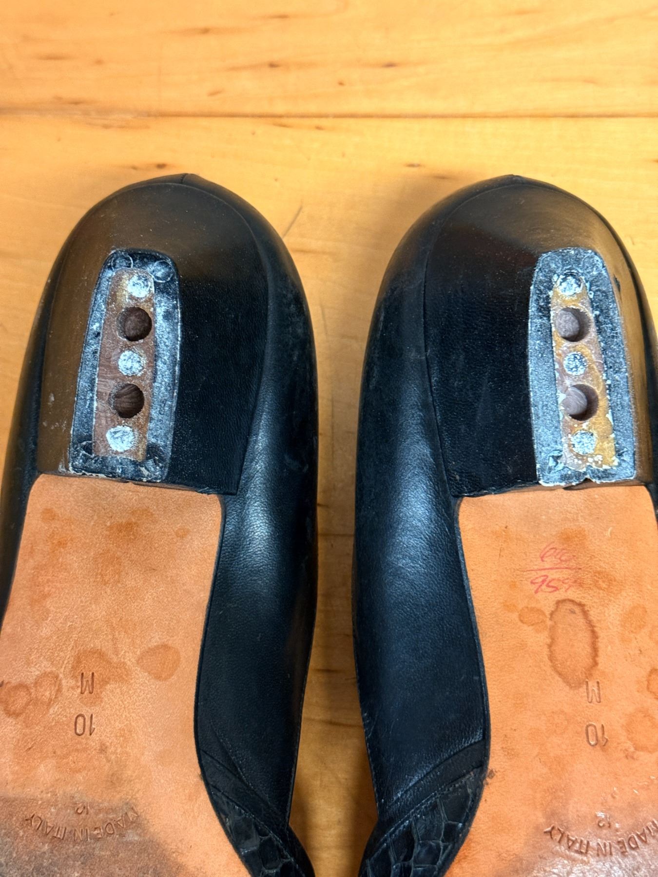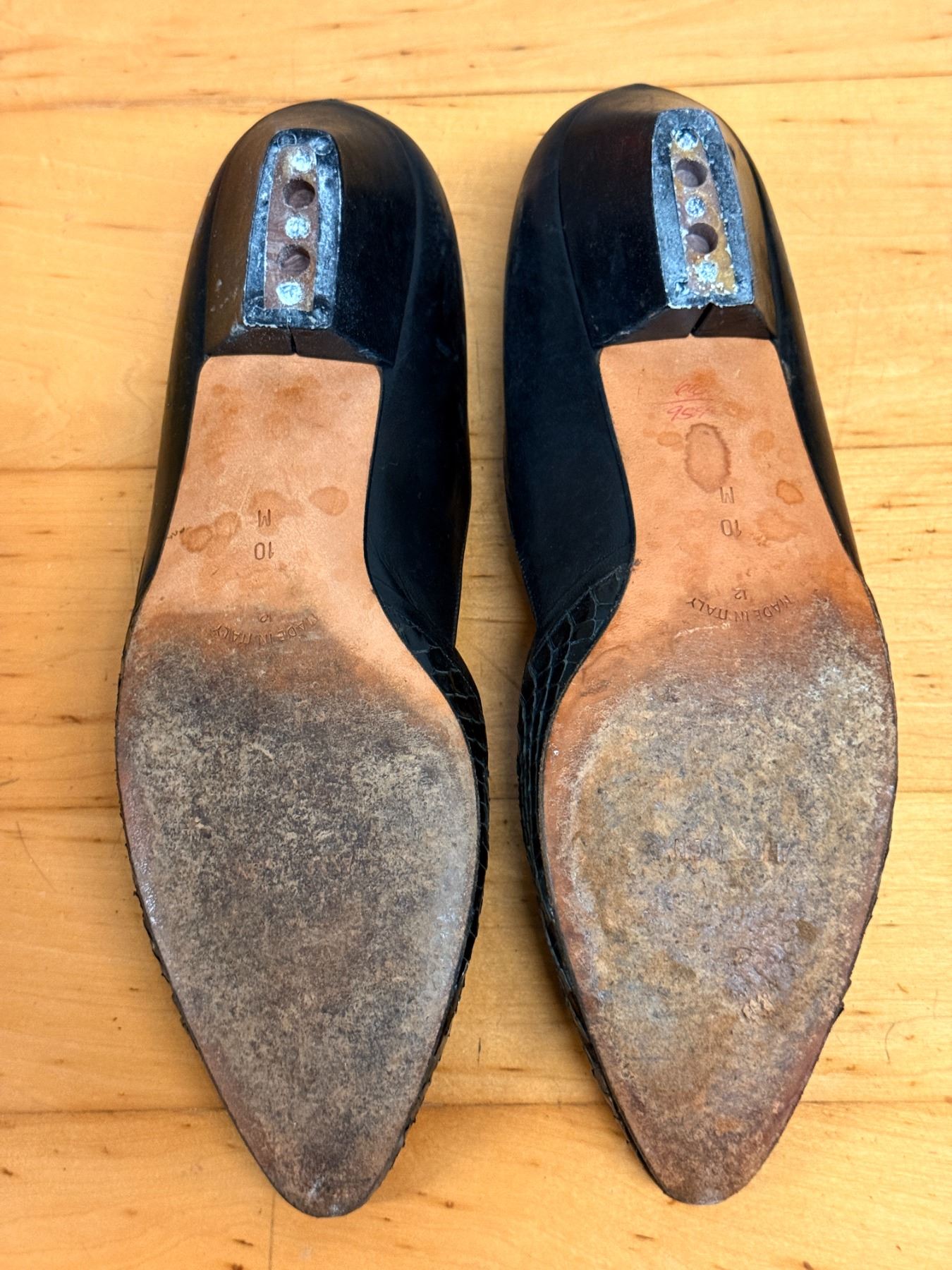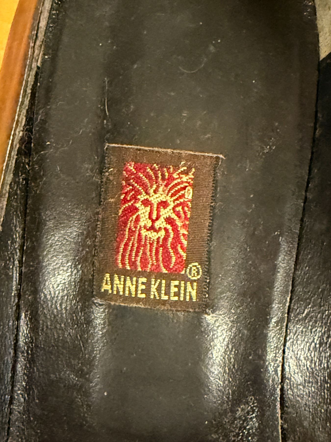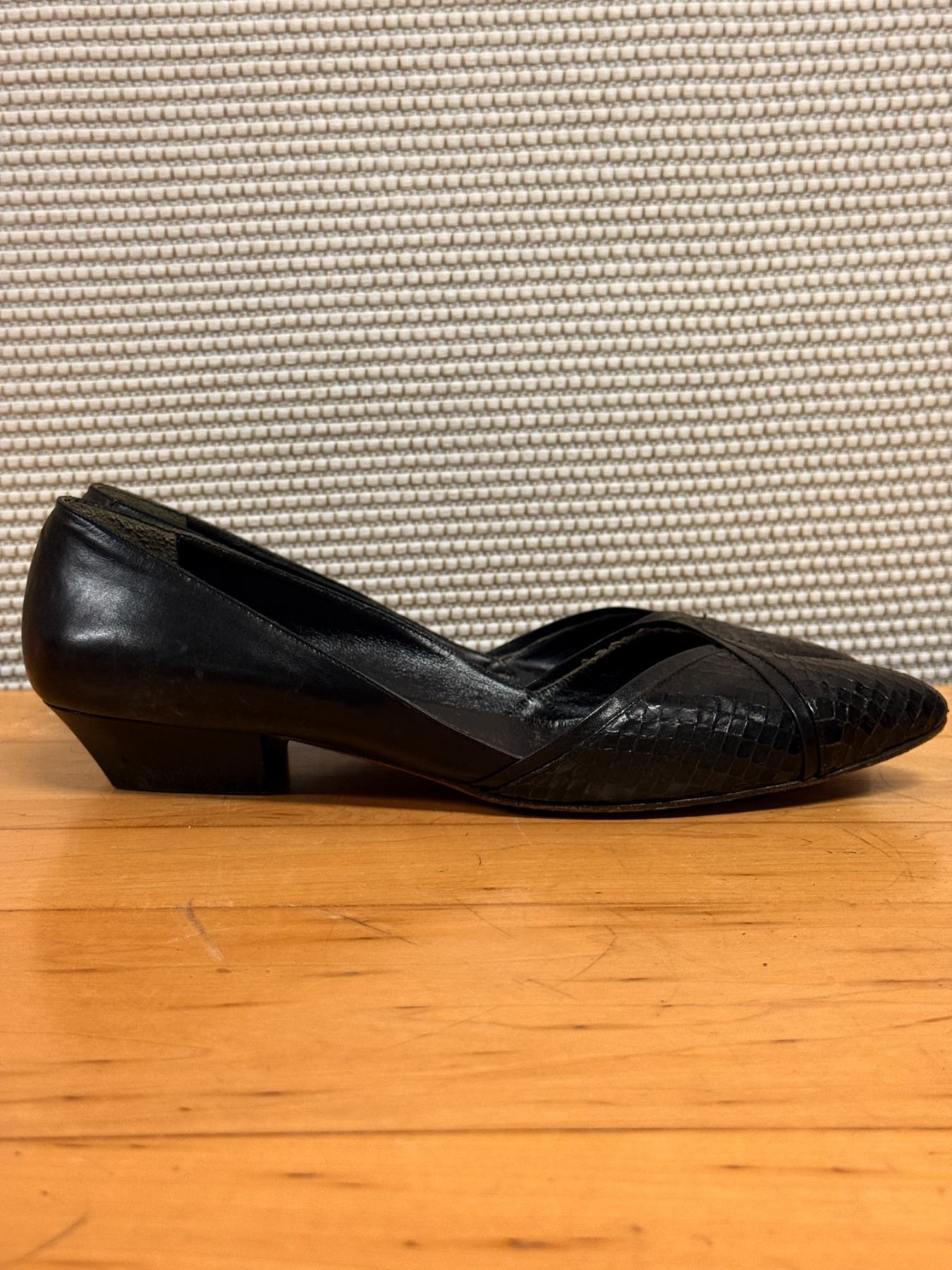 Chic Anne Klein flats featuring black snakeskin-embossed leather with a pointed toe for a sleek, modern look. Lightly cushioned insoles and a classic slip-on design make them easy to wear. Stylish and versatile for work or everyday outfits.