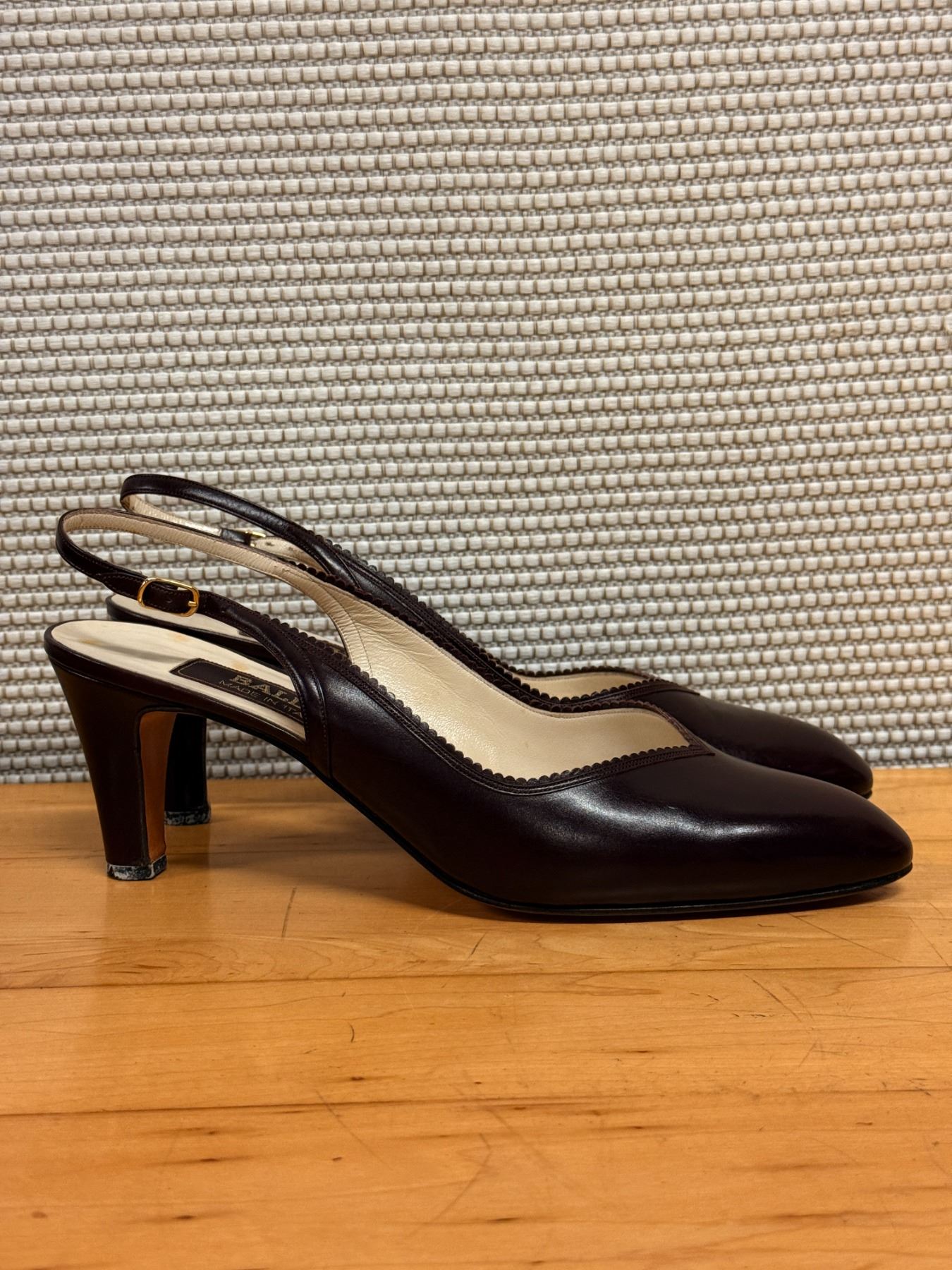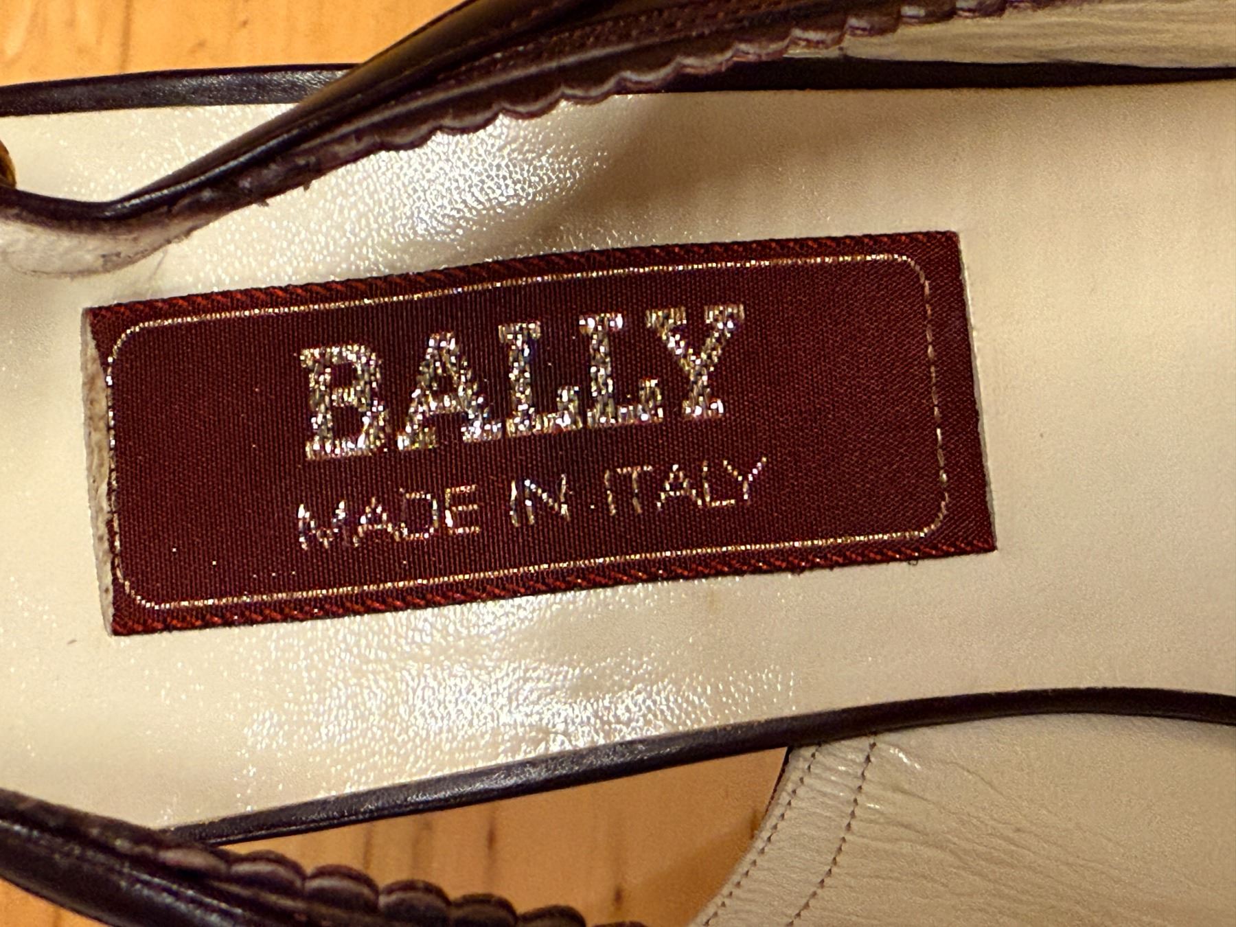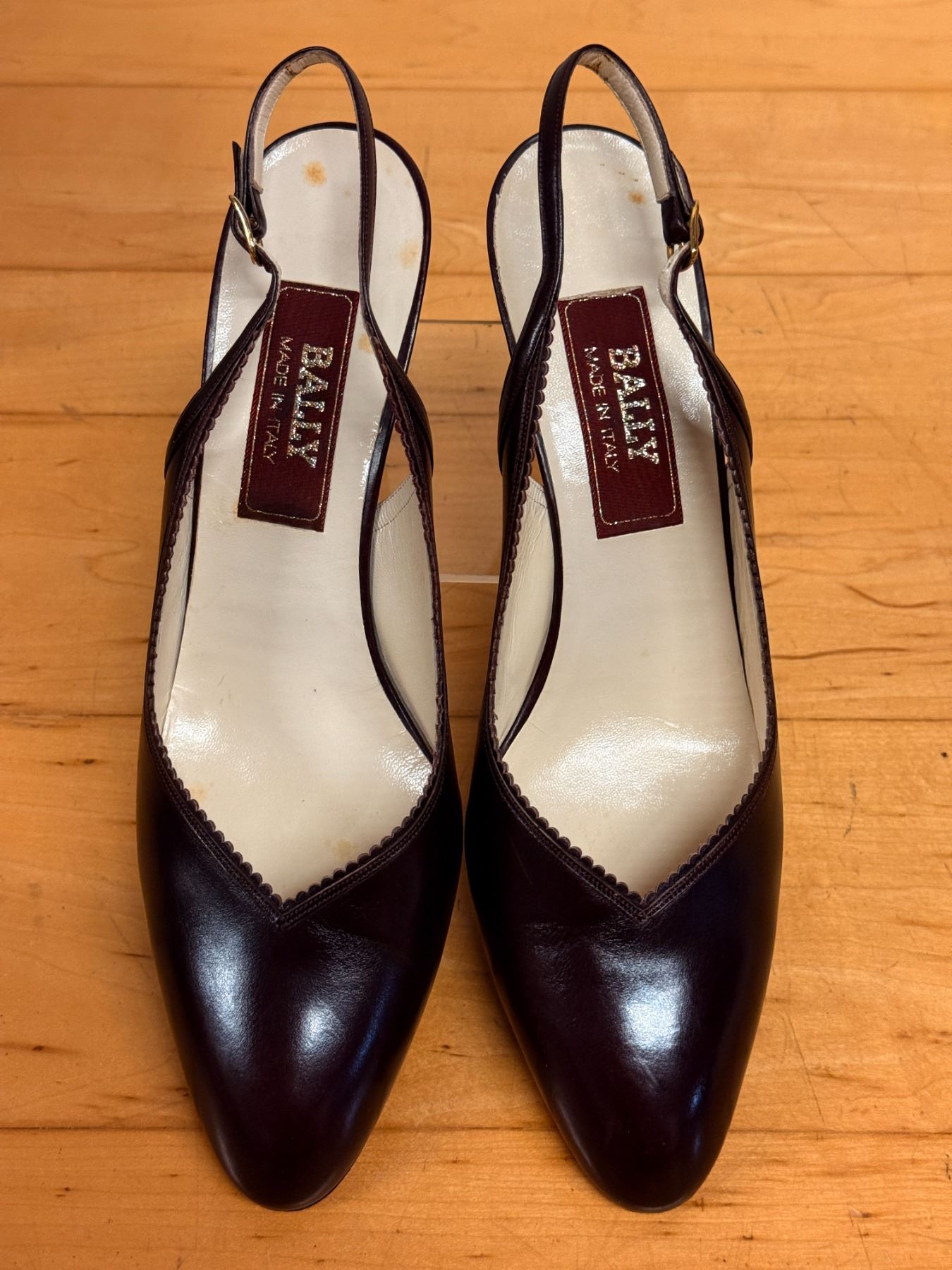 Elegant Bally slingback heels in deep maroon leather with a pointed toe and scalloped trim. Features a classic Italian-made design, slim strap with gold buckle, and lightly worn insoles. Timeless, polished, and perfect for dressy or work looks.