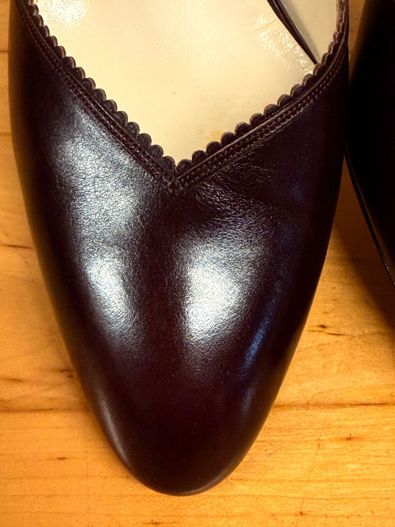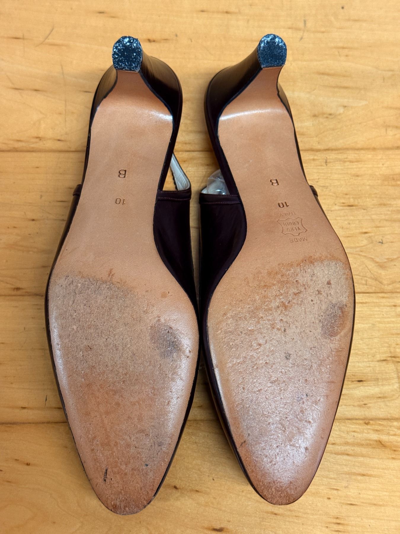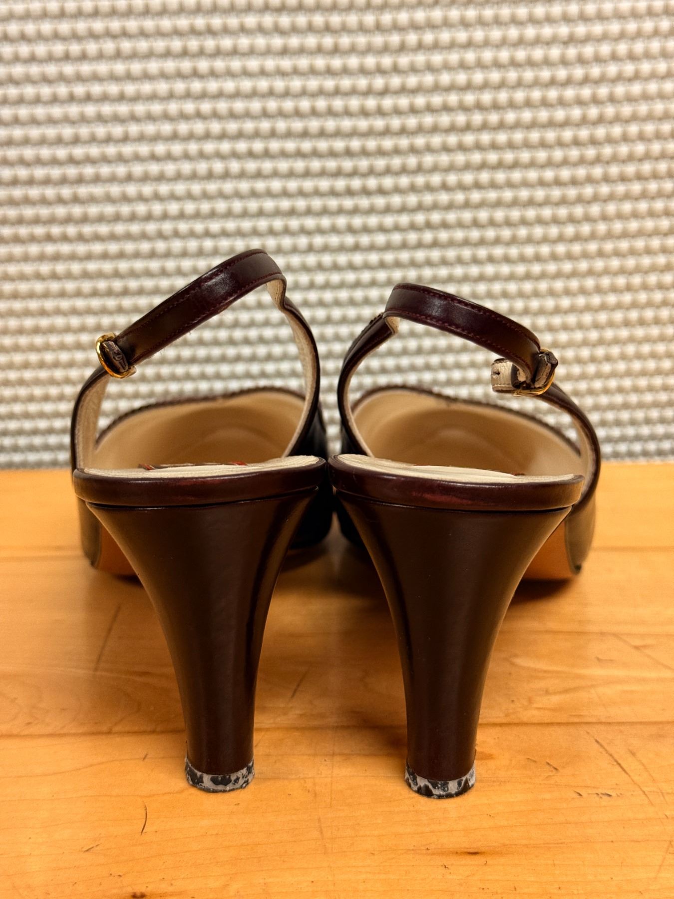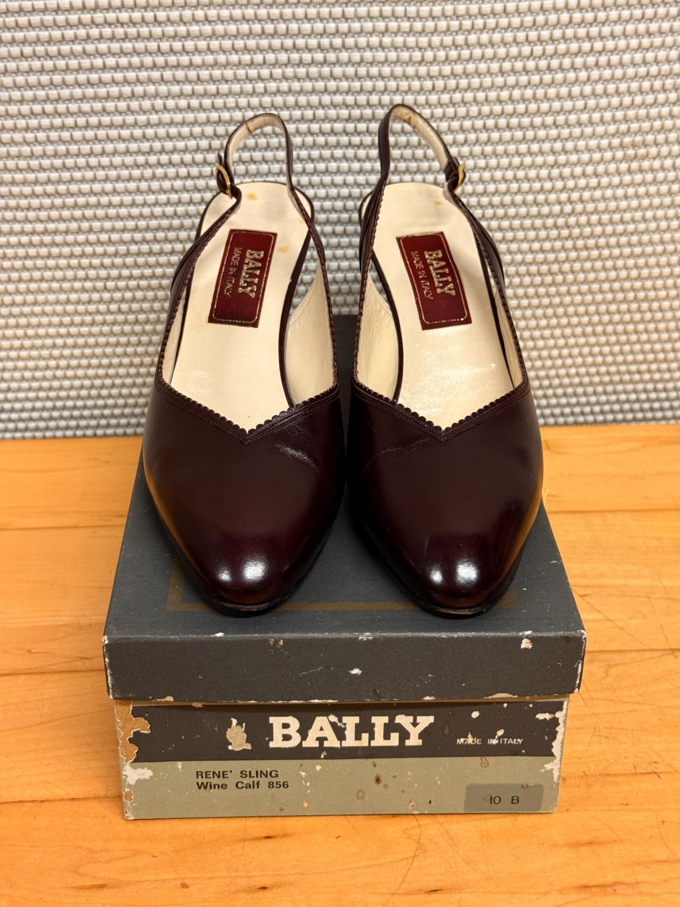 Elegant Bally slingback heels in deep maroon leather with a pointed toe and scalloped trim. Features a classic Italian-made design, slim strap with gold buckle, and lightly worn insoles. Timeless, polished, and perfect for dressy or work looks.