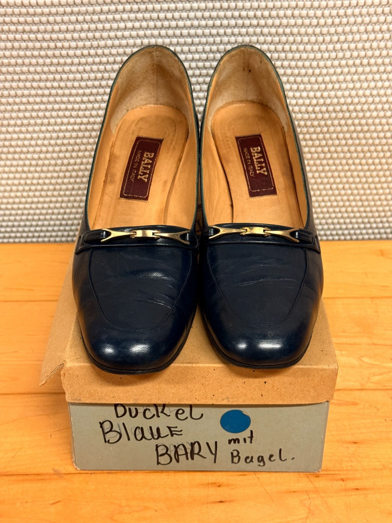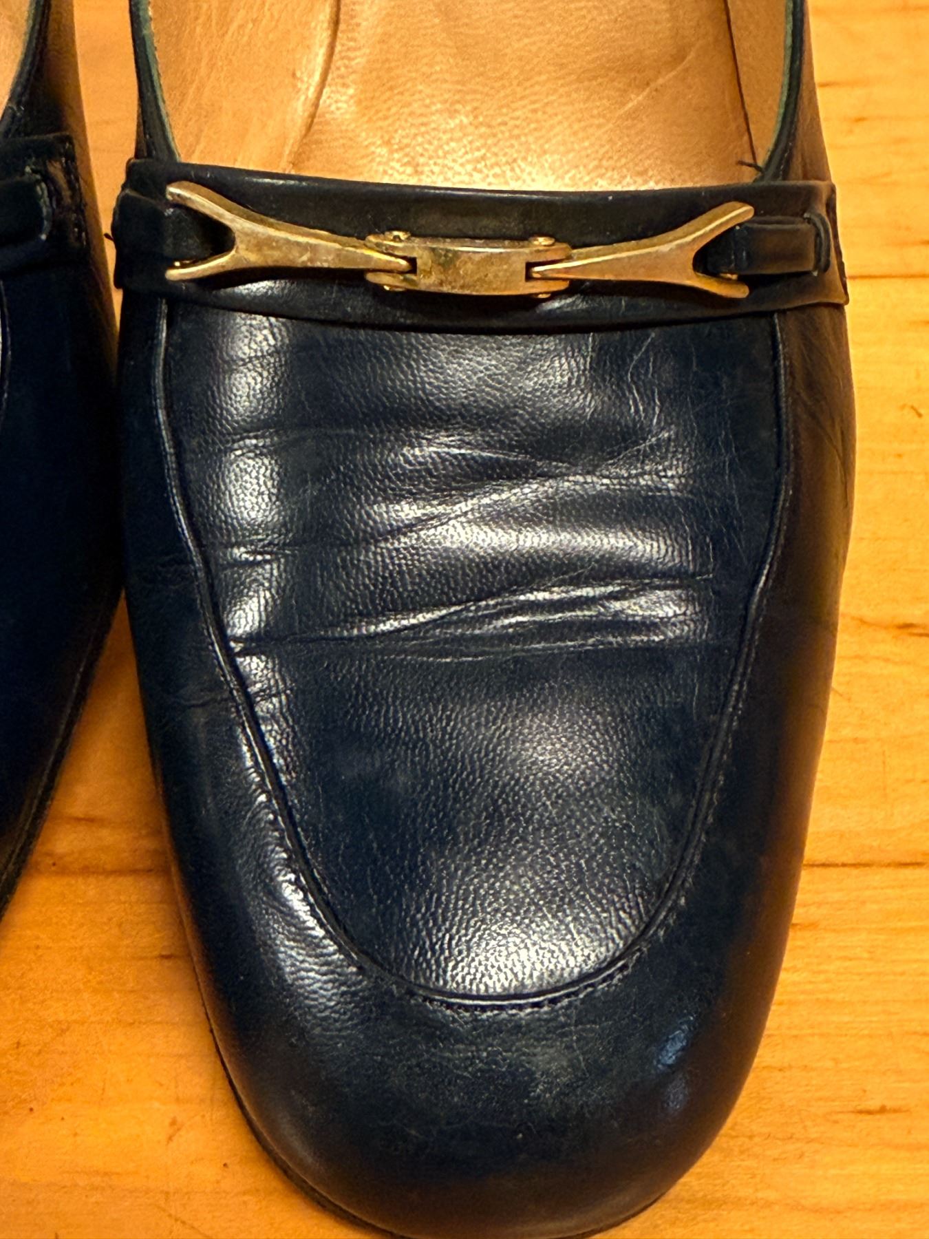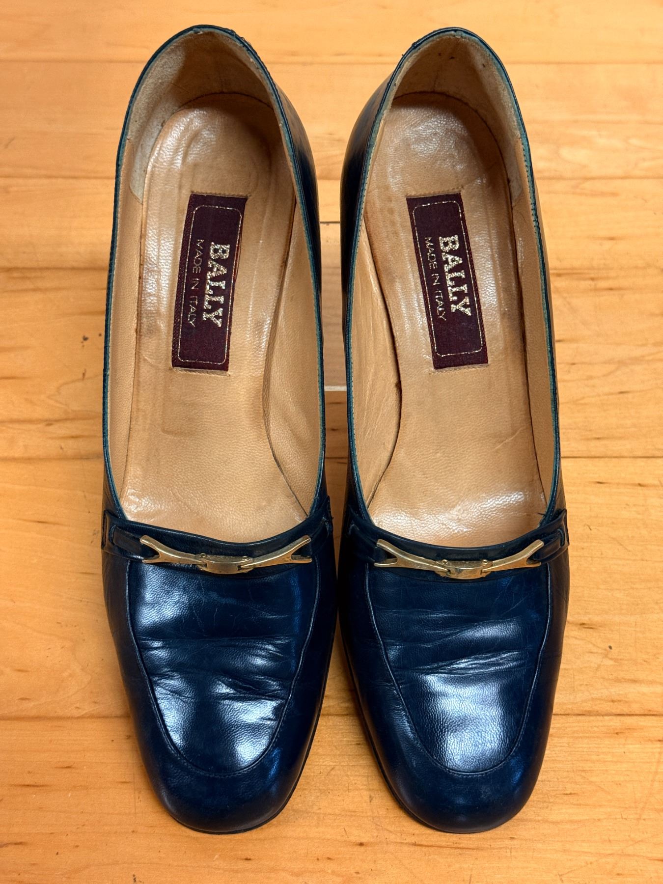 Classic Bally loafers in deep navy leather with sleek gold bar detailing. Features a structured square toe, leather lining, and timeless Italian craftsmanship. Light wear from storage but overall well-kept. Perfect for polished everyday or office looks.