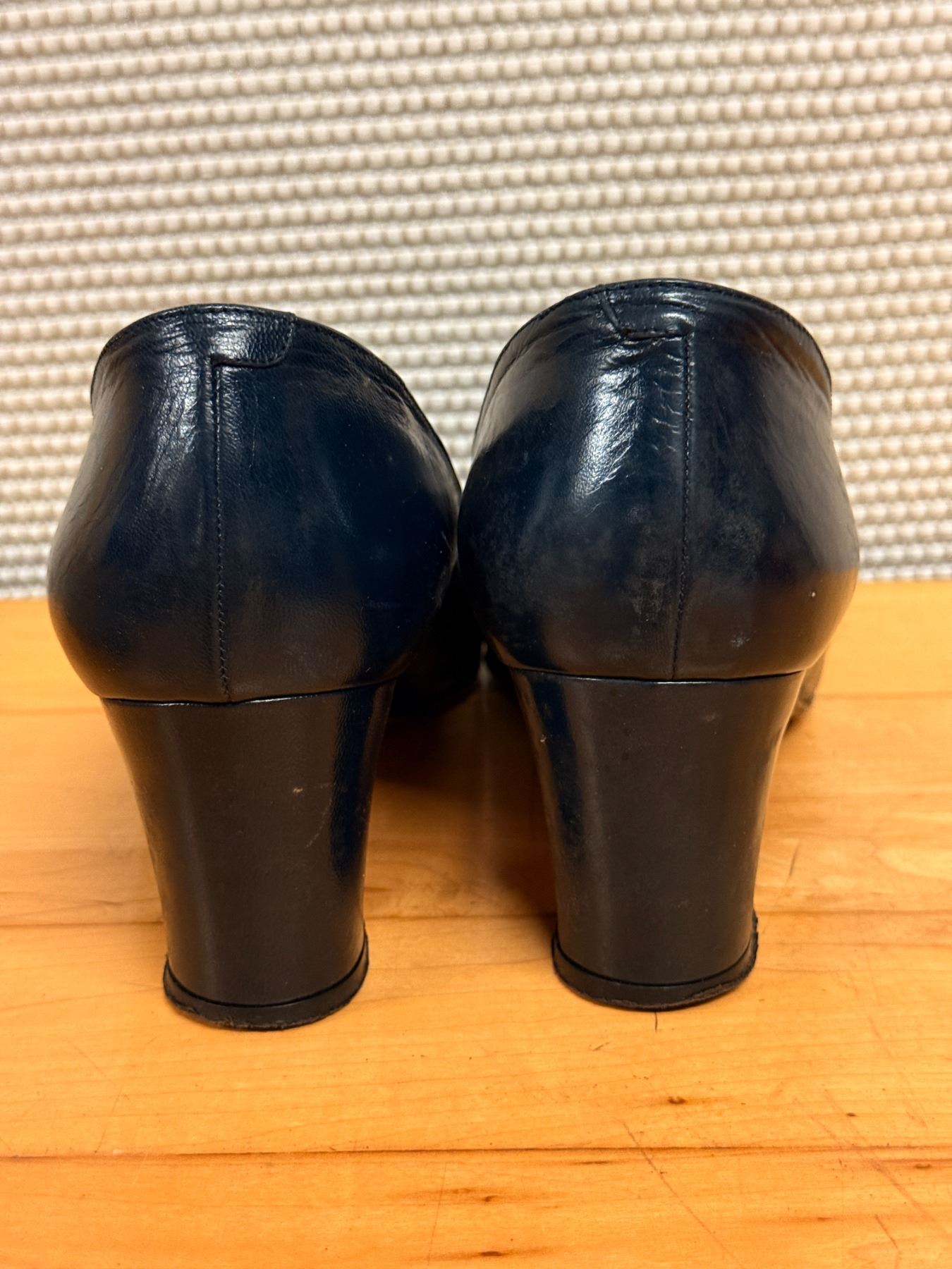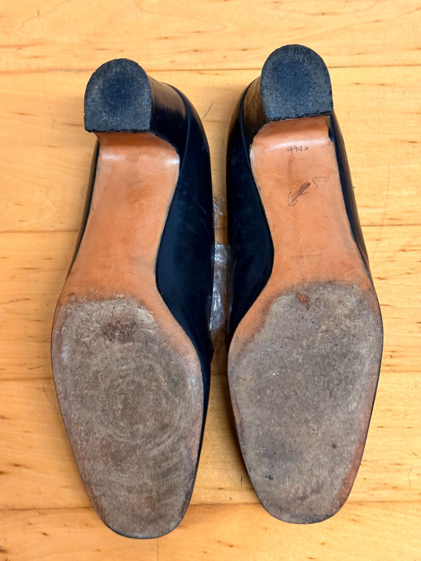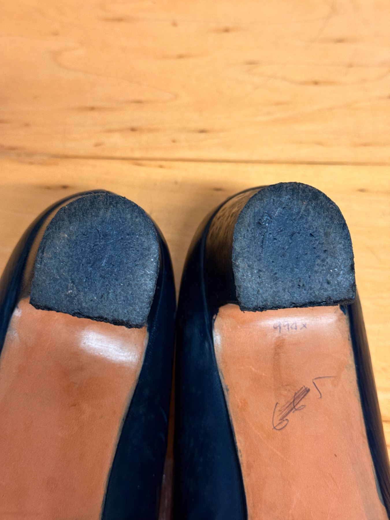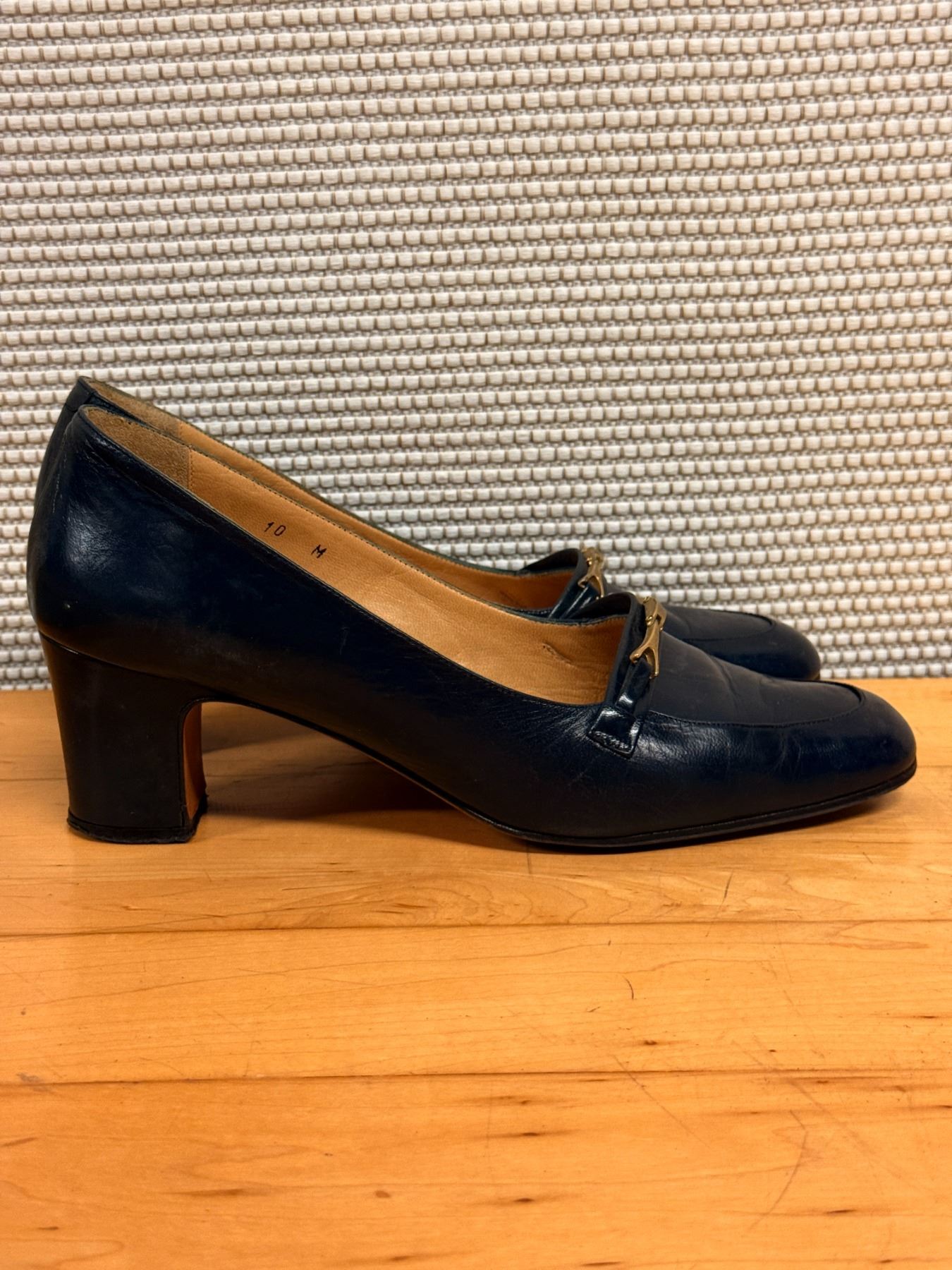 Classic Bally loafers in deep navy leather with sleek gold bar detailing. Features a structured square toe, leather lining, and timeless Italian craftsmanship. Light wear from storage but overall well-kept. Perfect for polished everyday or office looks.