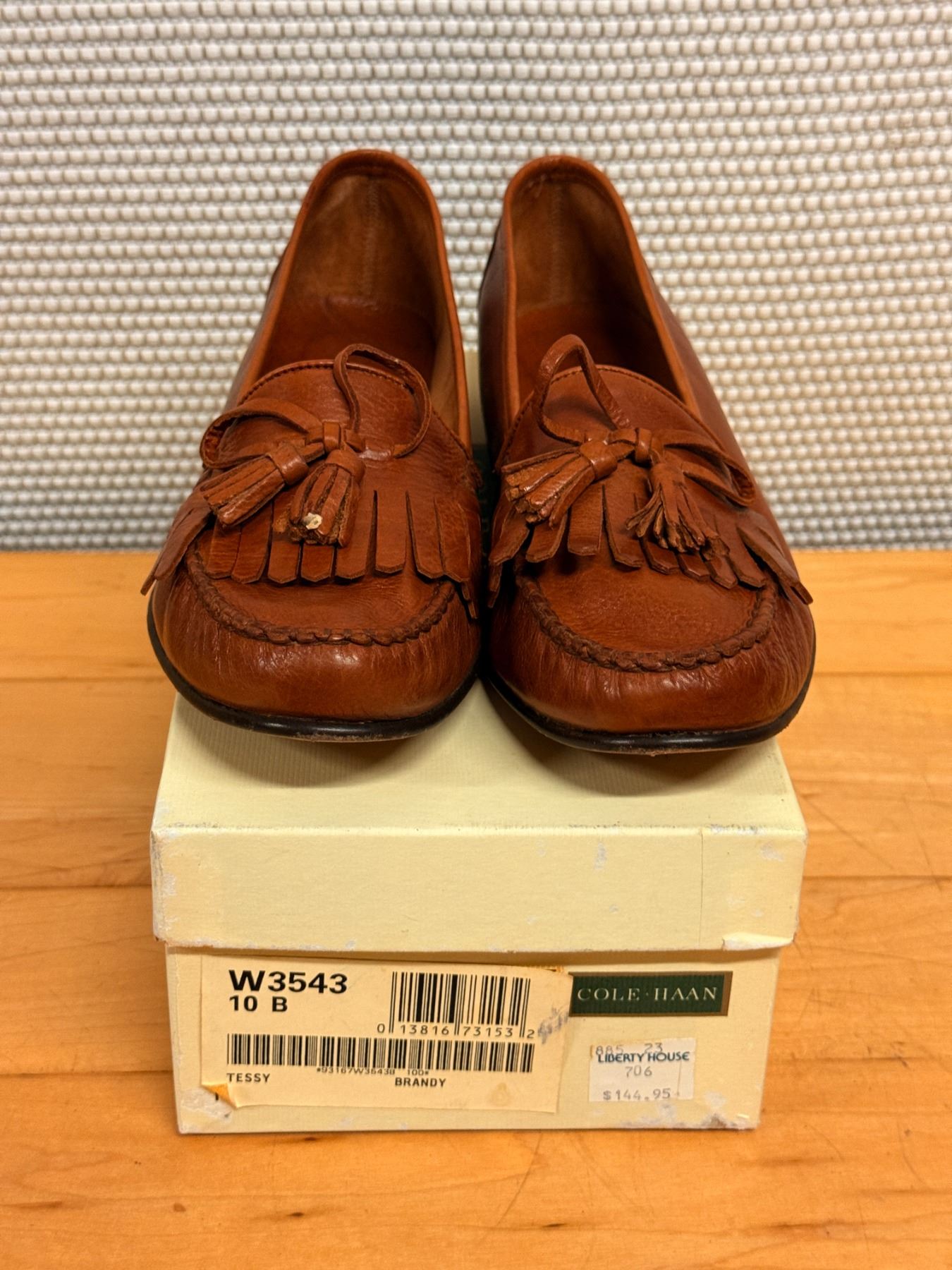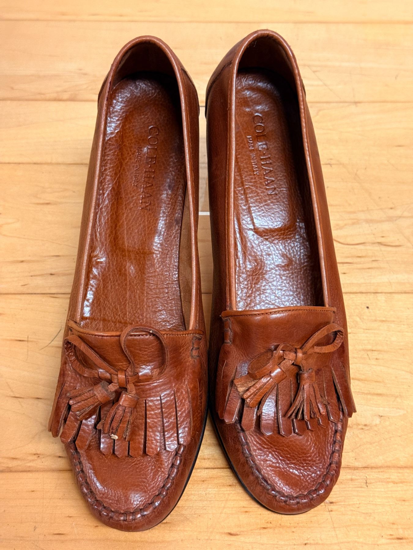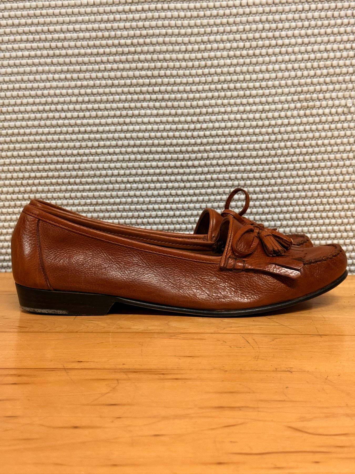 Soft brown leather moc-style flats with fringe and tassel detailing. Classic slip-on design with a relaxed, lived-in look. Shows wear on tassels and edges; priced accordingly.