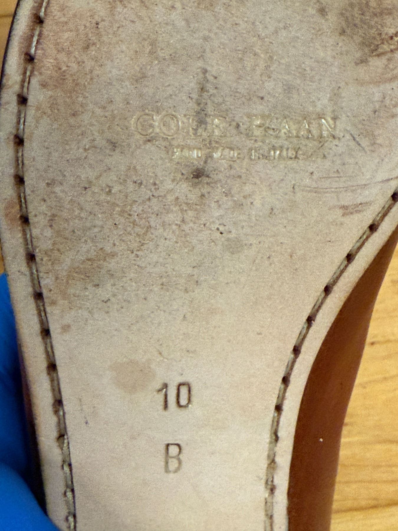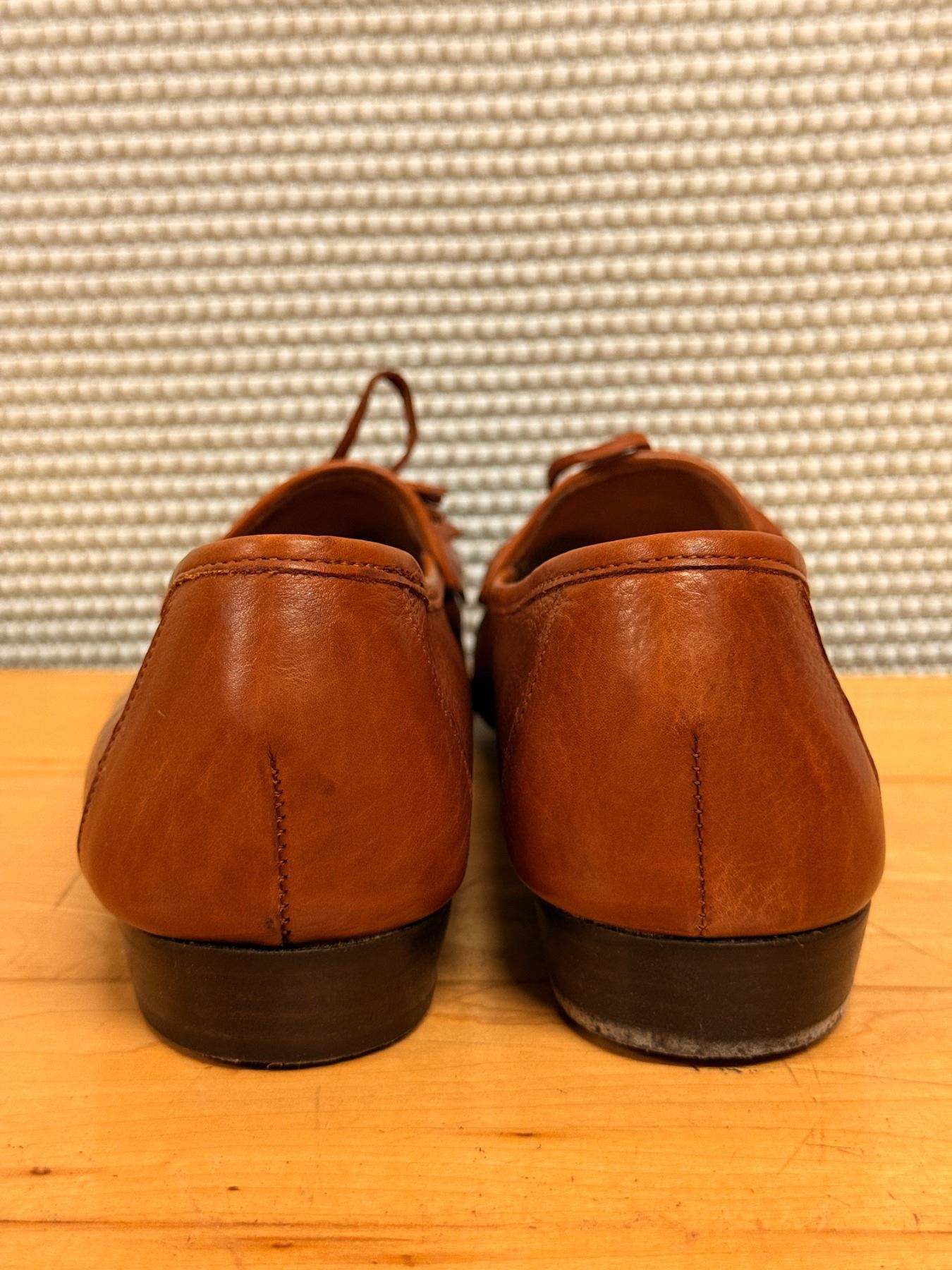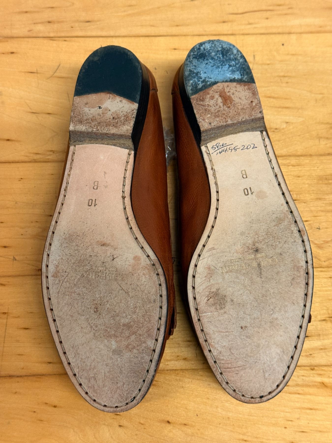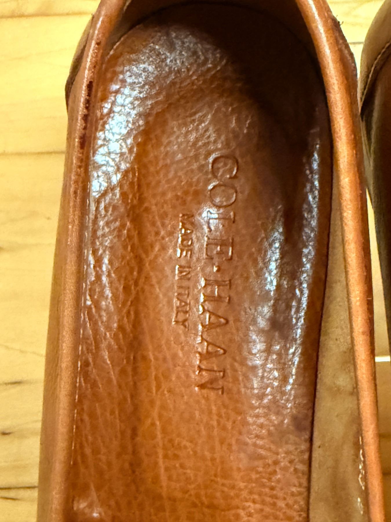 Soft brown leather moc-style flats with fringe and tassel detailing. Classic slip-on design with a relaxed, lived-in look. Shows wear on tassels and edges; priced accordingly.