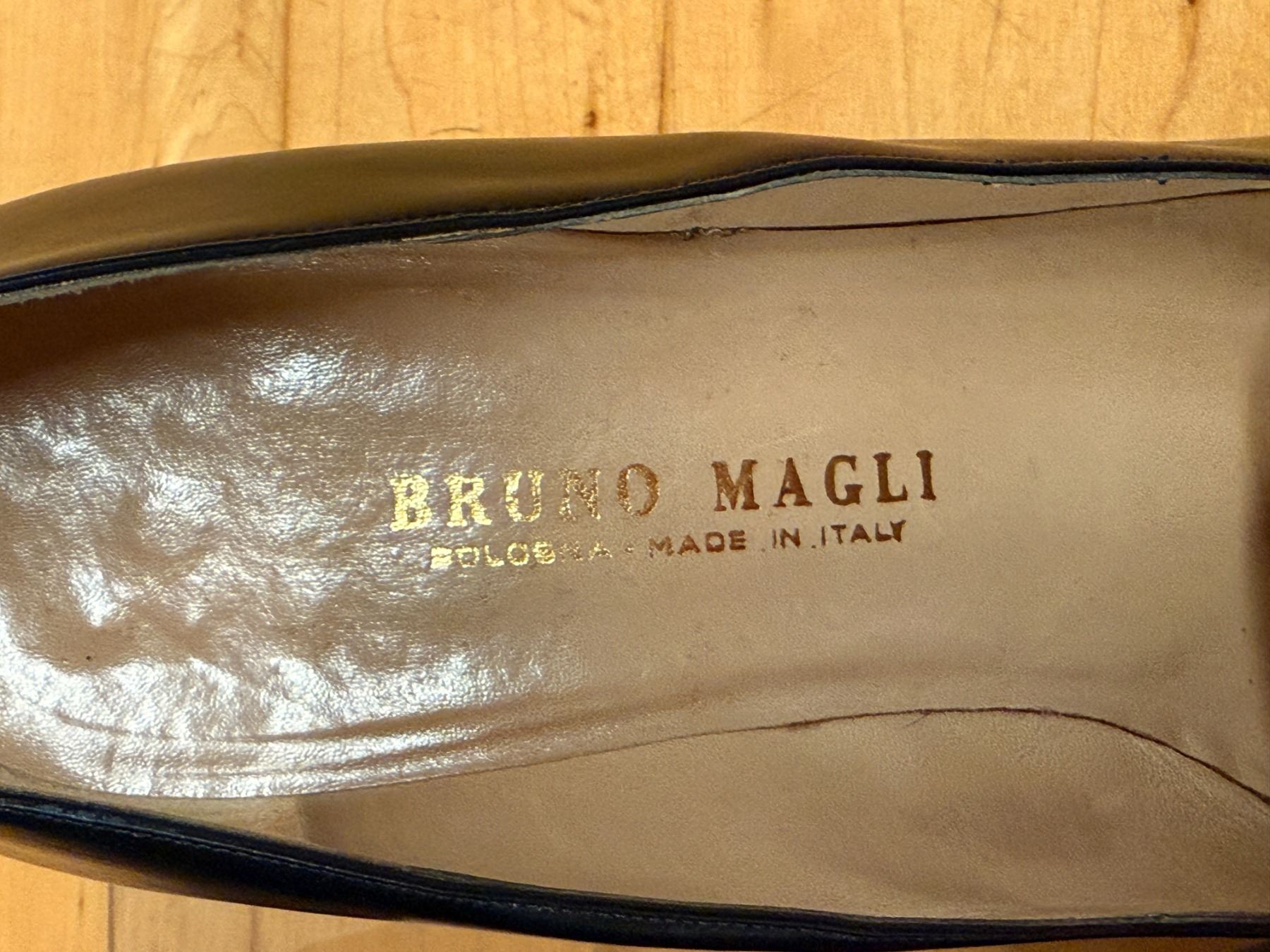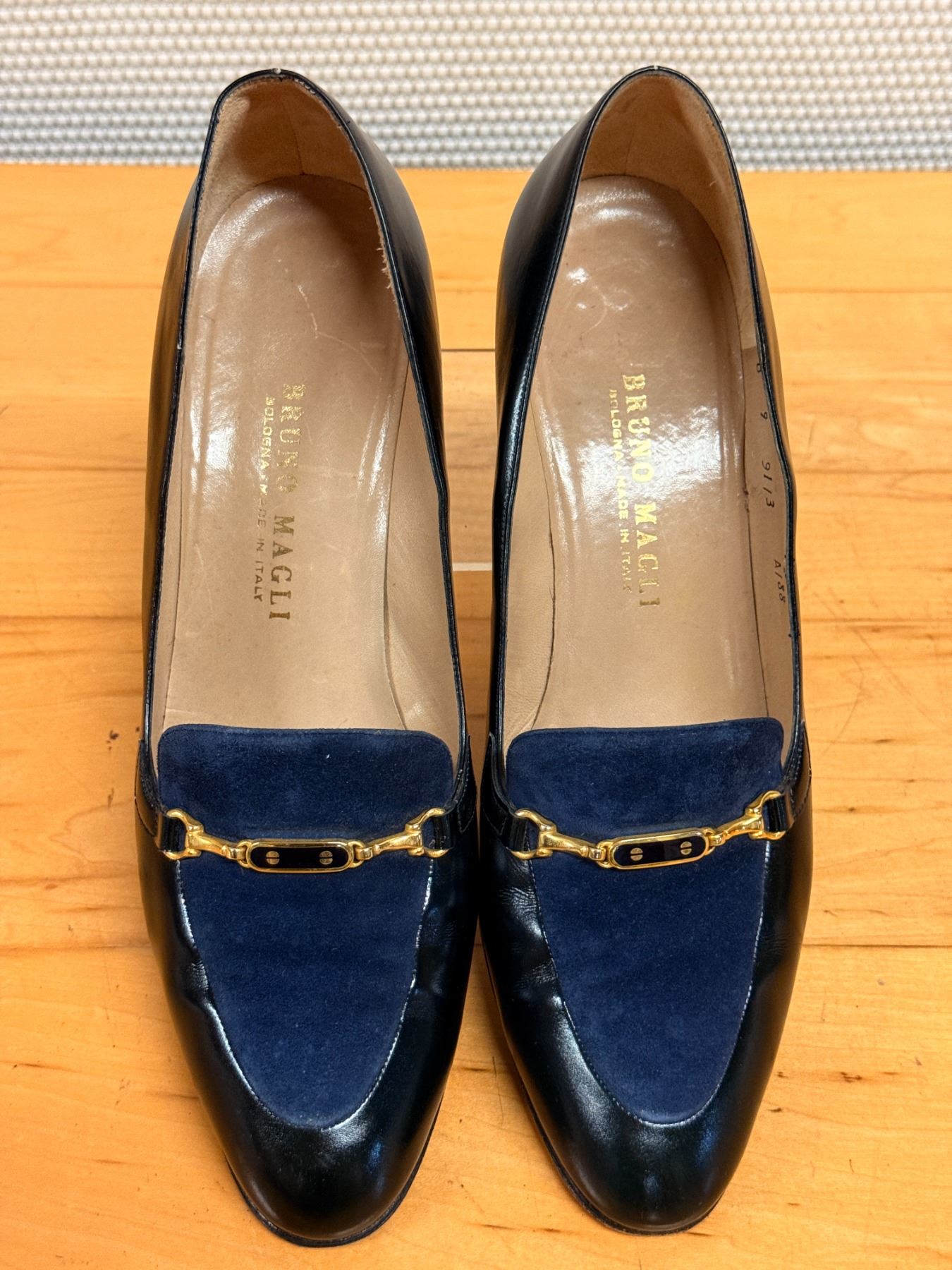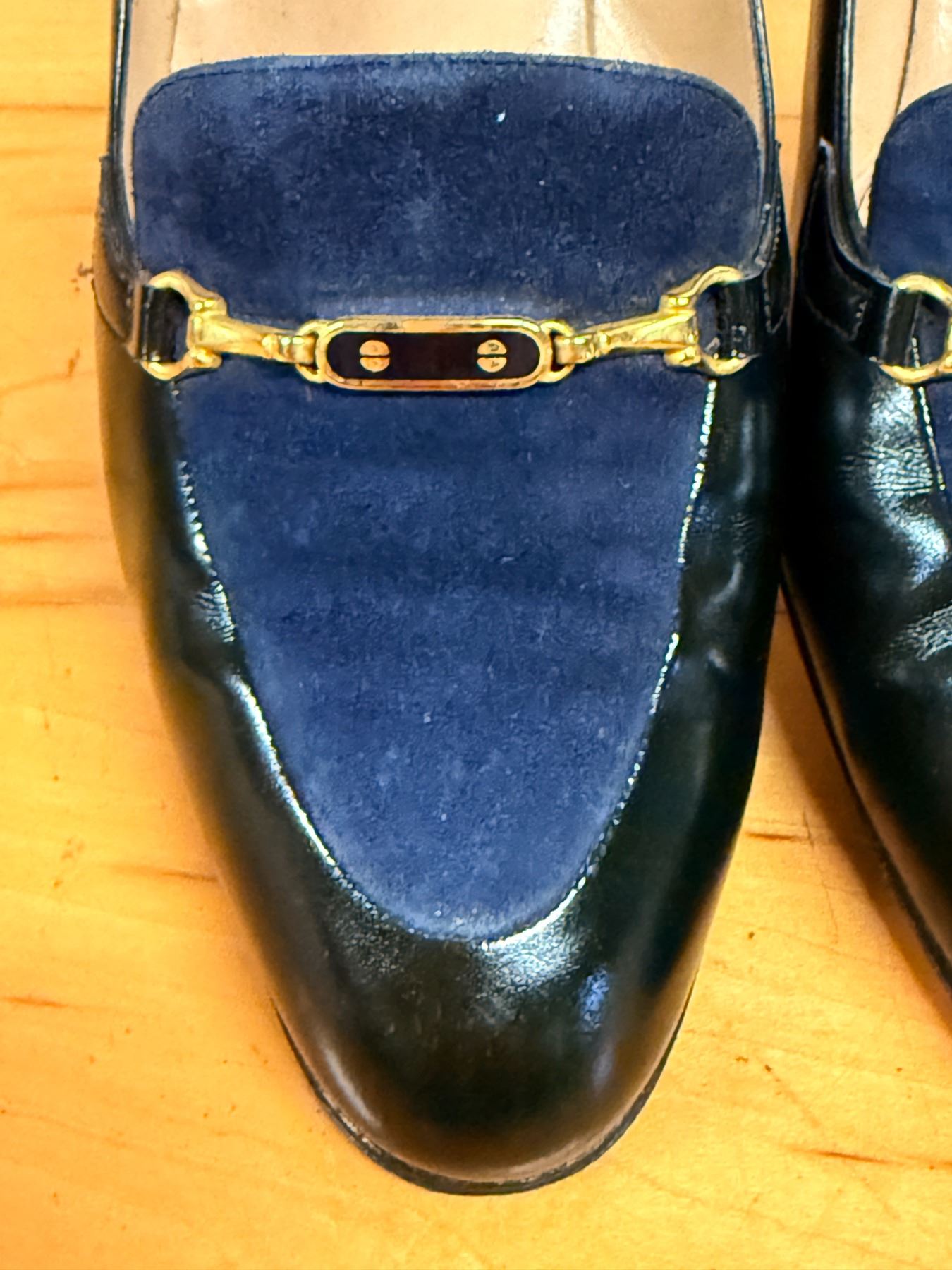 Sophisticated Bruno Magli loafers combining smooth black leather with plush navy suede uppers. Finished with gold horsebit hardware for a polished, timeless look. Lightly worn insoles from storage. A classic Italian-made style perfect for elevated everyday wear.