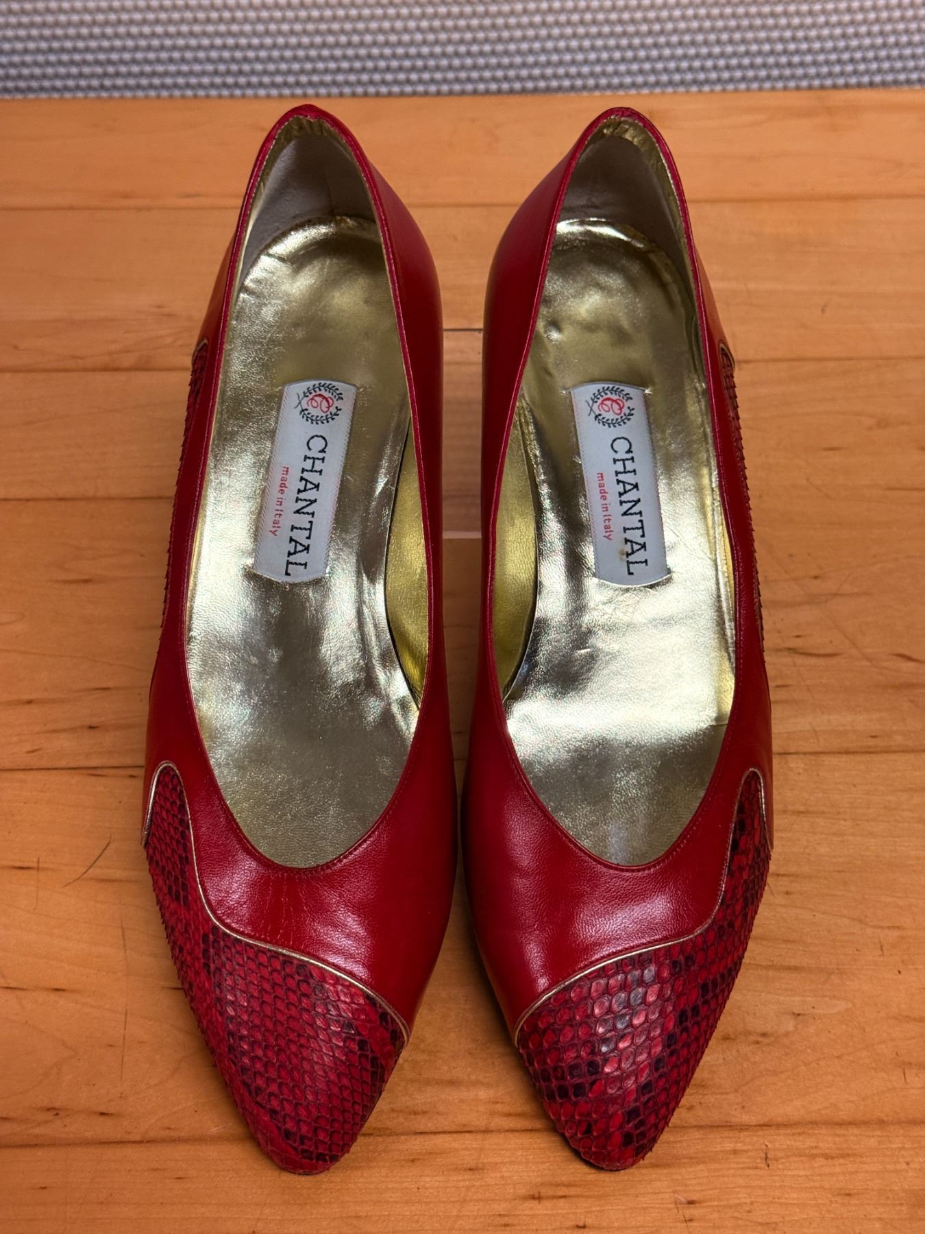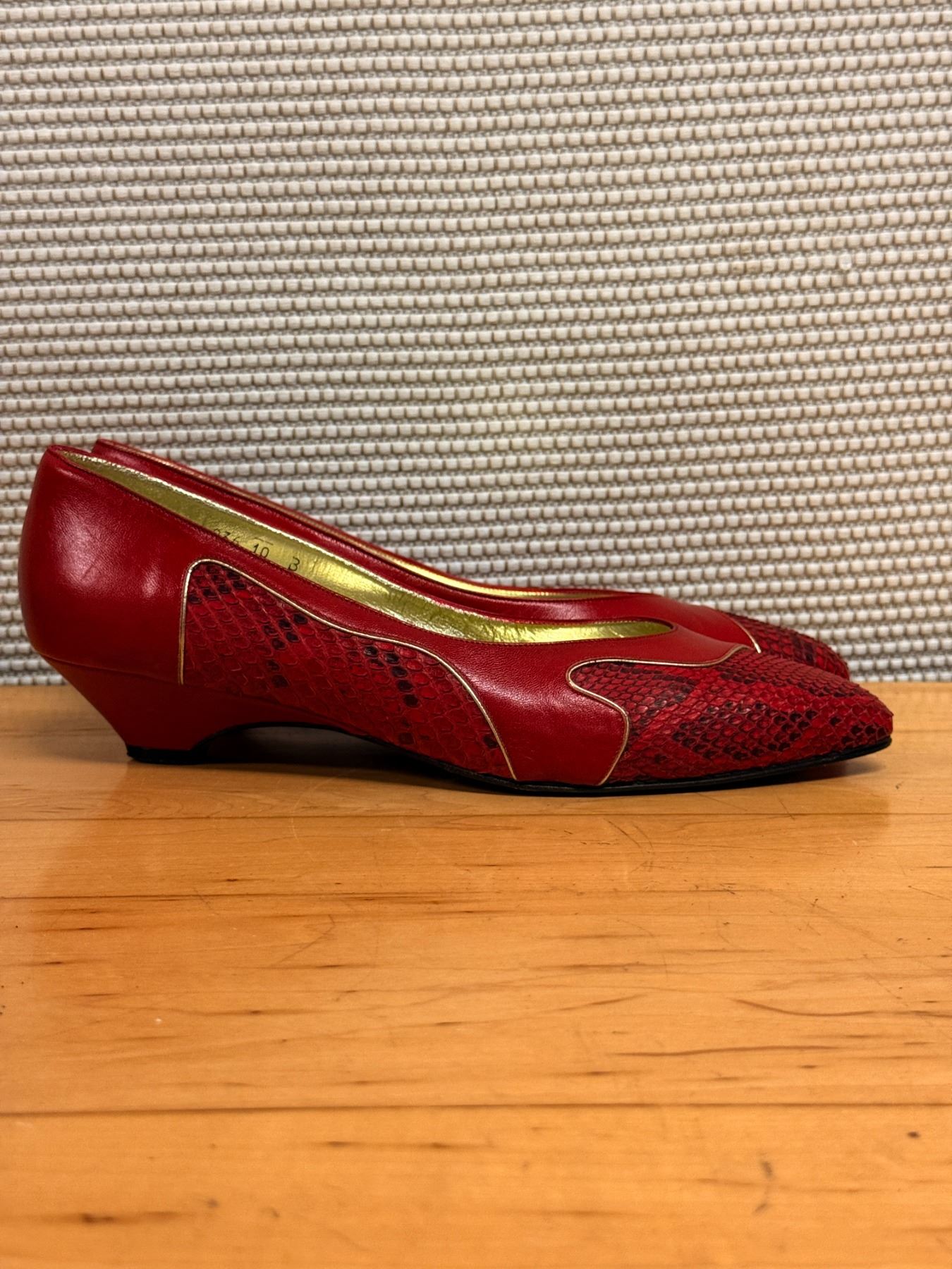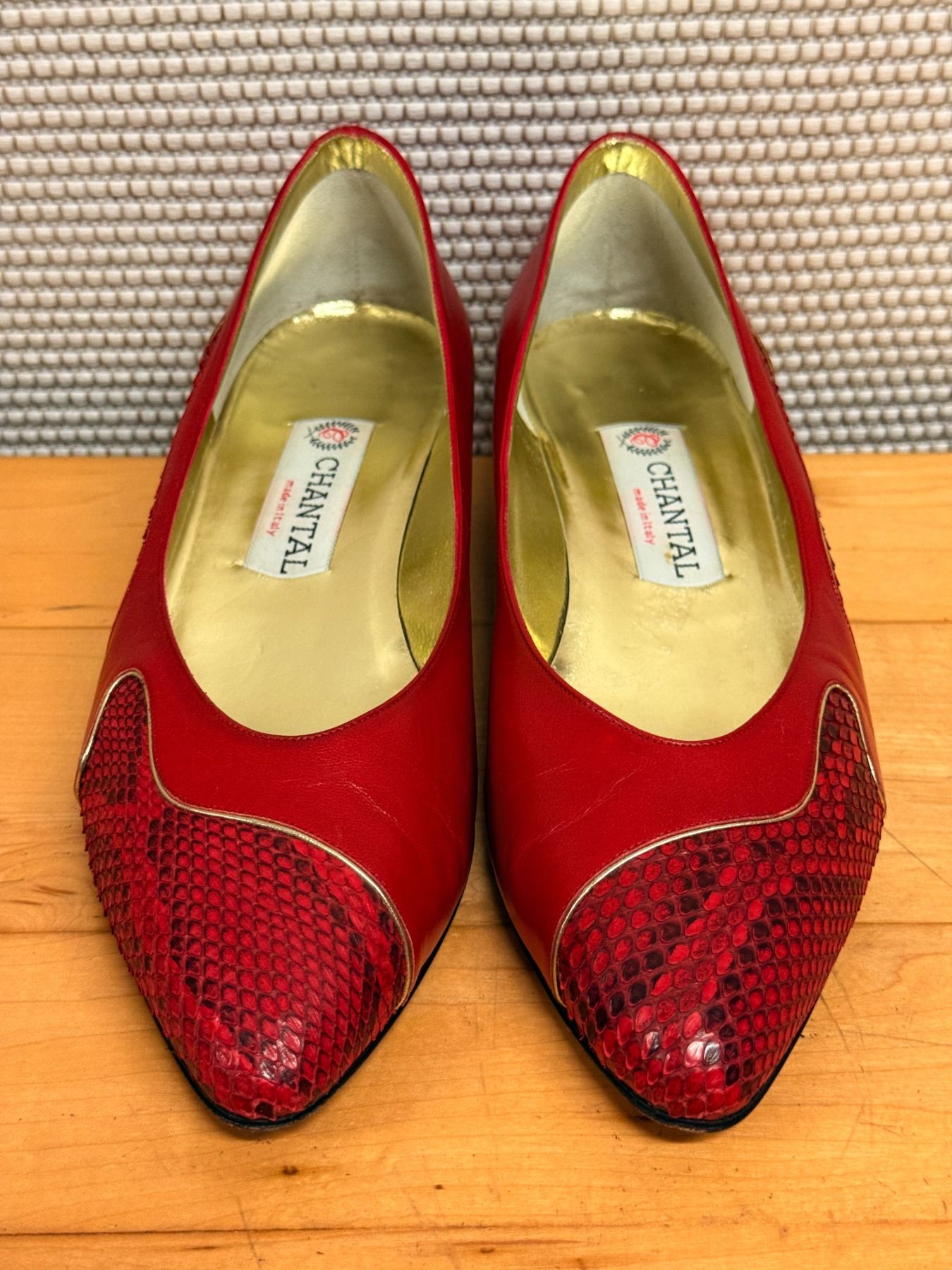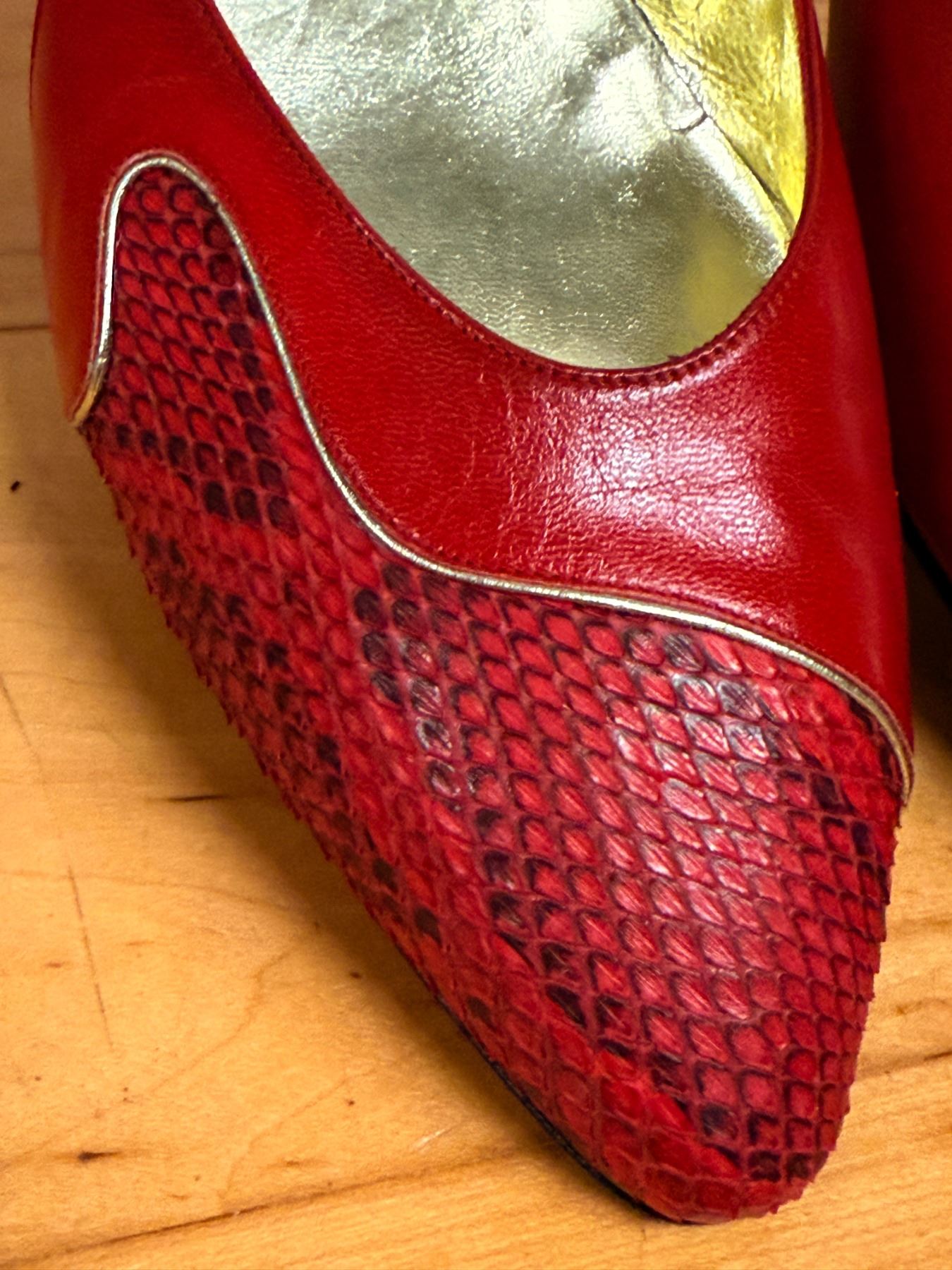 Striking Italian-made pumps featuring bold red leather with matching snakeskin toe detail and gold trim. Unique, elegant, and full of vintage flair.