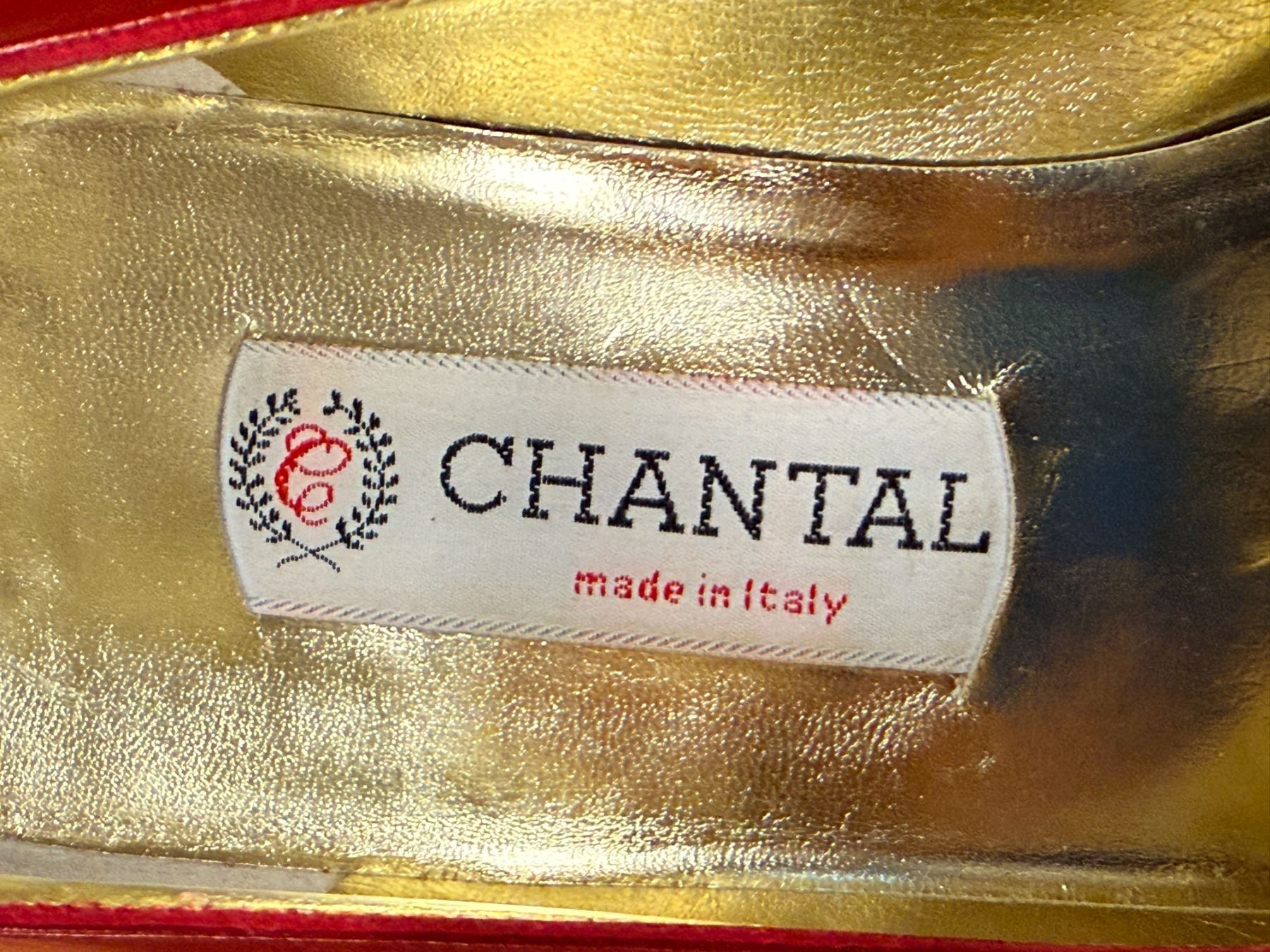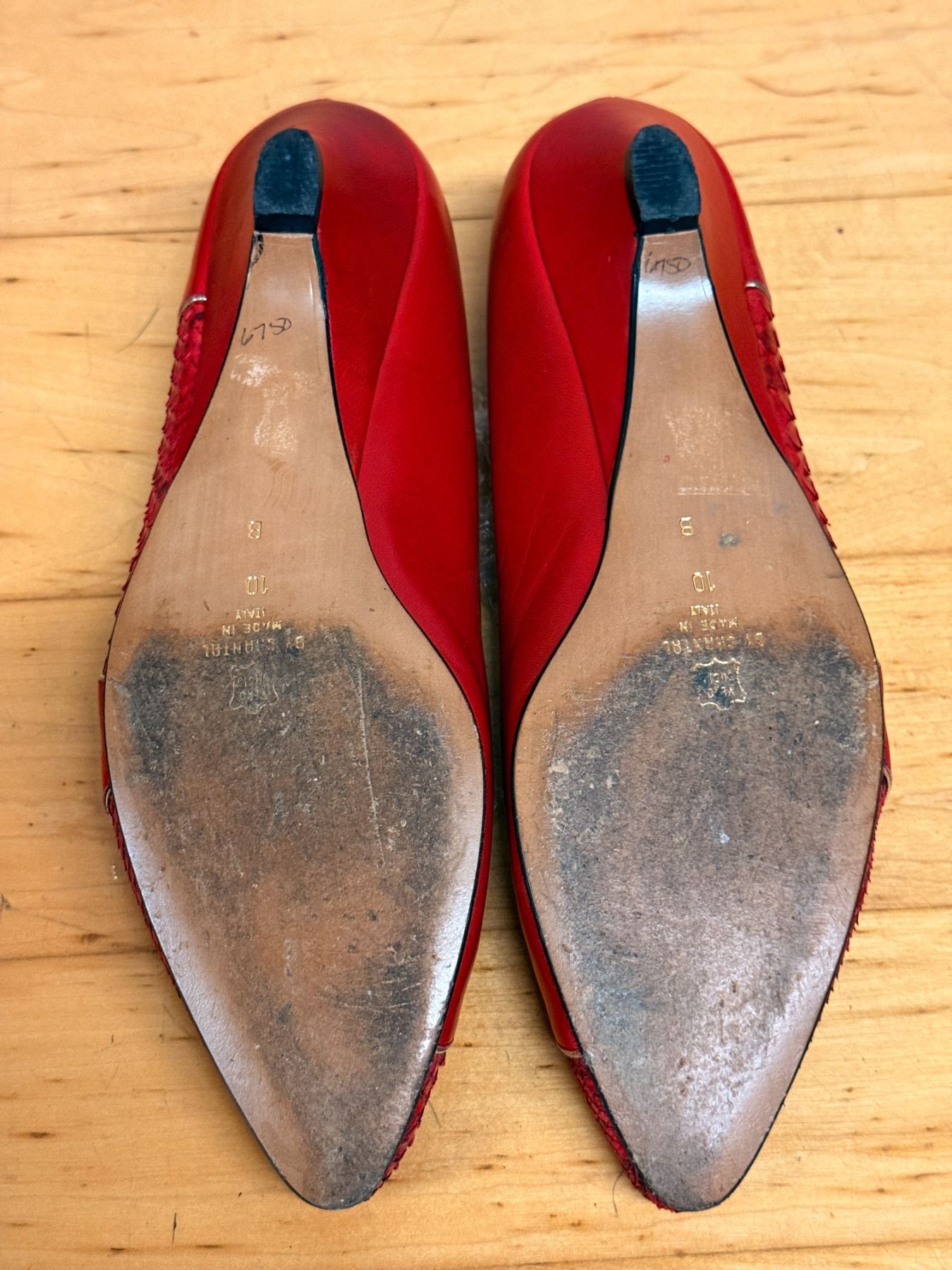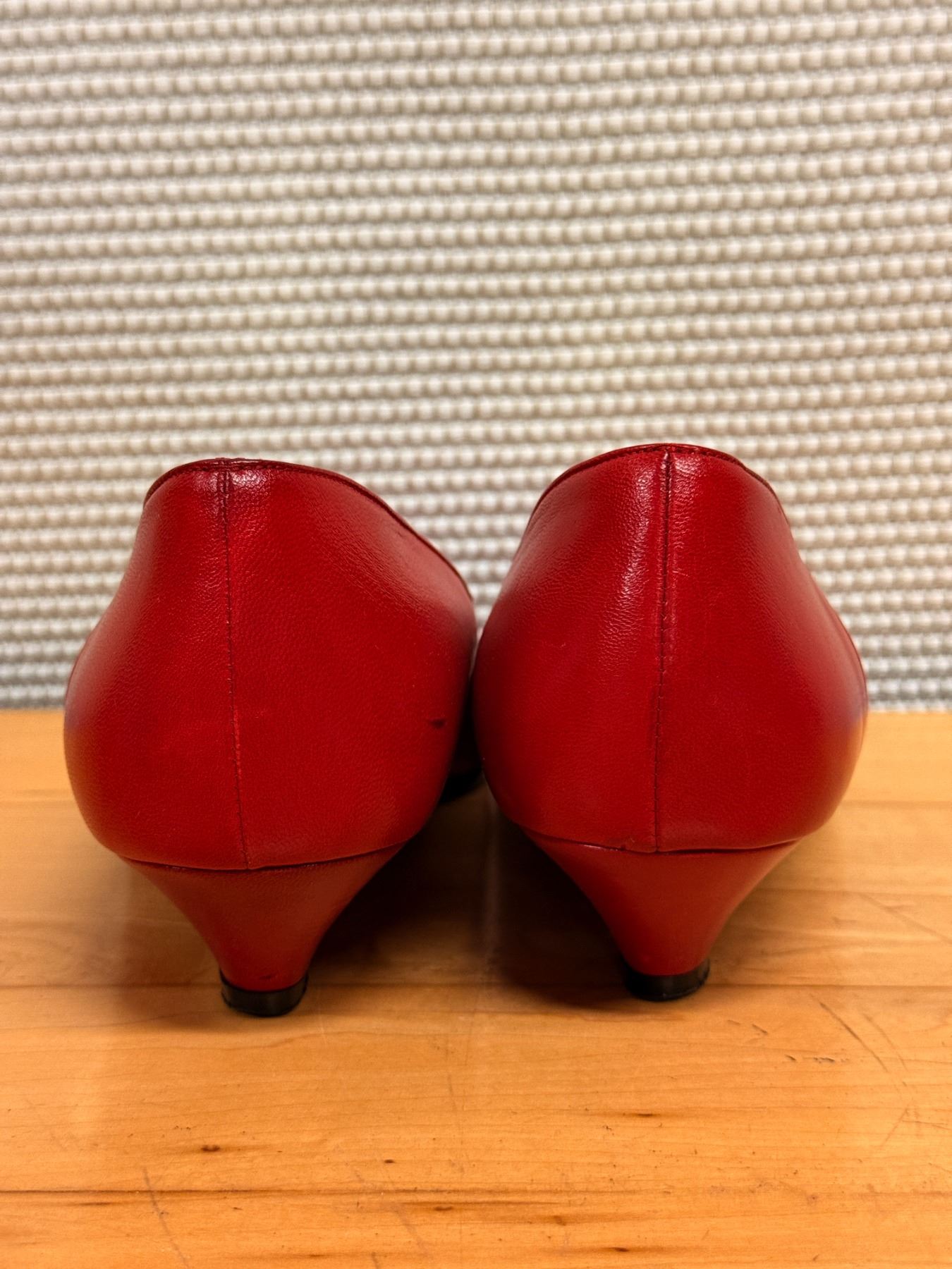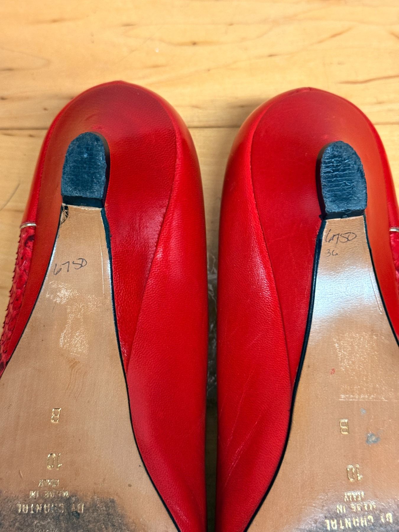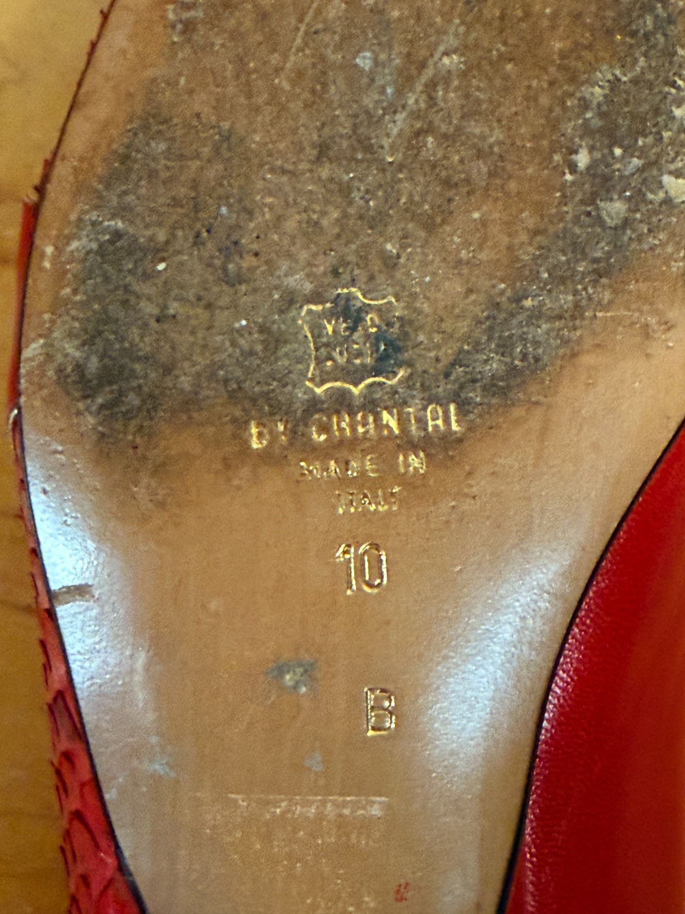 Striking Italian-made pumps featuring bold red leather with matching snakeskin toe detail and gold trim. Unique, elegant, and full of vintage flair.