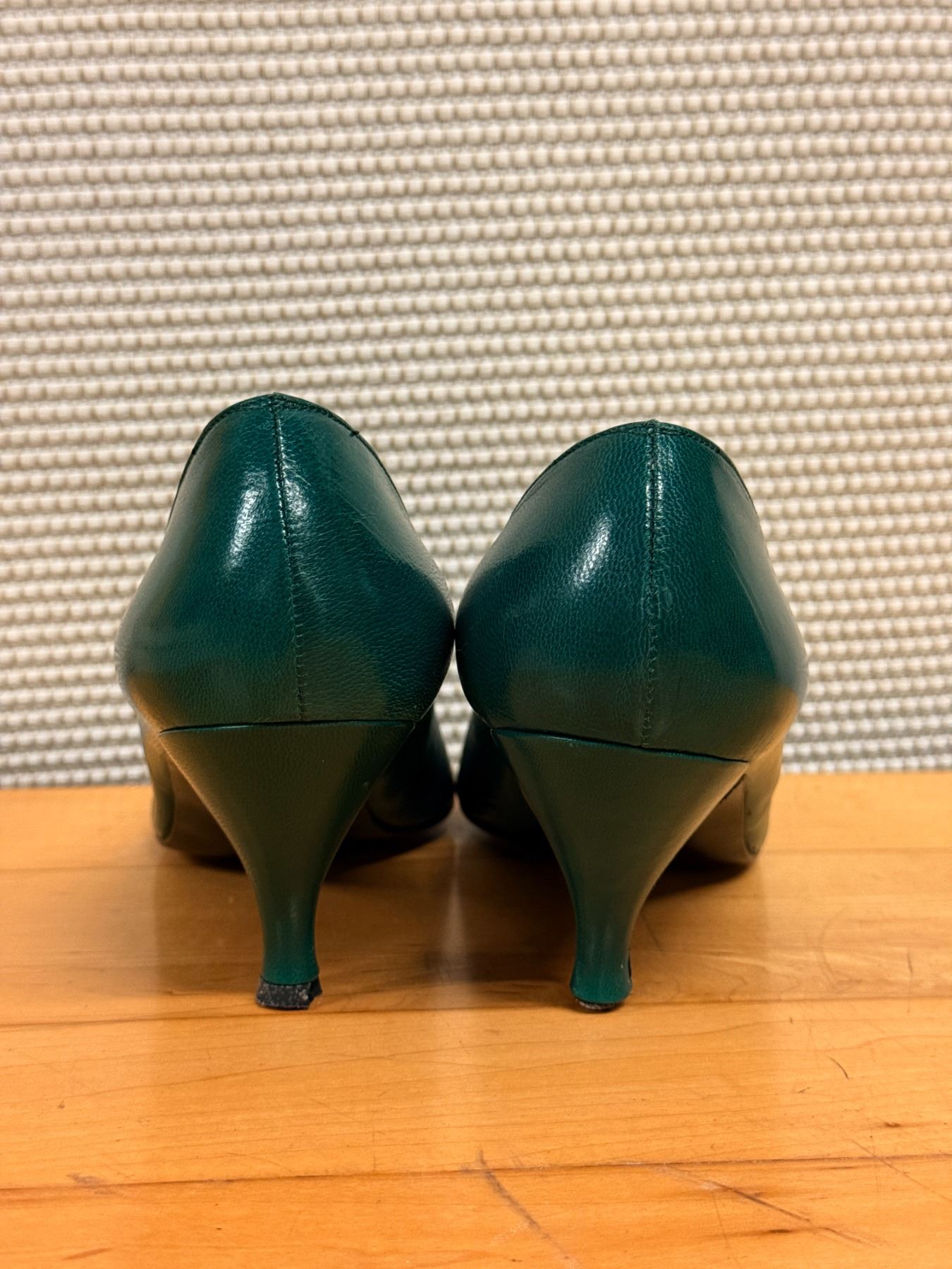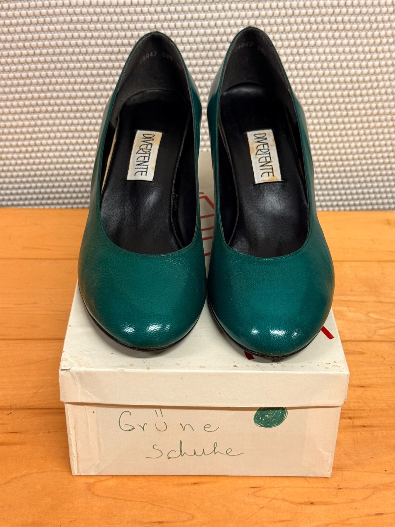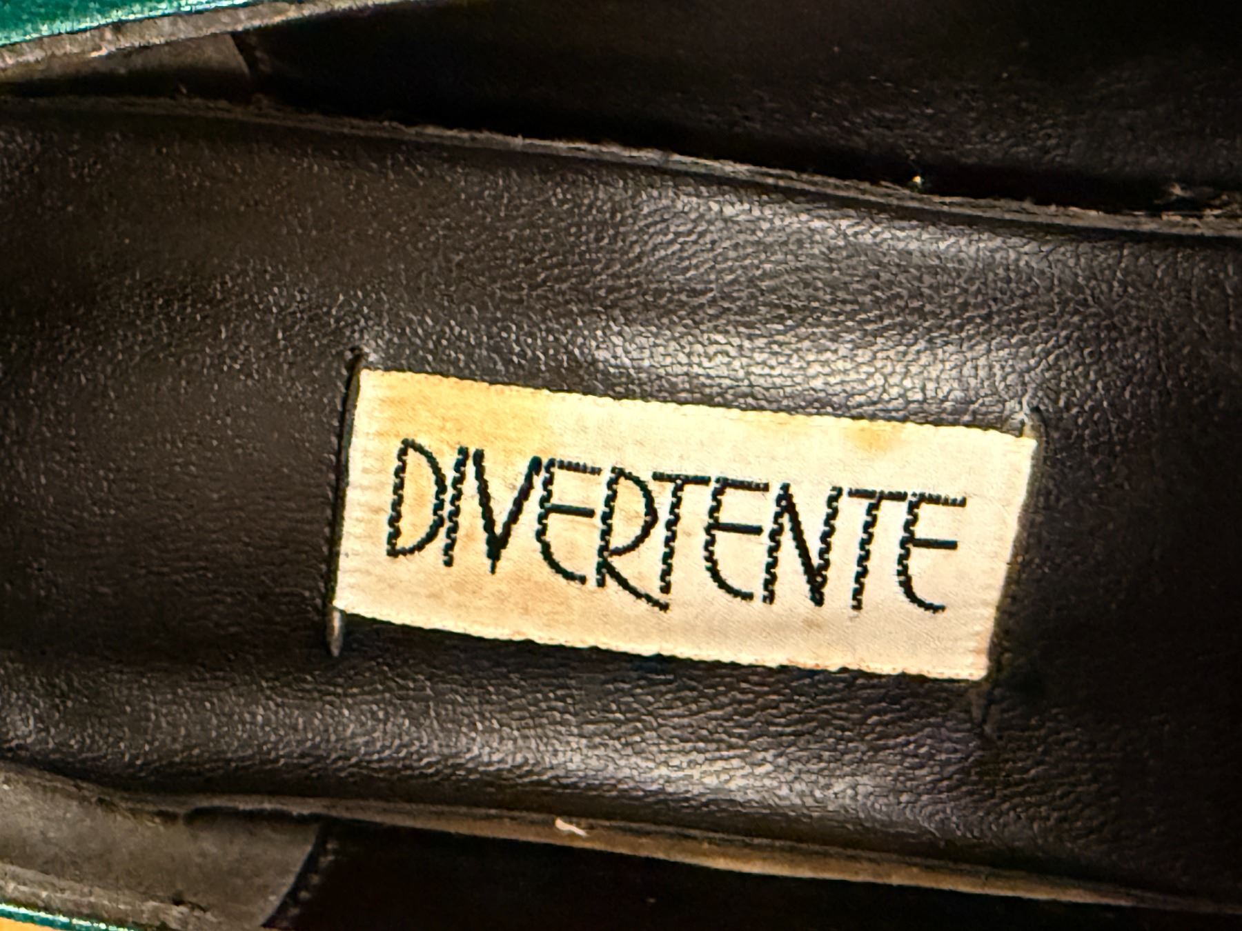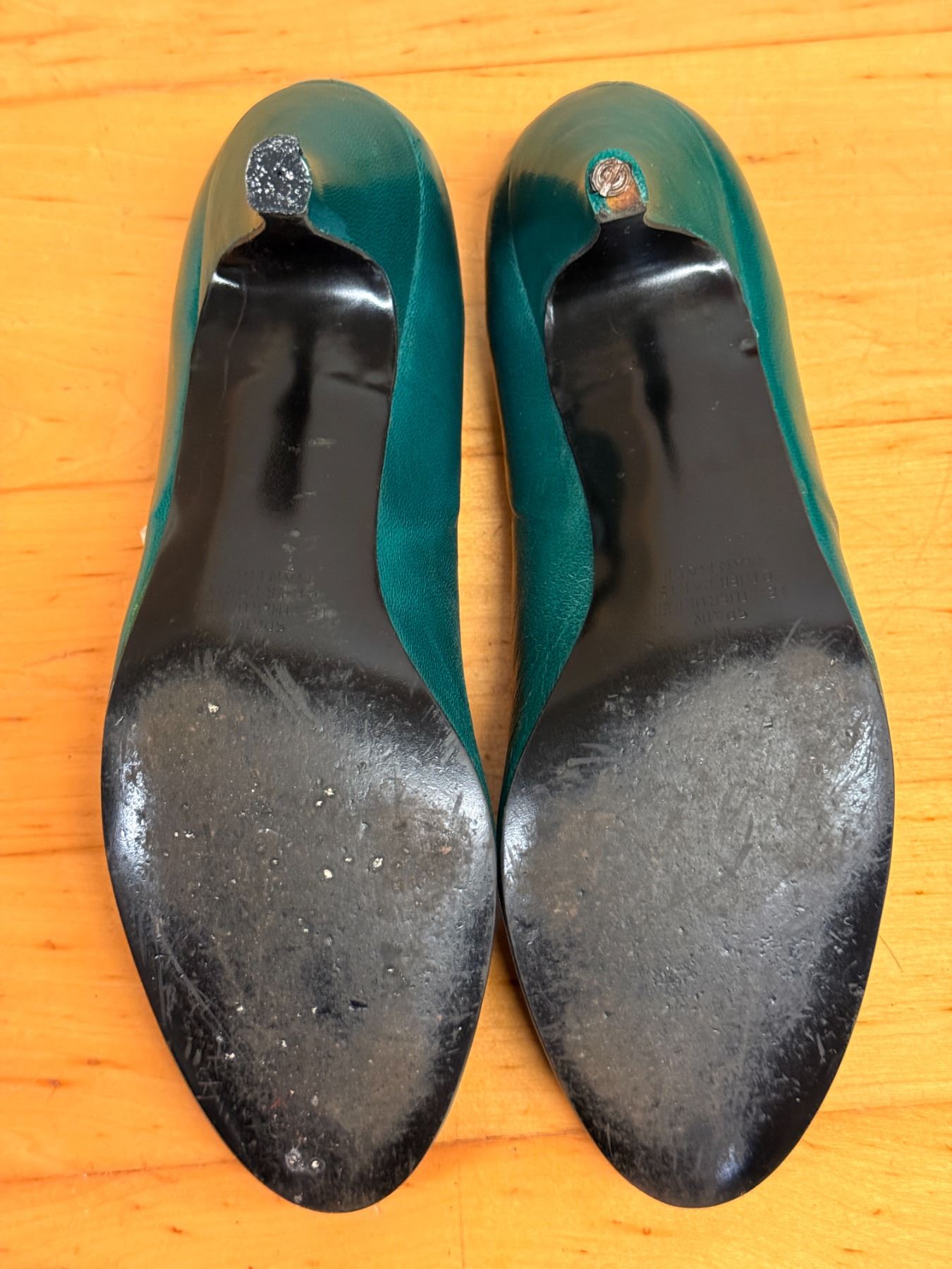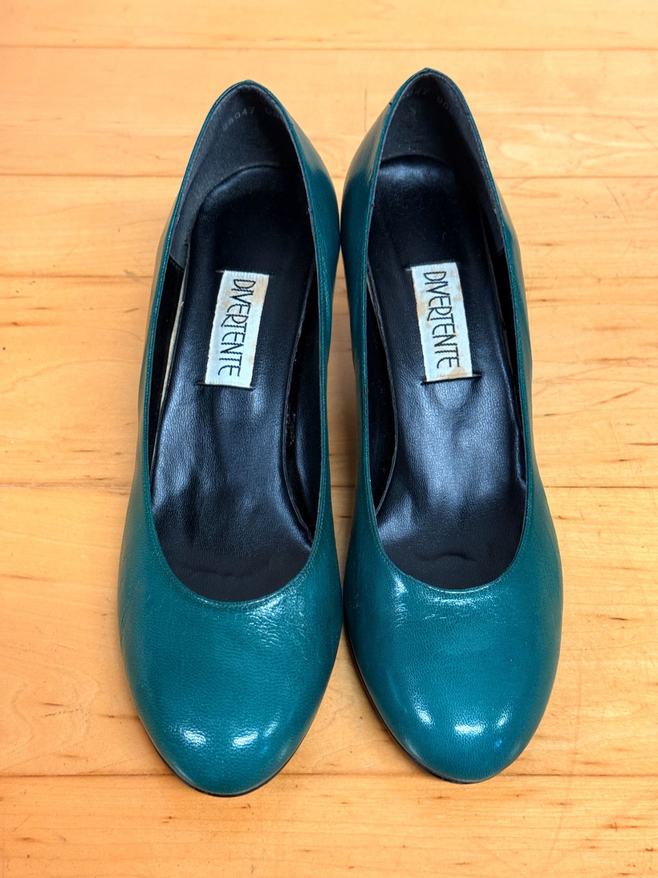 Stylish Diverente pumps in rich teal leather with a smooth round toe and sleek silhouette. Features a comfortable slip-on design, black leather lining, and a timeless shape perfect for work or dressy looks. Light wear.