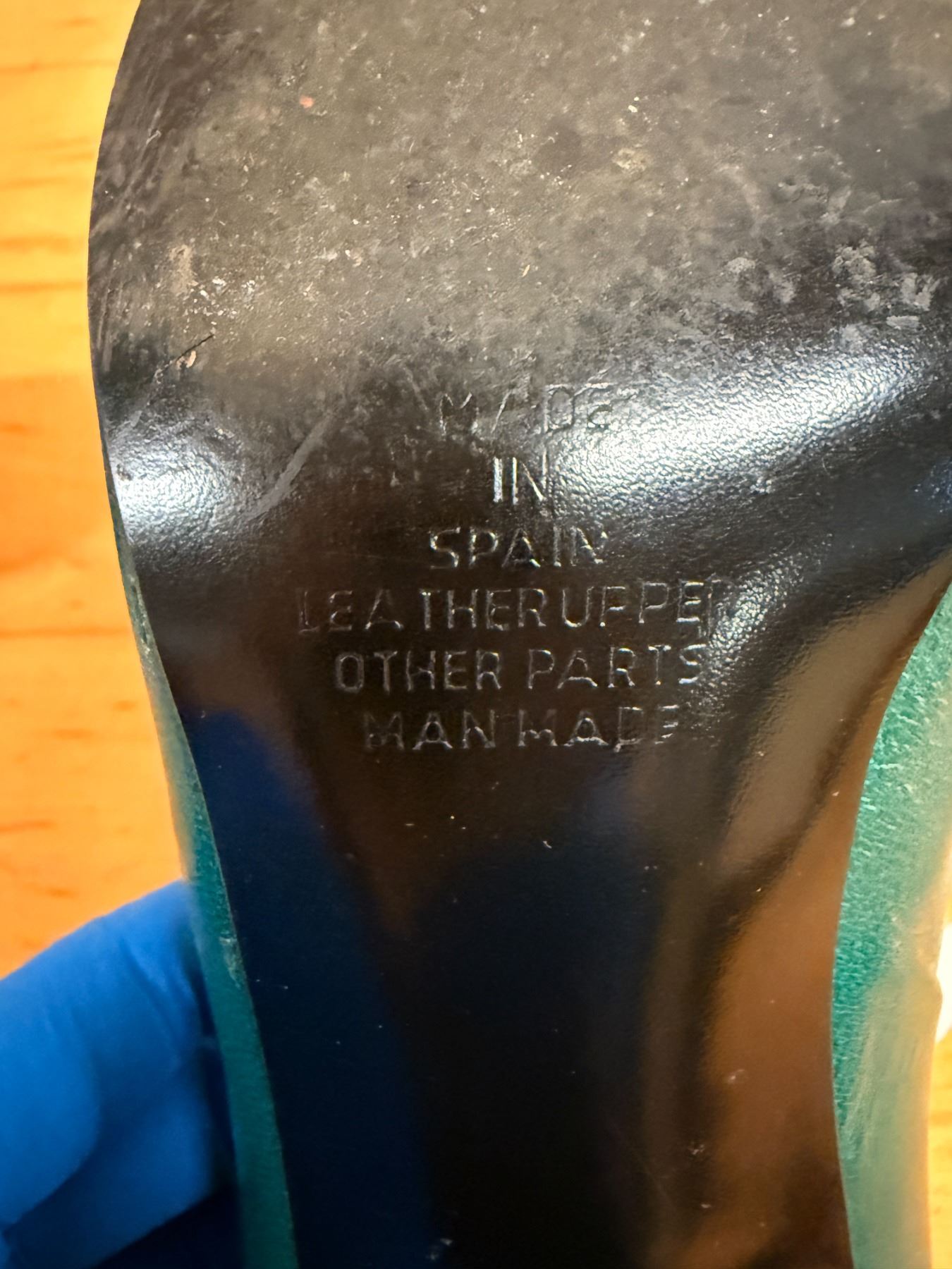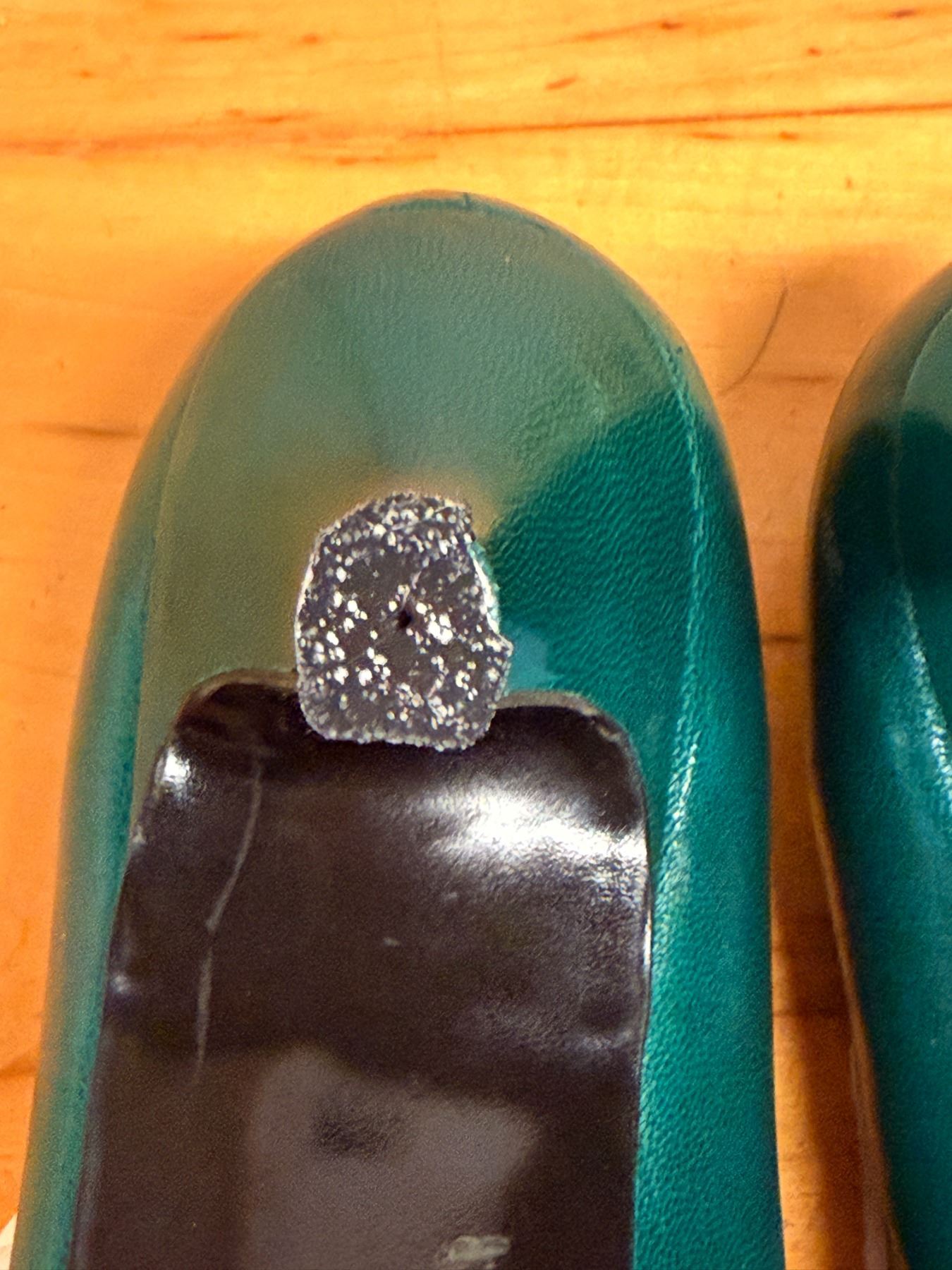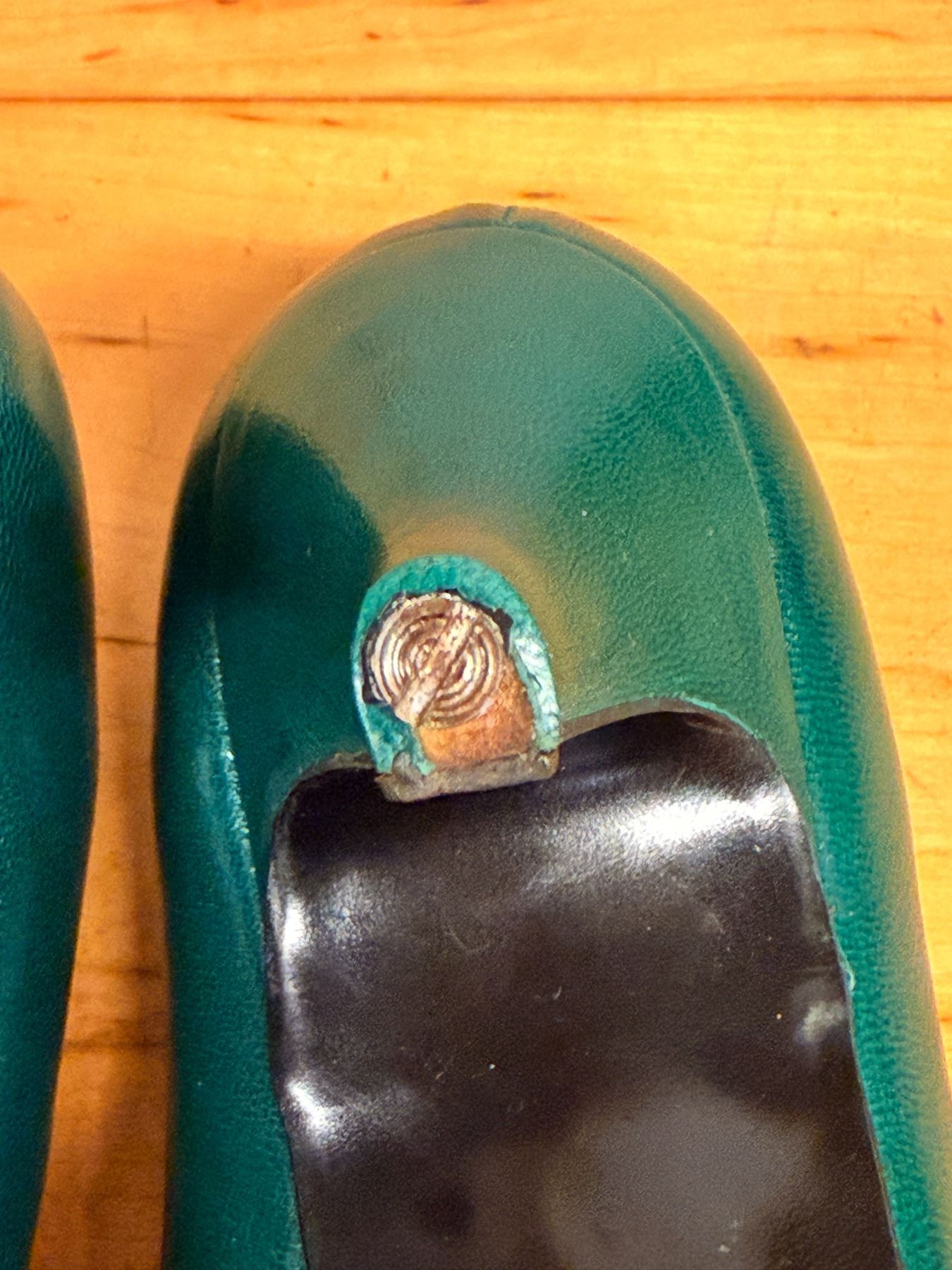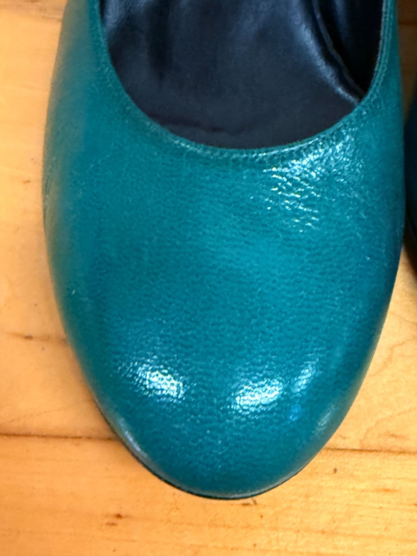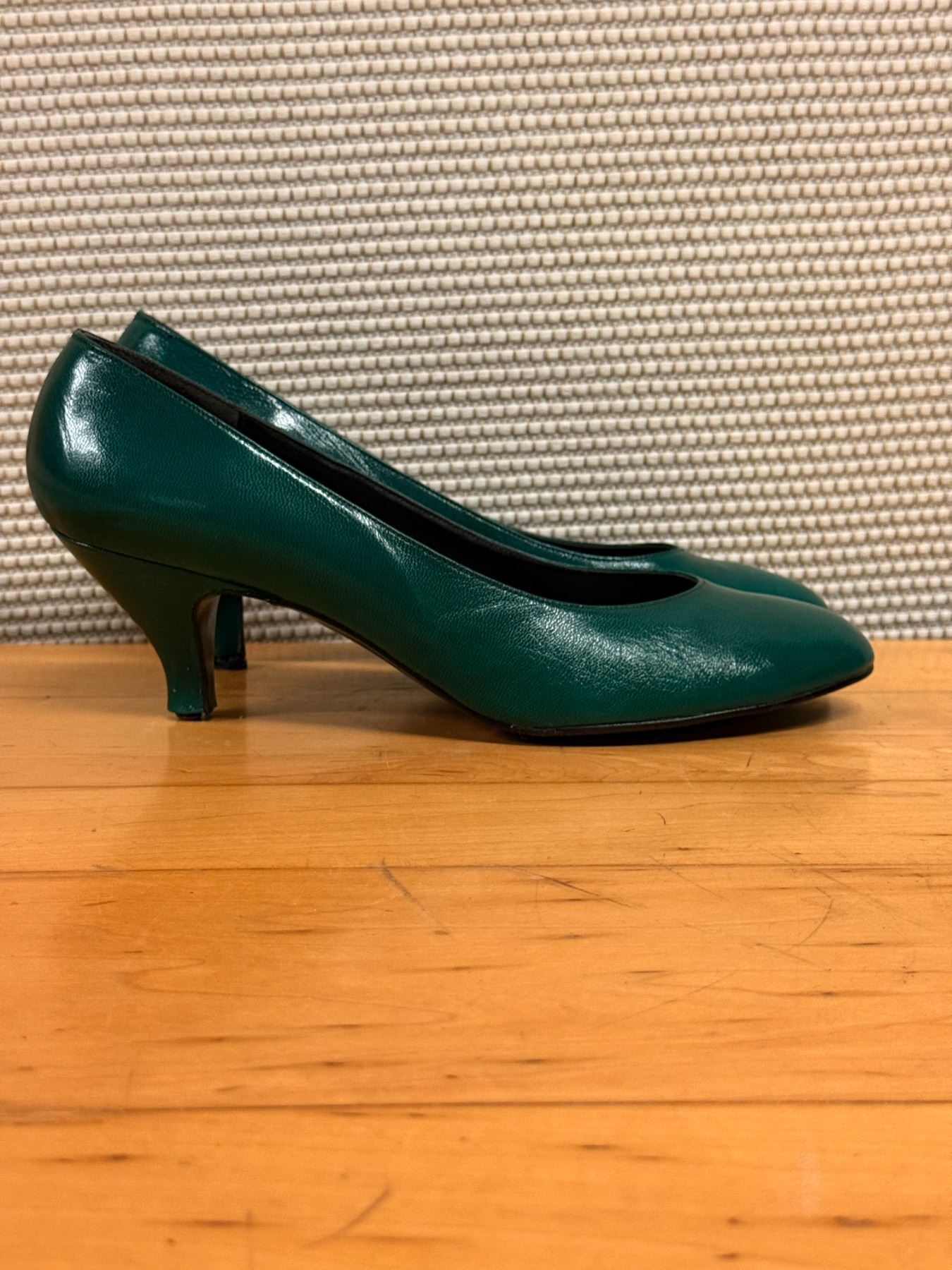 Stylish Diverente pumps in rich teal leather with a smooth round toe and sleek silhouette. Features a comfortable slip-on design, black leather lining, and a timeless shape perfect for work or dressy looks. Light wear.